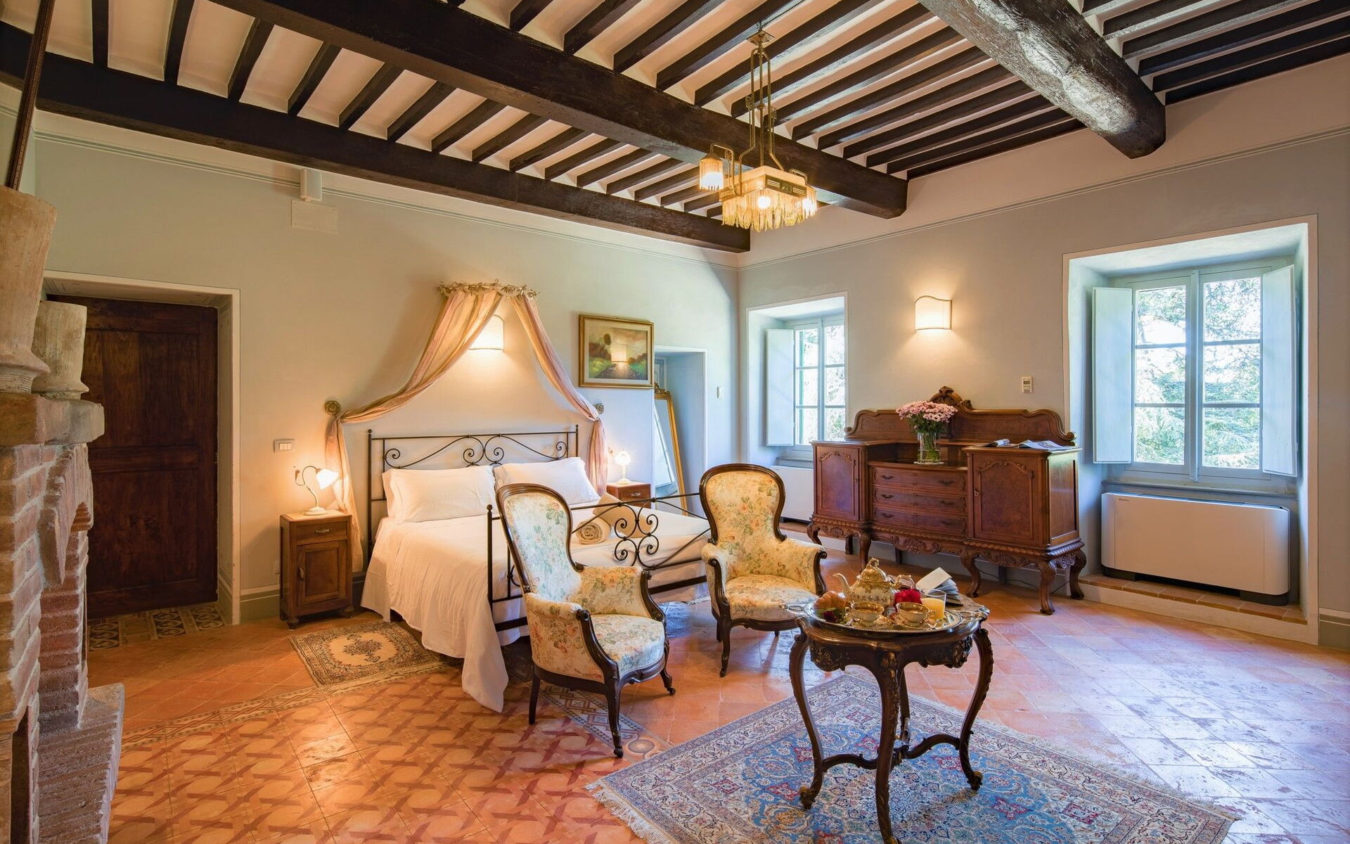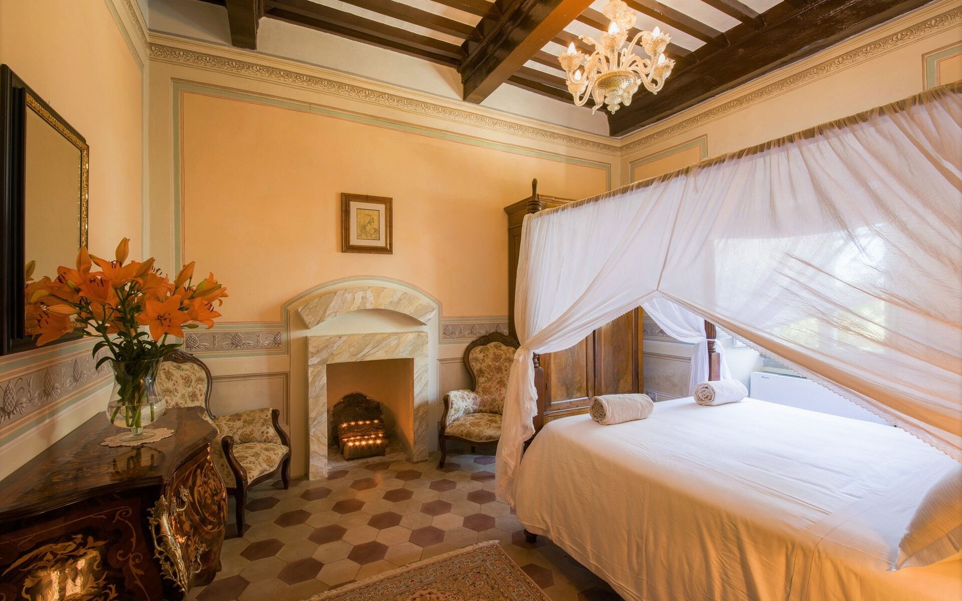 Bedroom + Ensuite Bathroom 3: king size bed, WIFI internet, internet, air conditioning, mosquito net, satellite tv, television, two armchairs, fireplace, basin, toilet, bidet, shower, hairdryer.