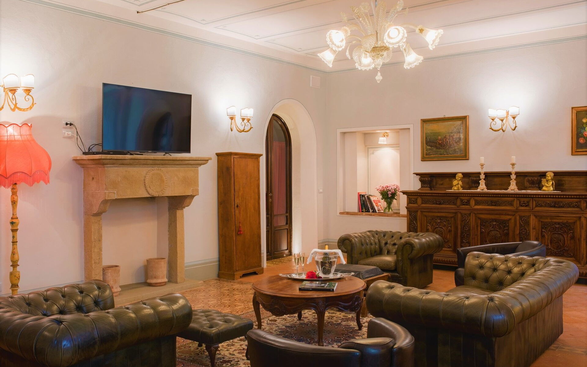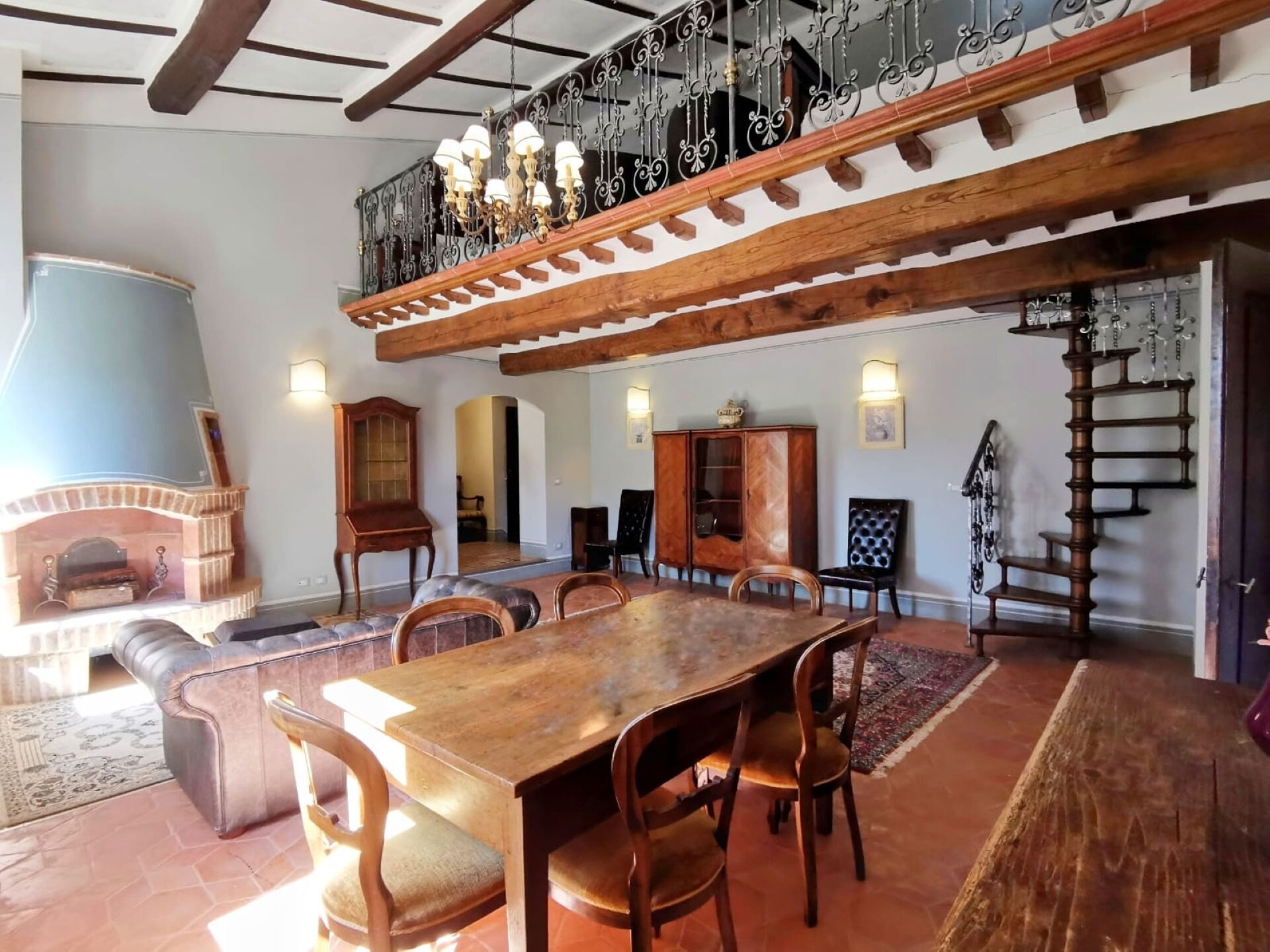 Living room: three armchairs, working desk, fireplace, dining table, WIFI internet, internet, air conditioning.