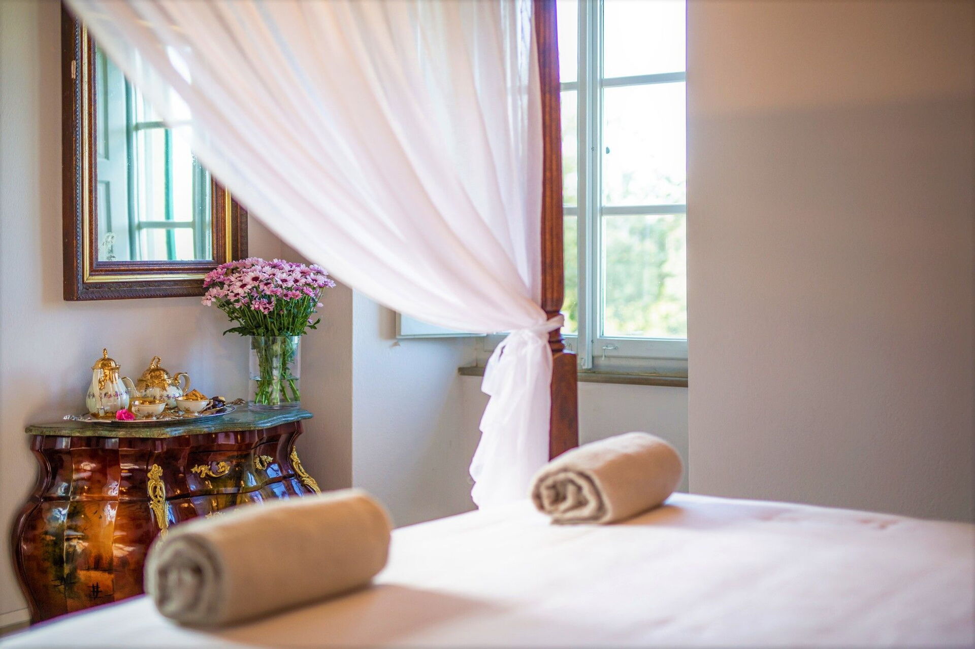 Bedroom + Ensuite Bathroom 2: king size bed (length: 190m, width: 180m), WIFI internet, internet, air conditioning, mosquito net, satellite tv, television, two armchairs, fireplace, basin, toilet, bidet, bathtub, shower, hairdryer.