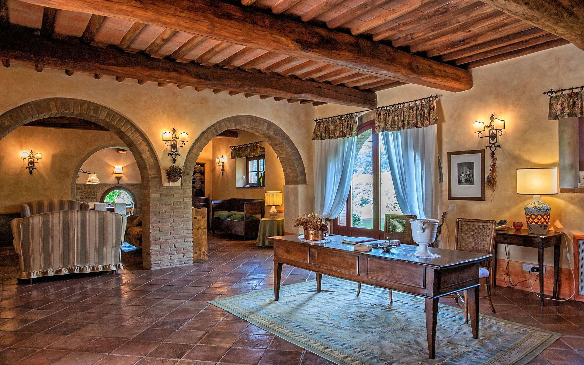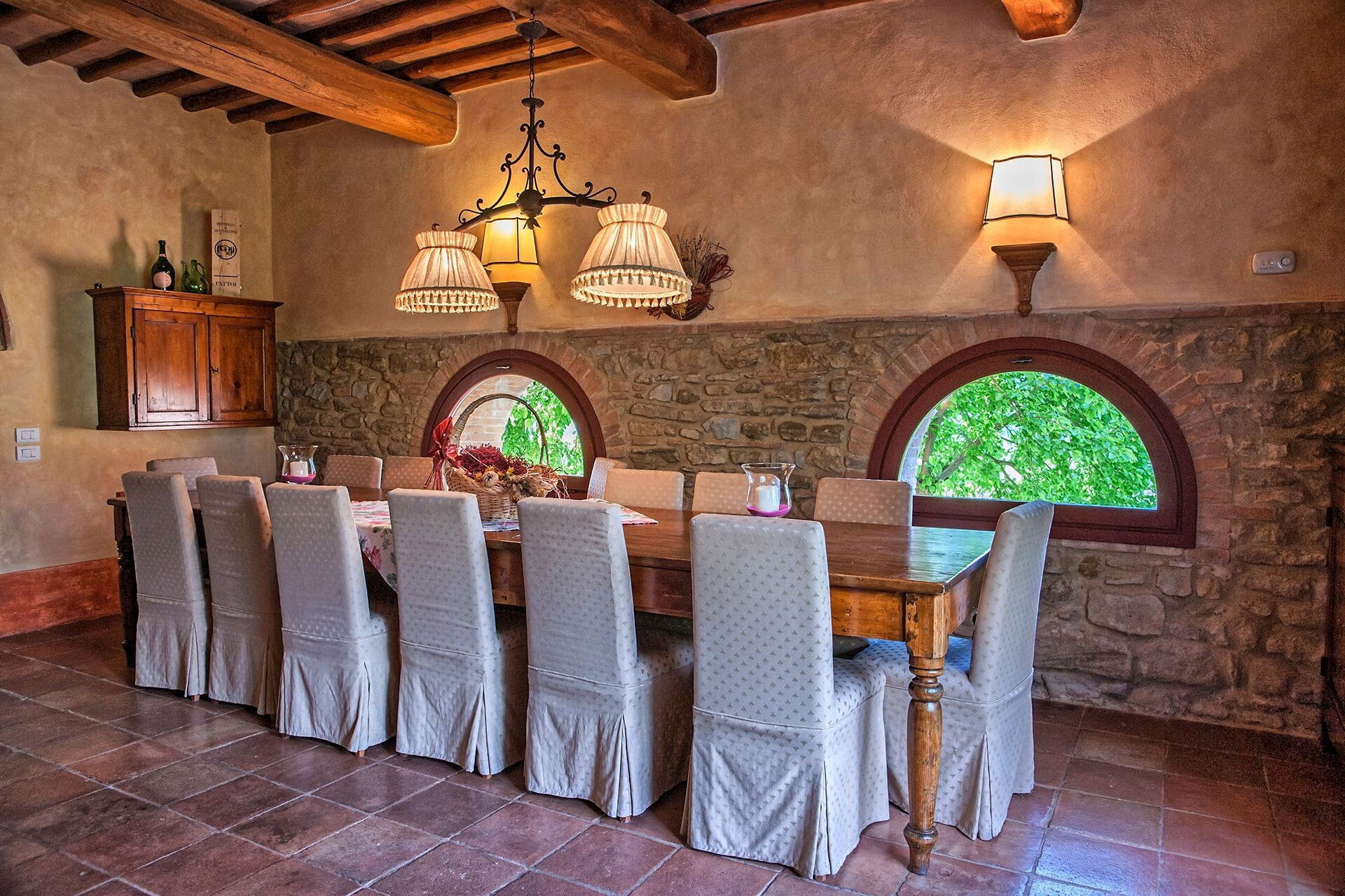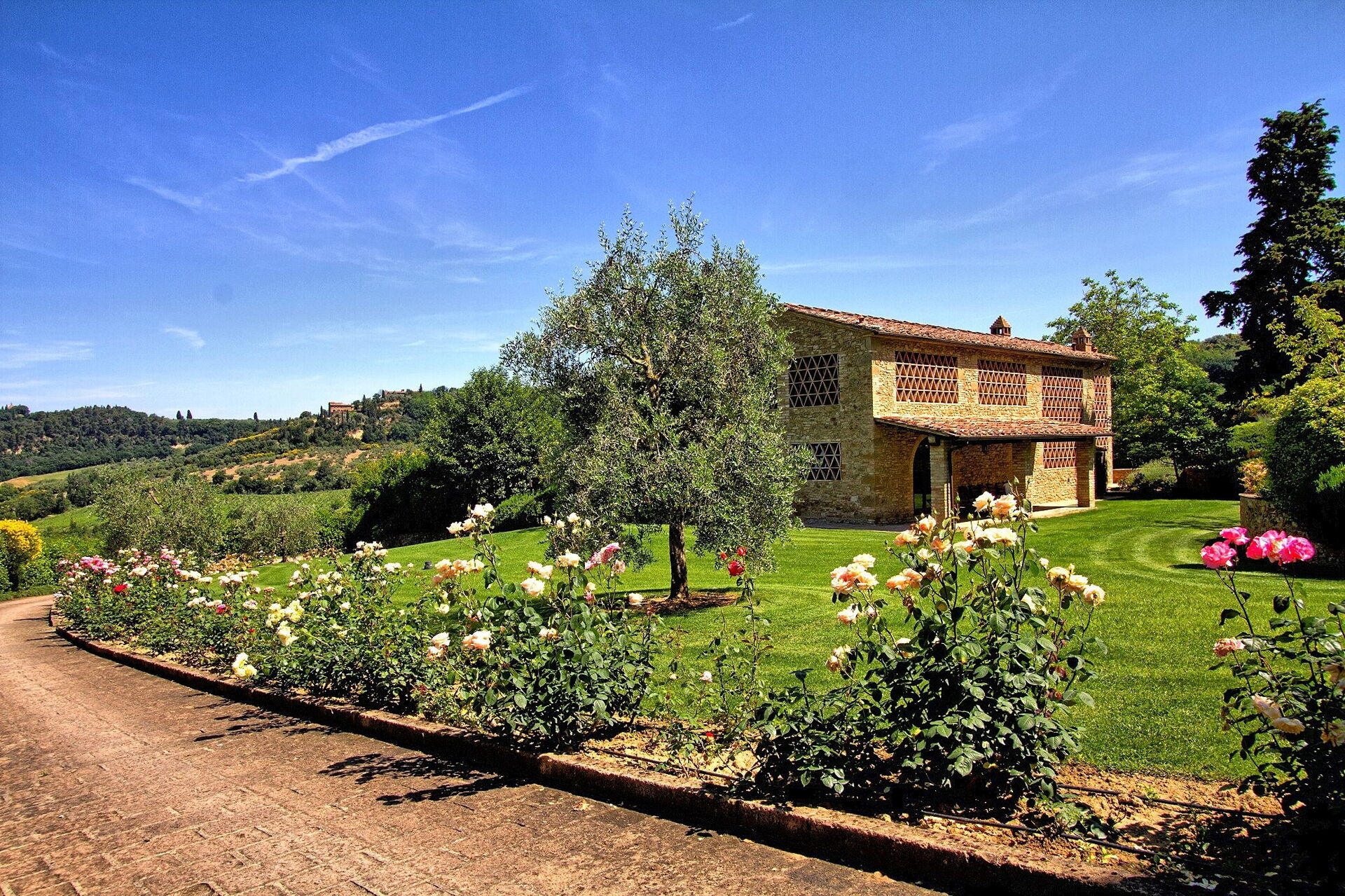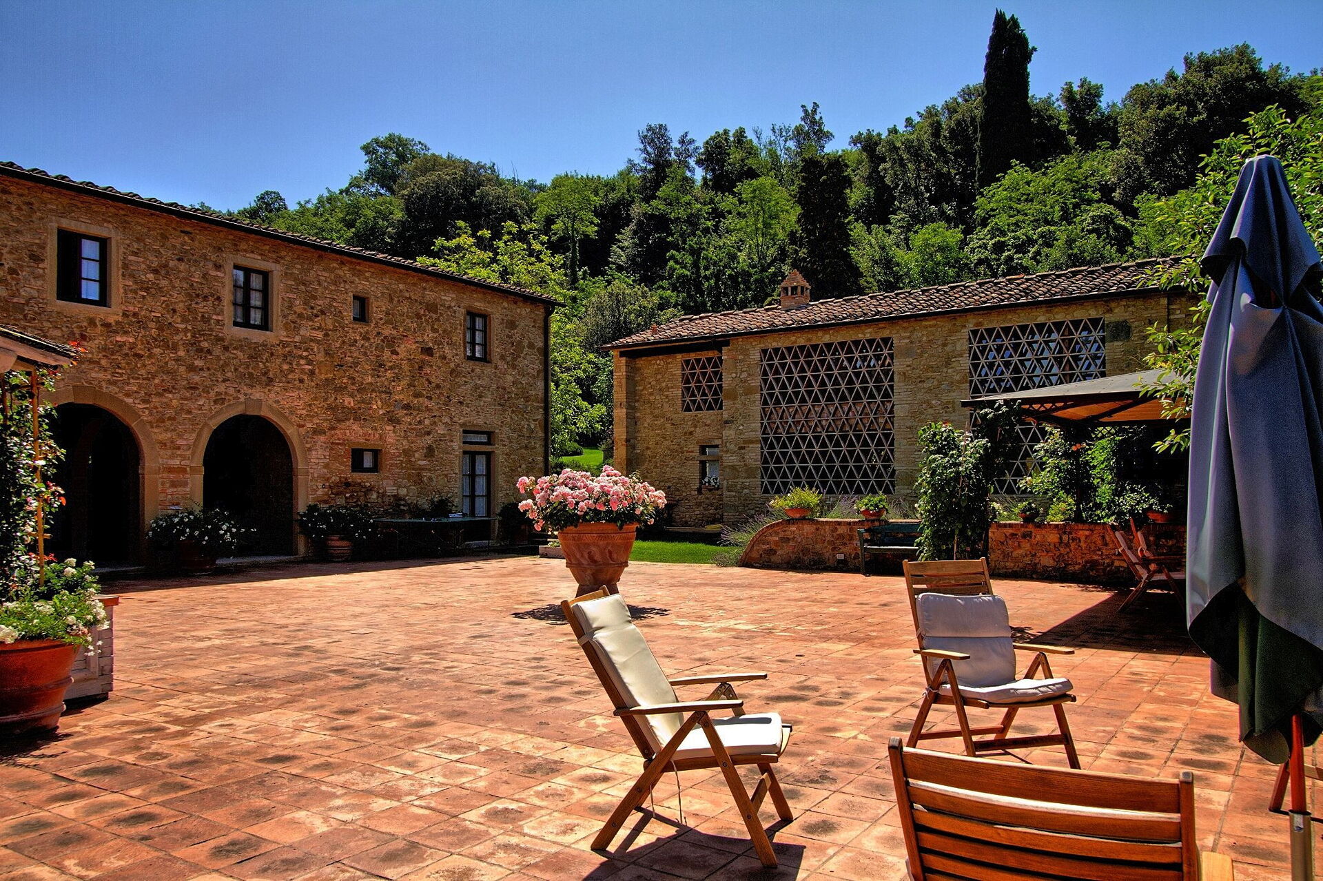 Beautiful private villa with swimming-pool situated in panoramic location on the Tuscan hills, between Florence and Siena. This splendid property has been recently restored preserving its original architectural features and has been turned into an elegant villa sleeping up to 16 people and an adjoining outbuilding for 8 people (rentable upon request only together with the main villa) allowing a total number of 24 guests. Both the villa and the outbuilding are tastefully furnished and offer spacious and extremely comfortable interiors.