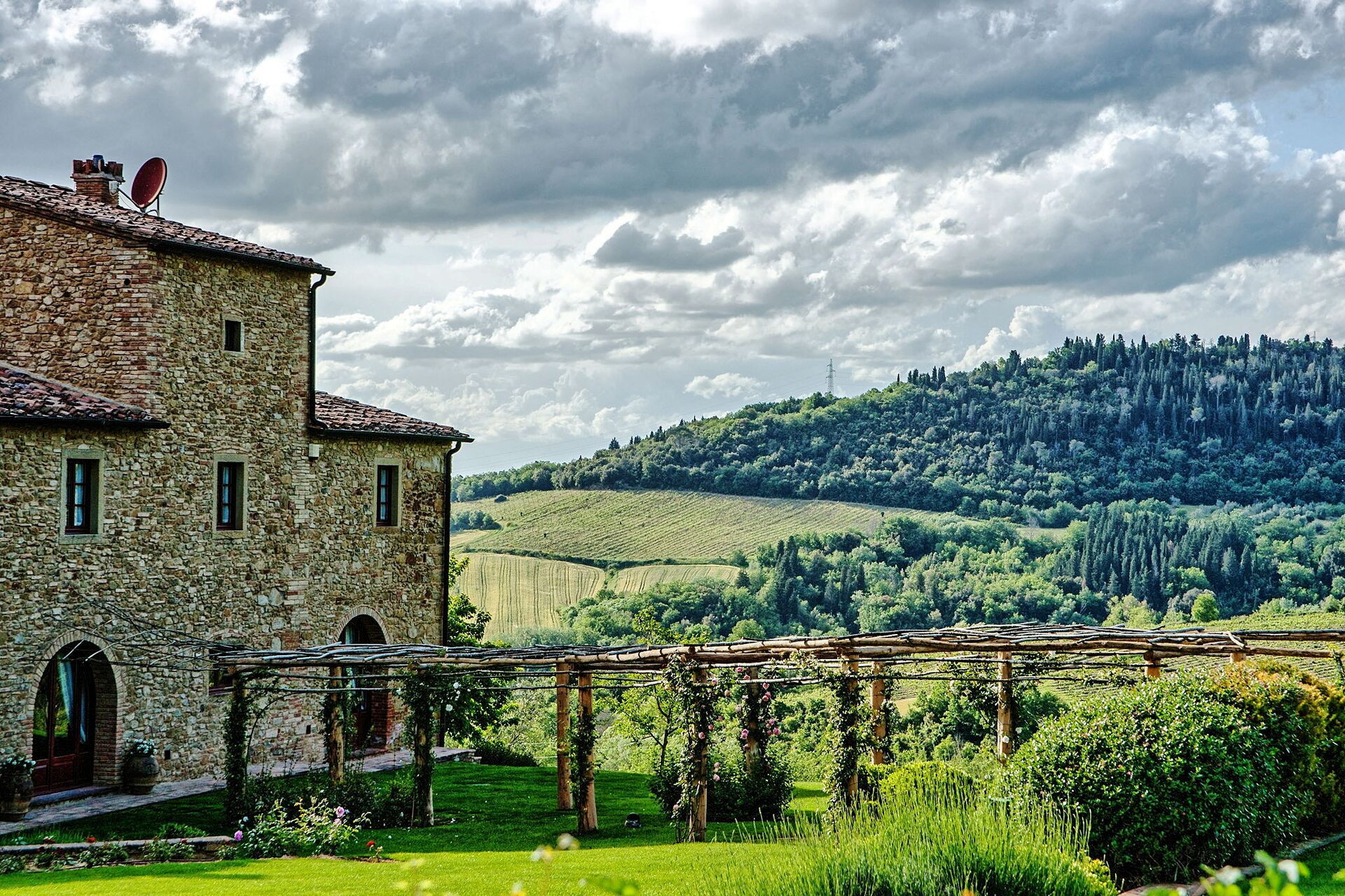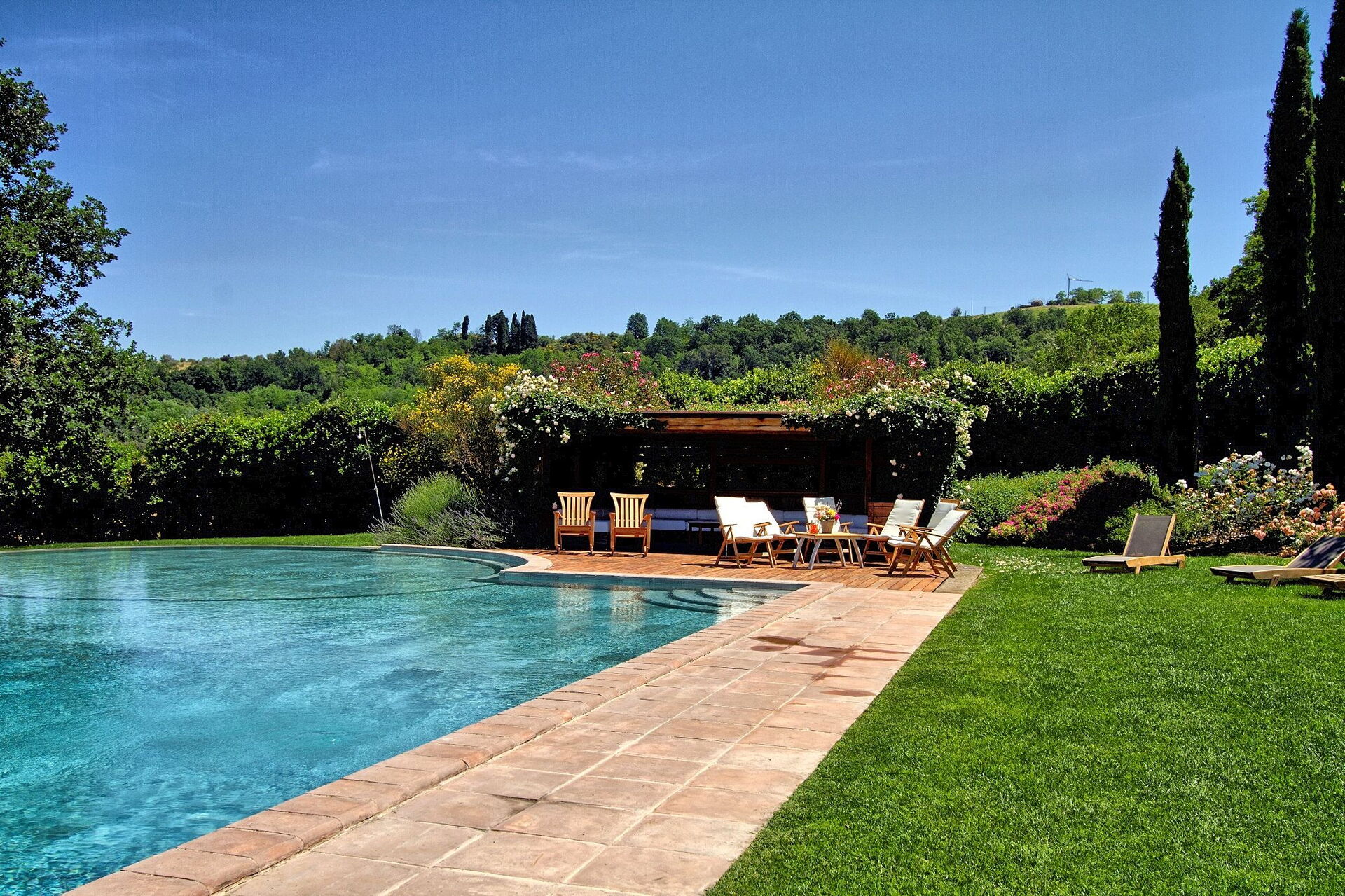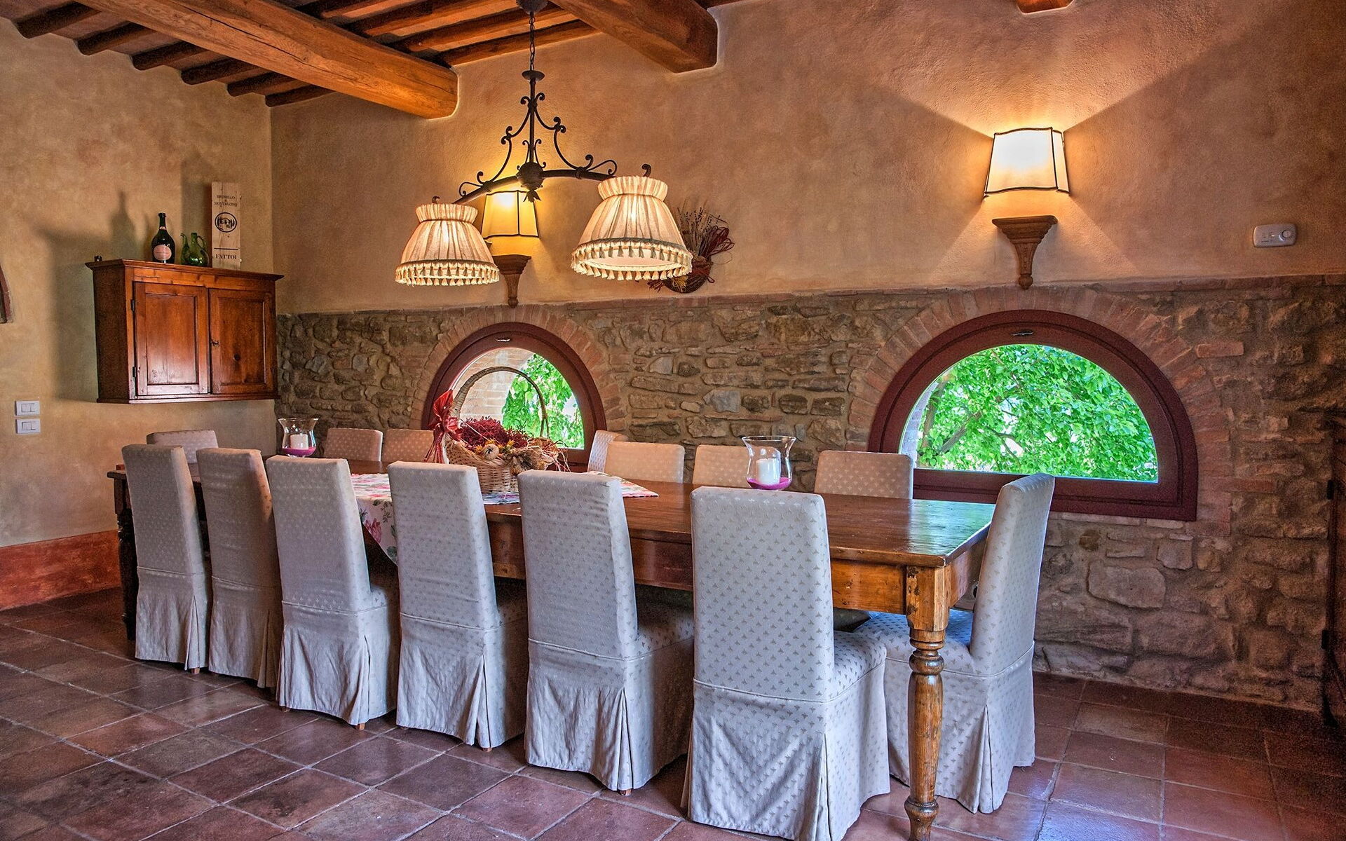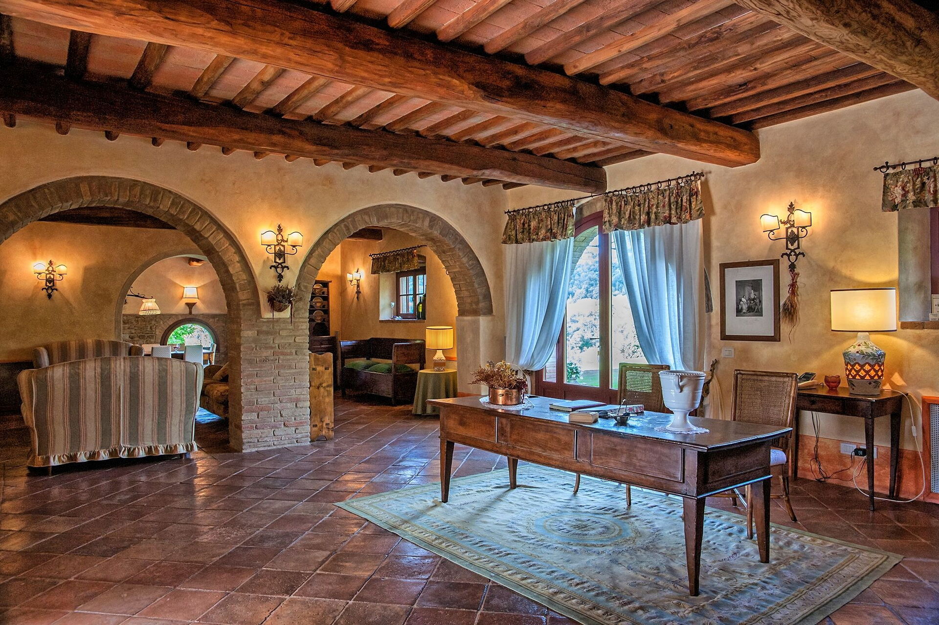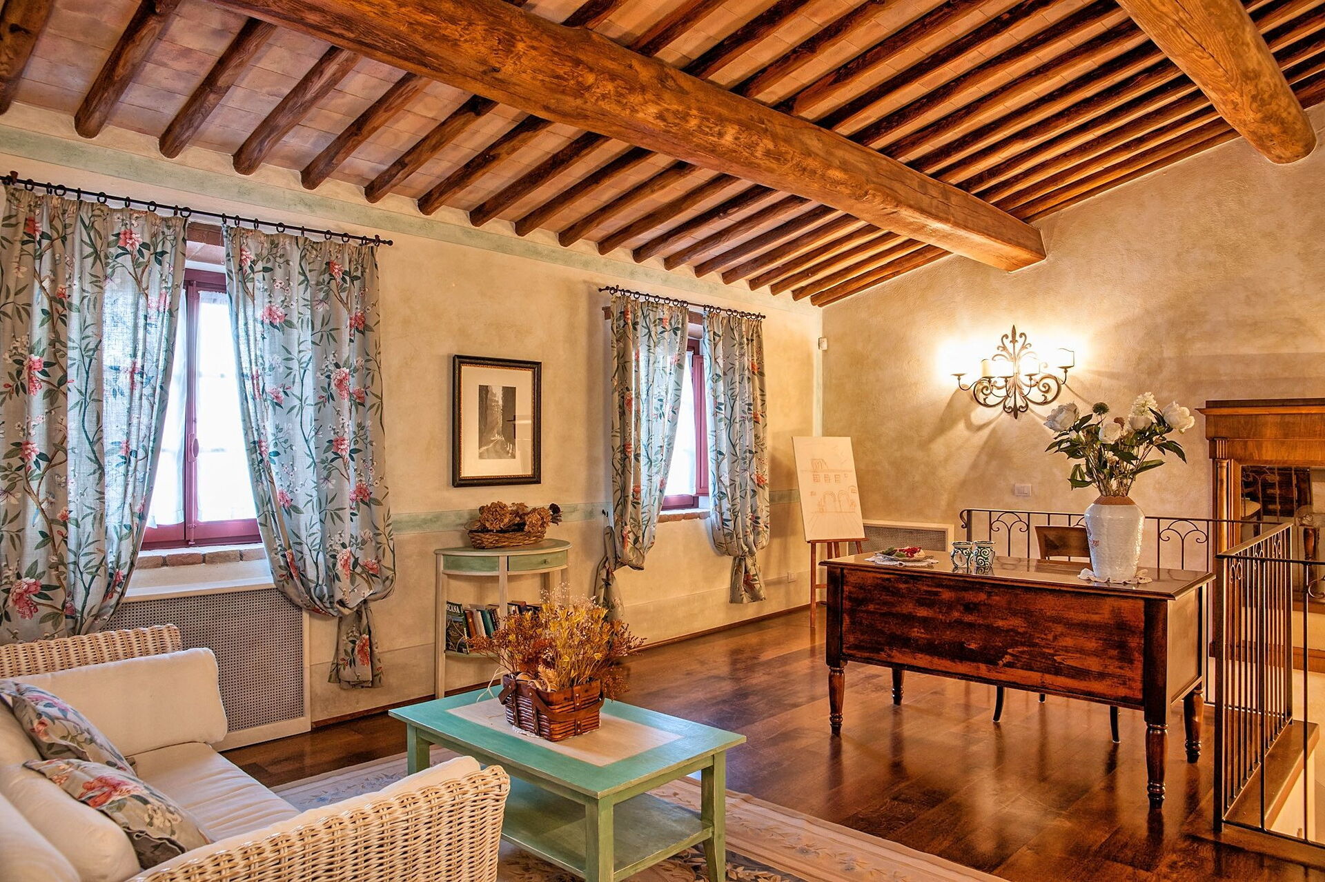 Beautiful private villa with swimming-pool situated in panoramic location on the Tuscan hills, between Florence and Siena. This splendid property has been recently restored preserving its original architectural features and has been turned into an elegant villa sleeping up to 16 people and an adjoining outbuilding for 8 people (rentable upon request only together with the main villa) allowing a total number of 24 guests. Both the villa and the outbuilding are tastefully furnished and offer spacious and extremely comfortable interiors.