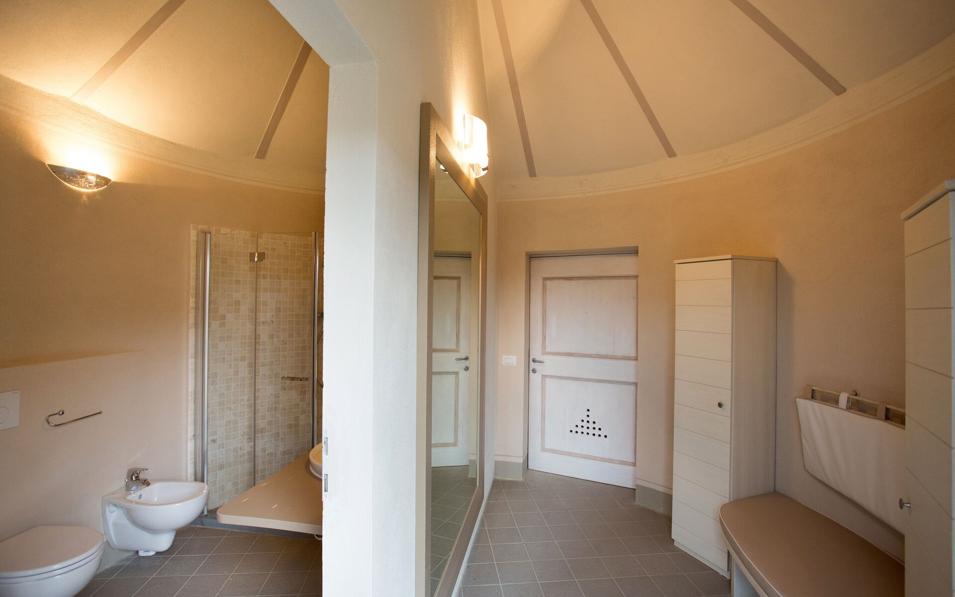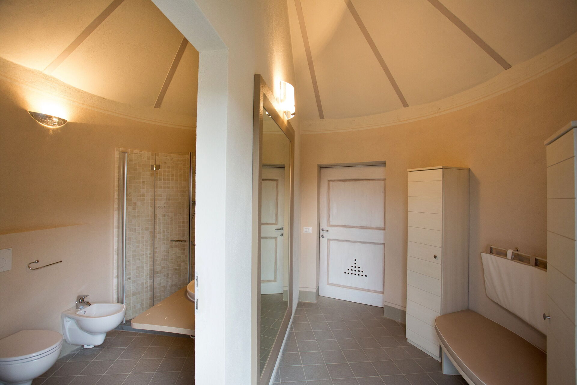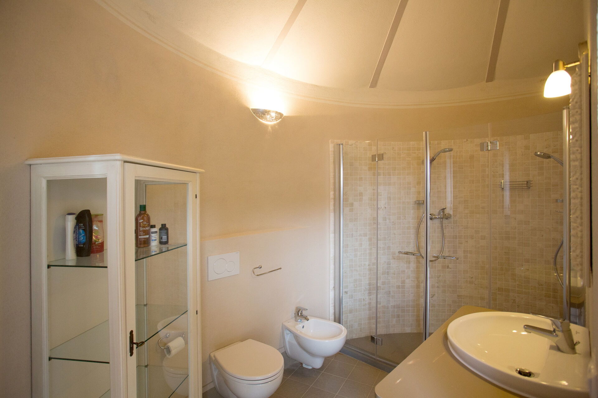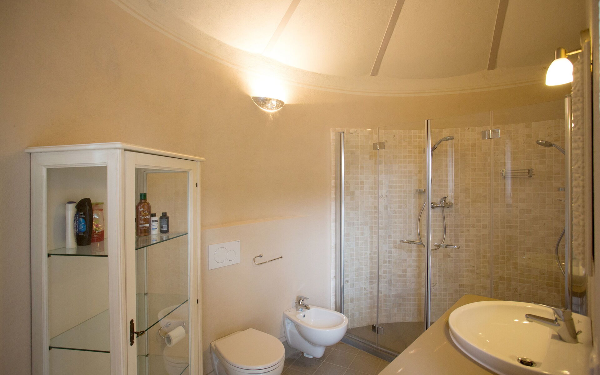 Bathroom 1: basin, toilet, bidet, shower.