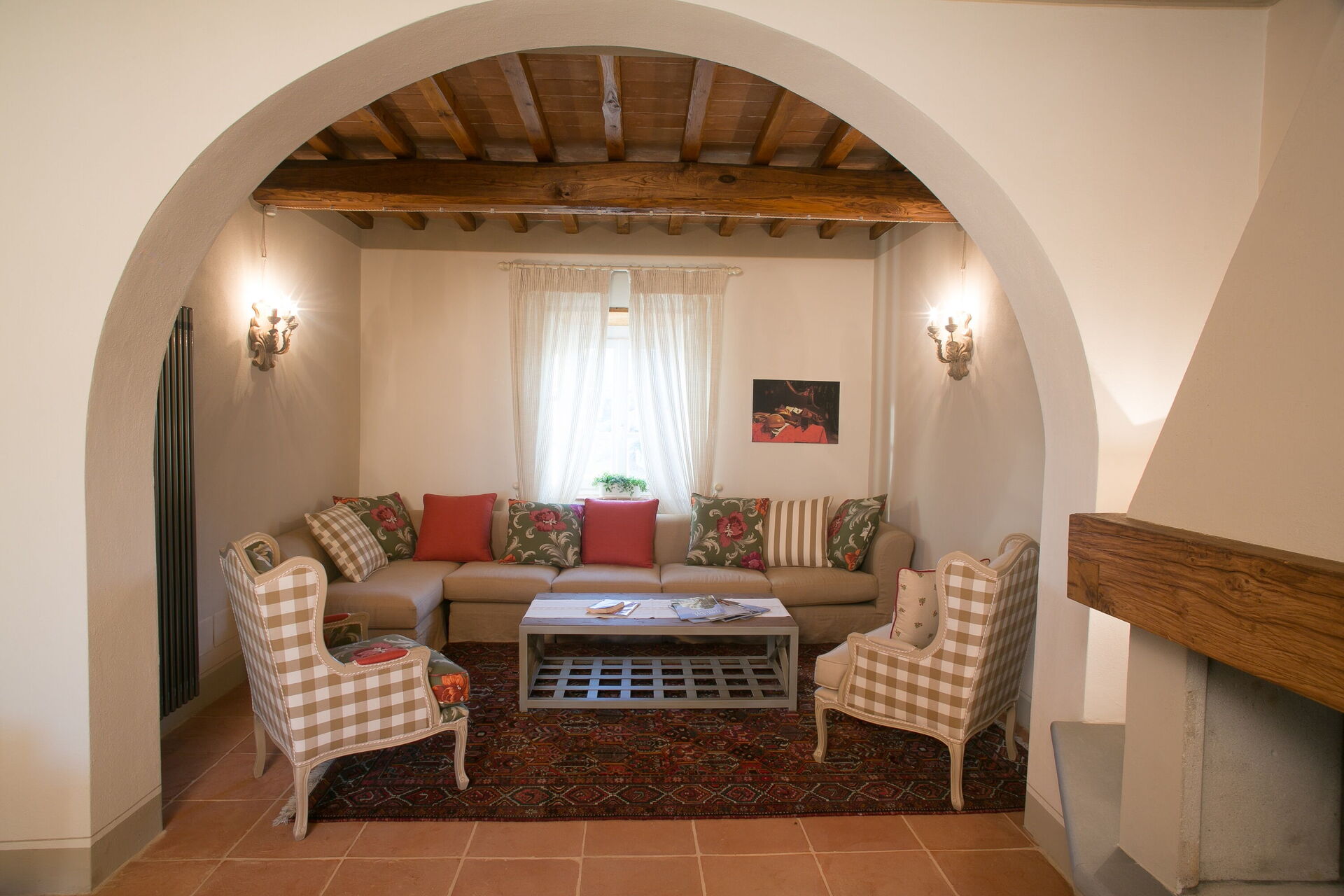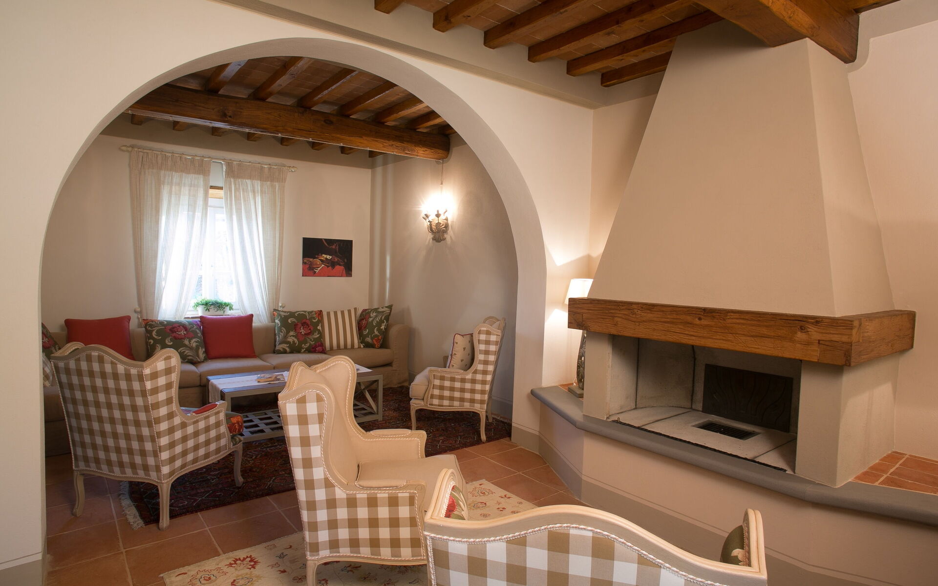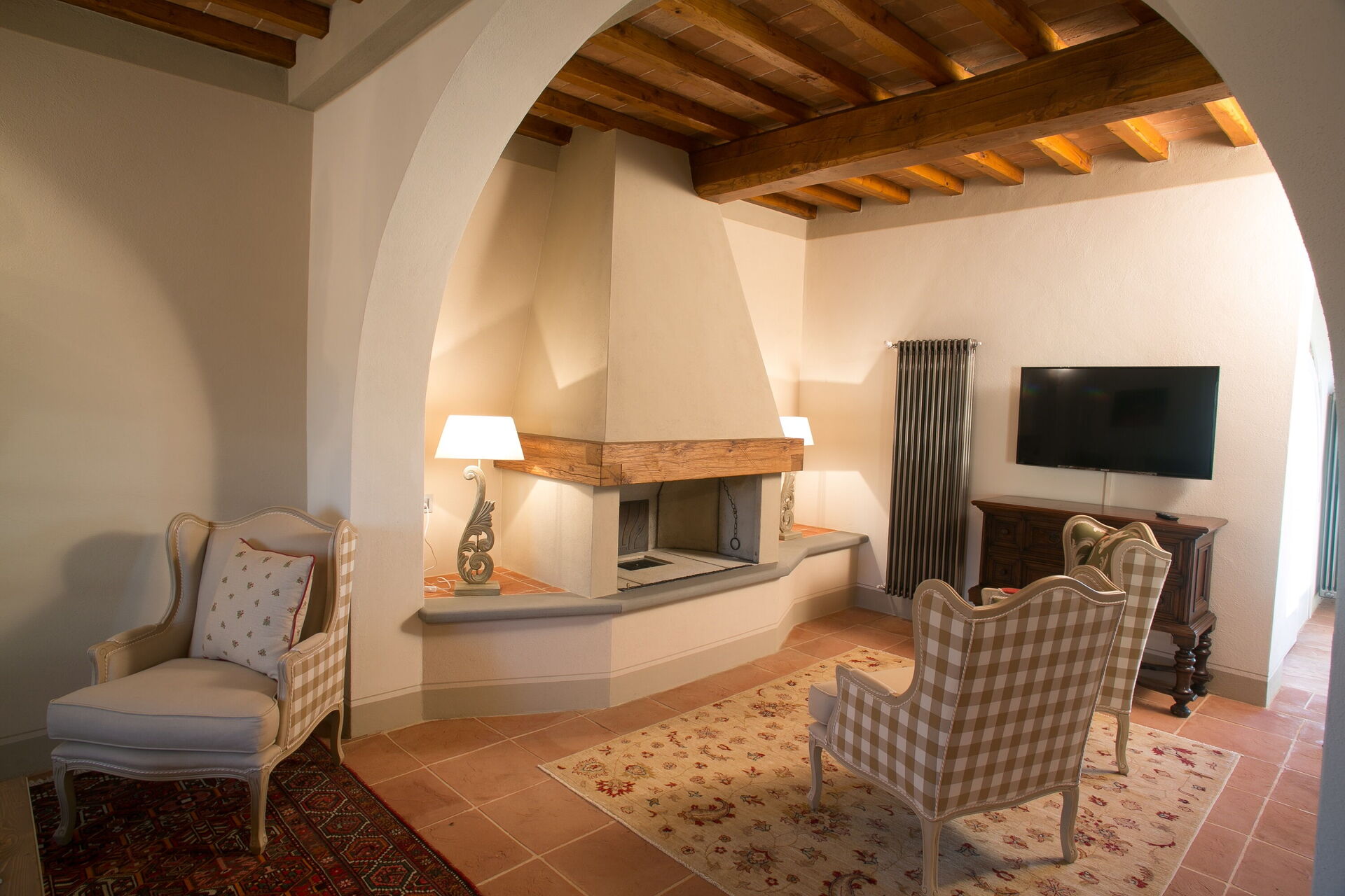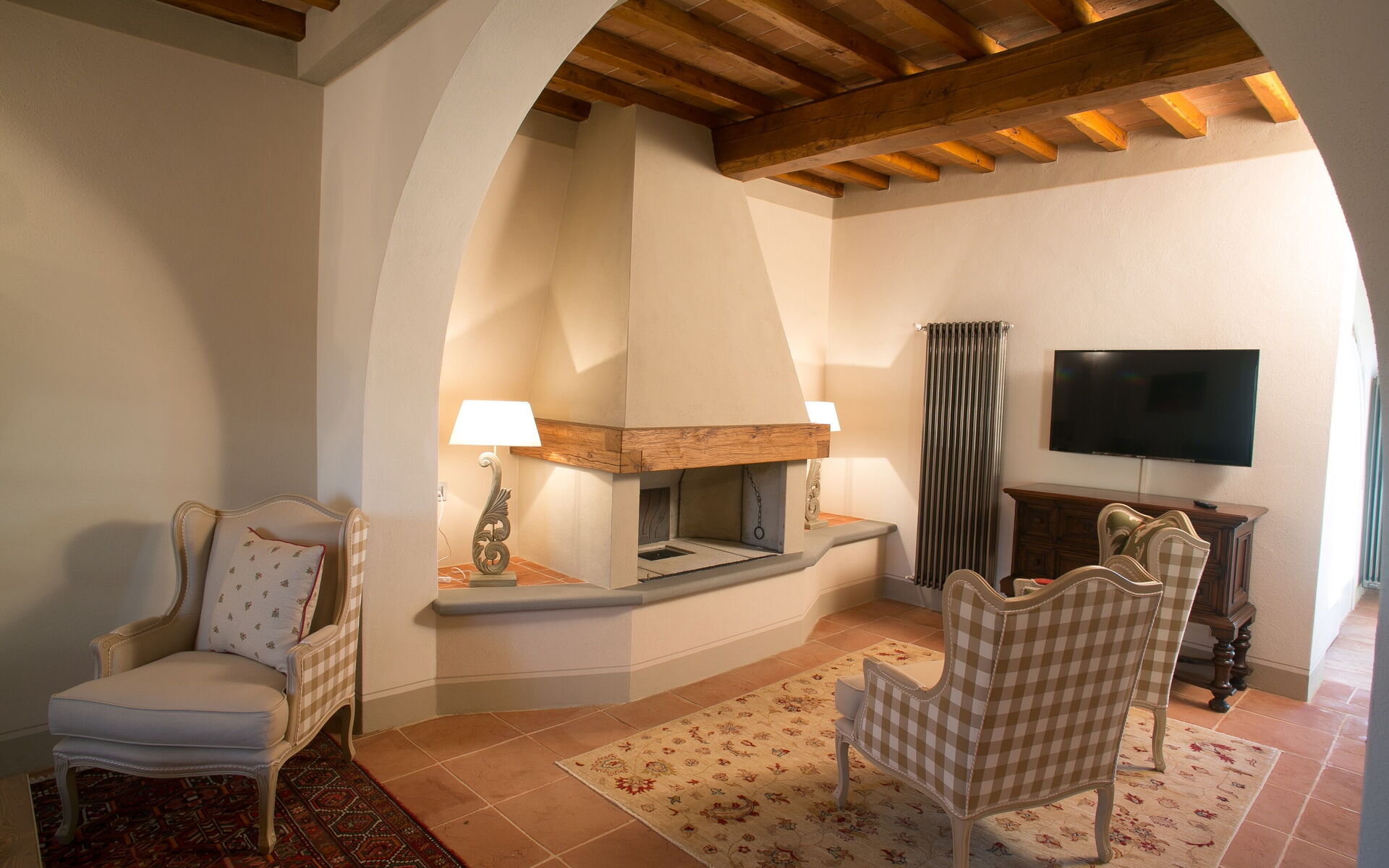 Living room: sofa, four armchairs, fireplace, WIFI internet, television.