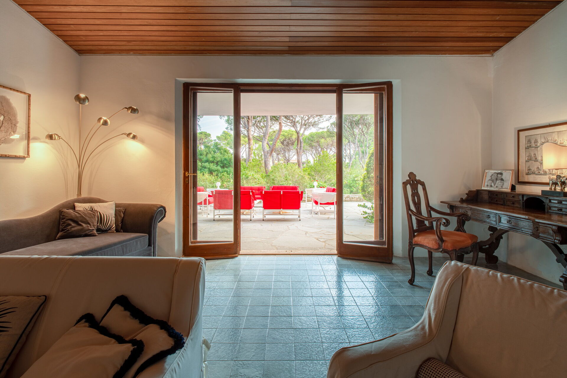 Living room: three sofas (people: 8), two armchairs, fireplace, dining table (people: 4), WIFI internet, air conditioning, mosquito net, exit to the patio.