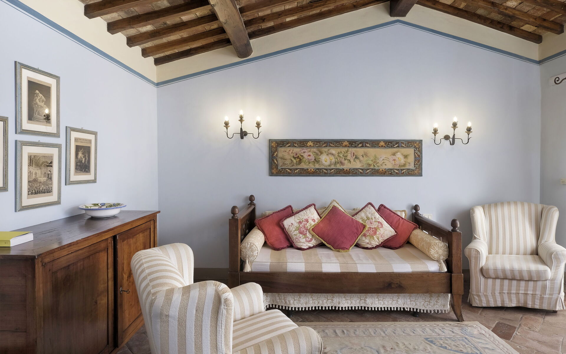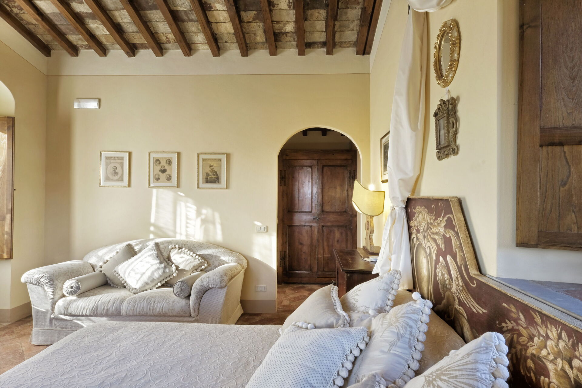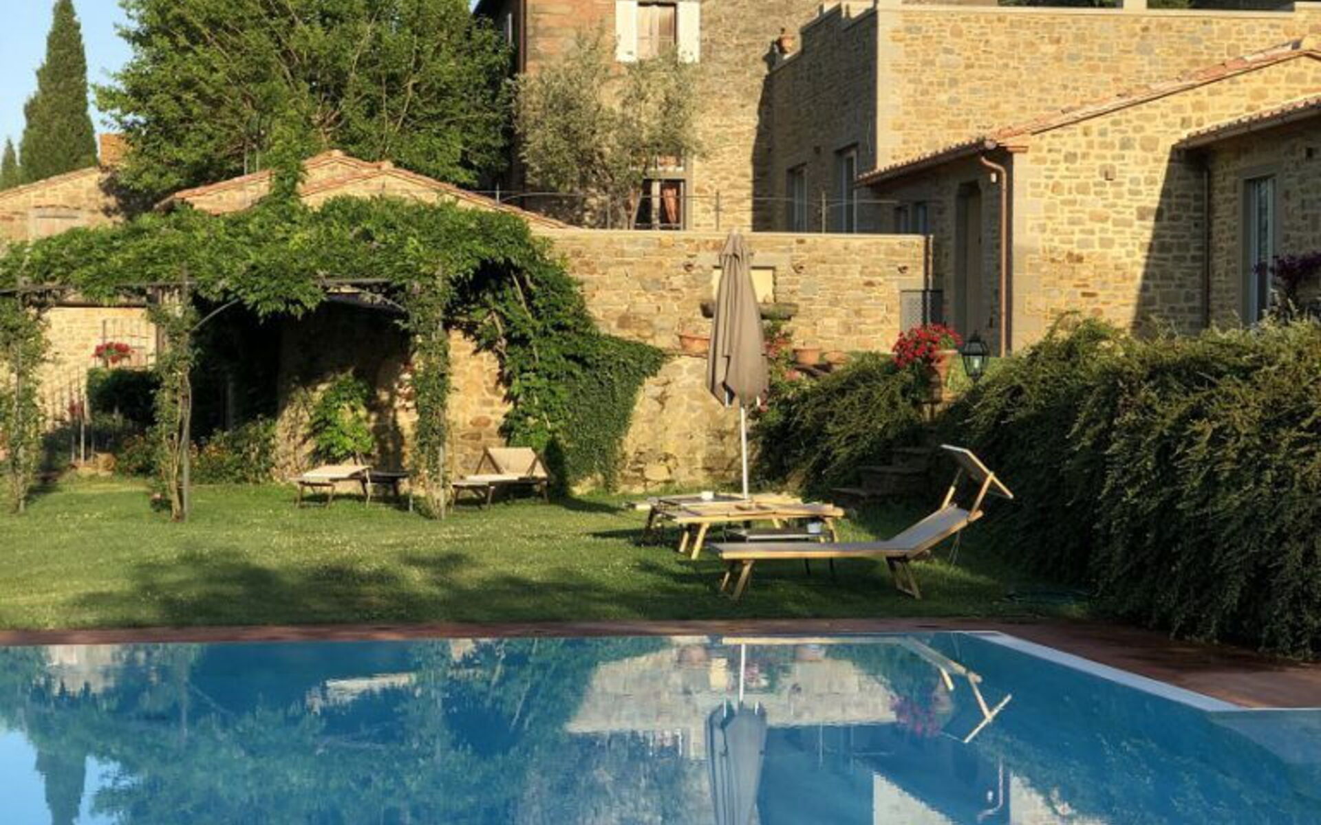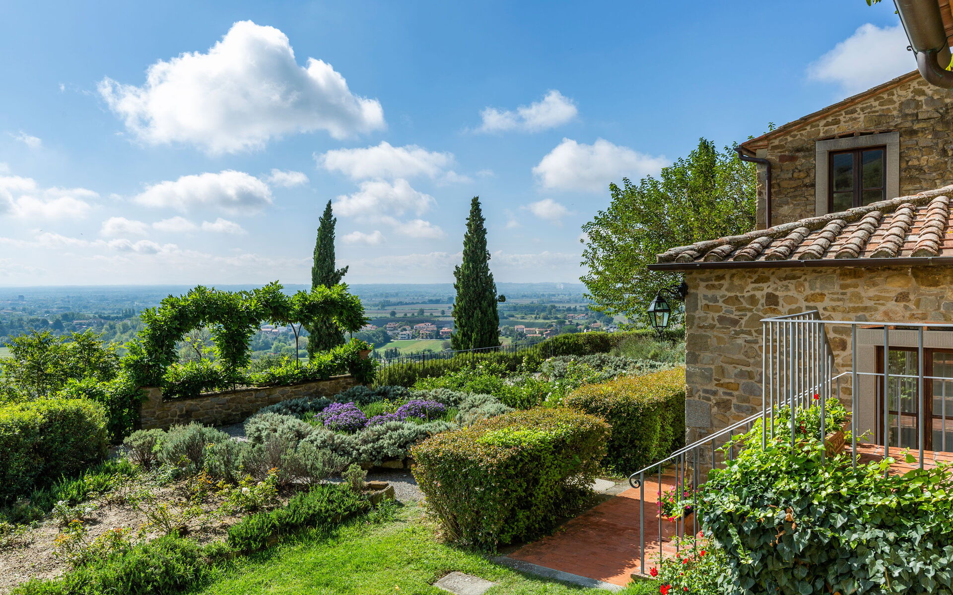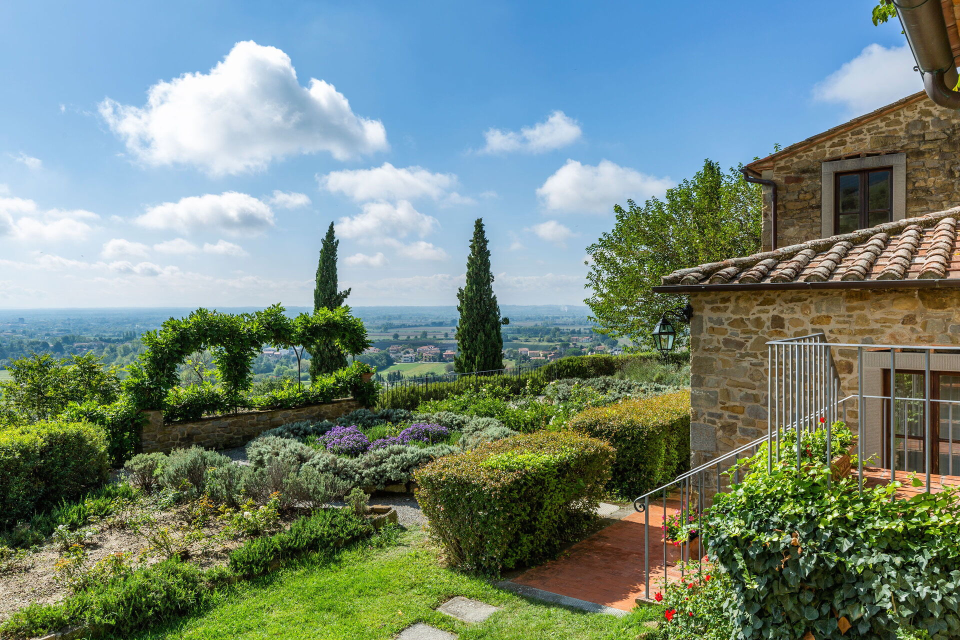 A lovely frescoed ceiling room, with adjoining small kitchen, is located adjacent to the swimming pool, suited to start the day with a breakfast together or to prepare small snacks during the day in the pool. A barbecue is available in the garden close to the swimming pool. The small stone buildings that make up the Borgo del Falco are joined by ladders, small alleys and everywhere the green fields and the garden that surrounds the property. Villa Borgo del Falco has the privilege of its position overlooking Cortona and its hill and the vineyards.