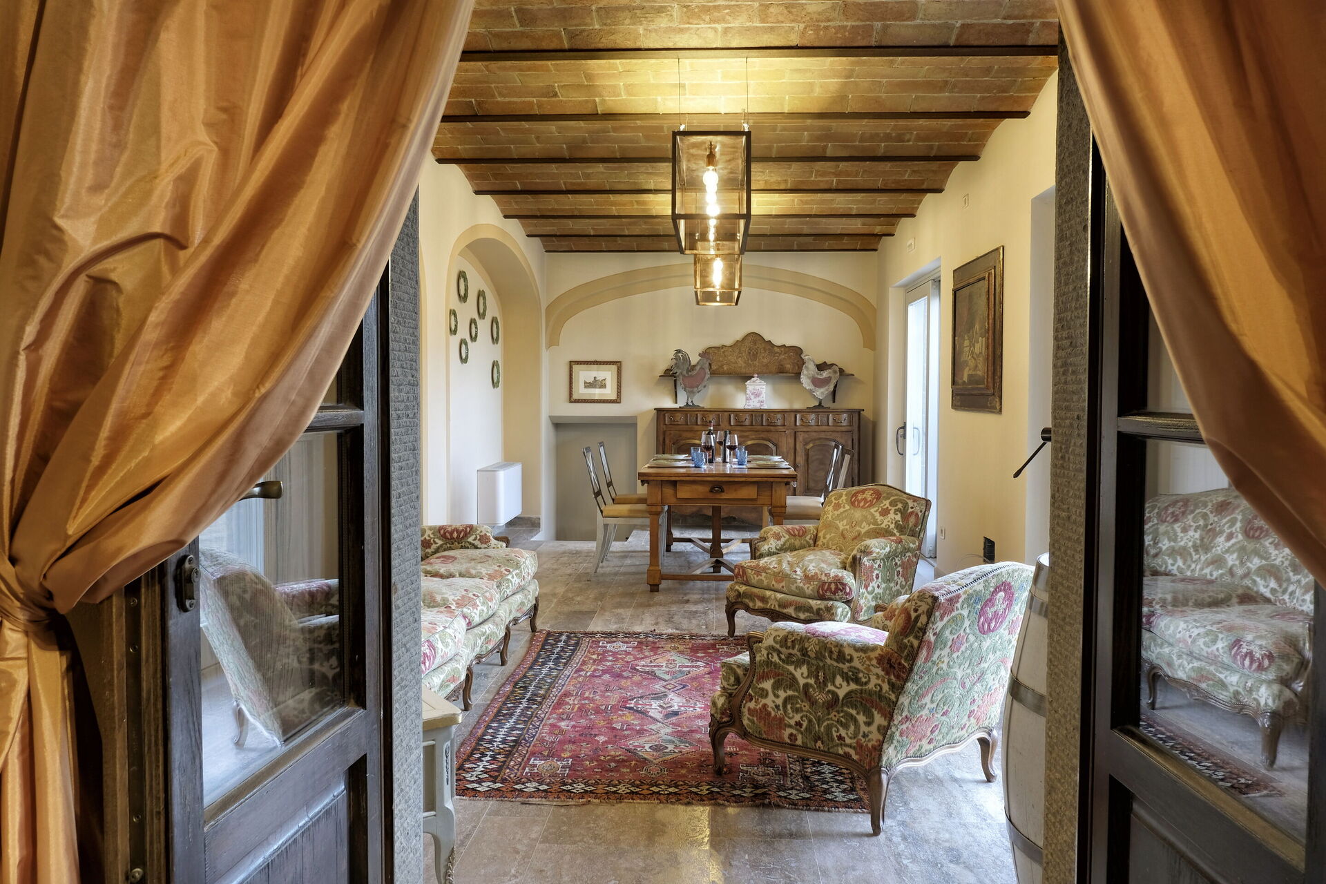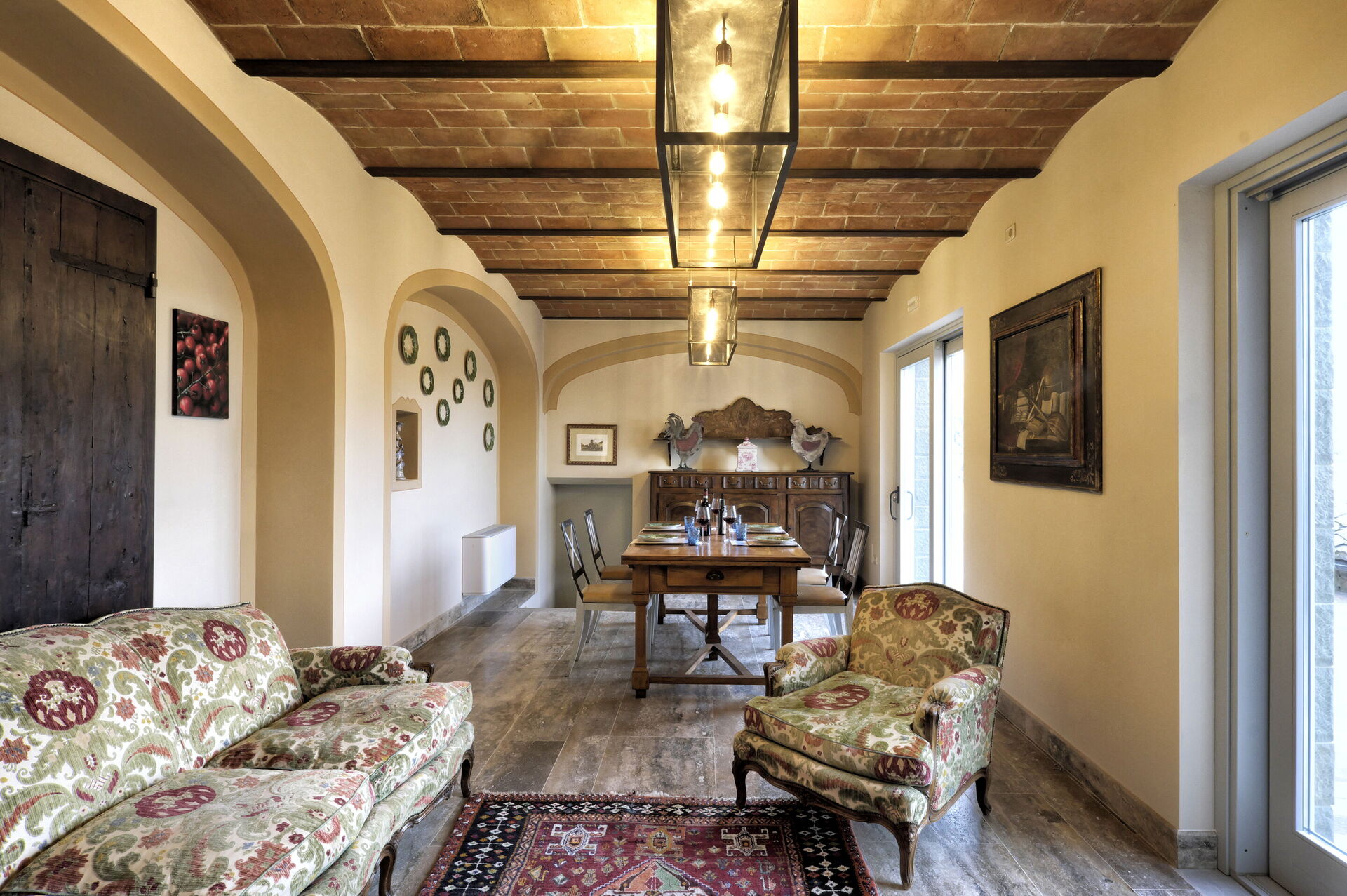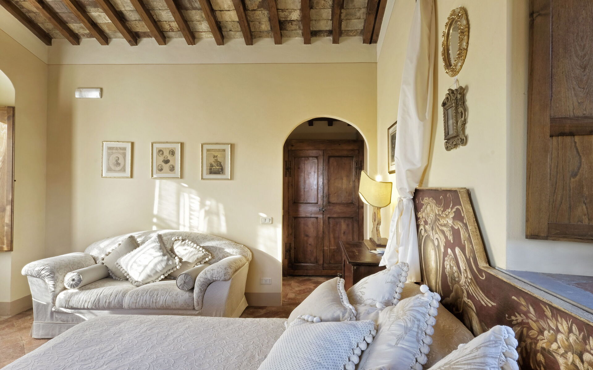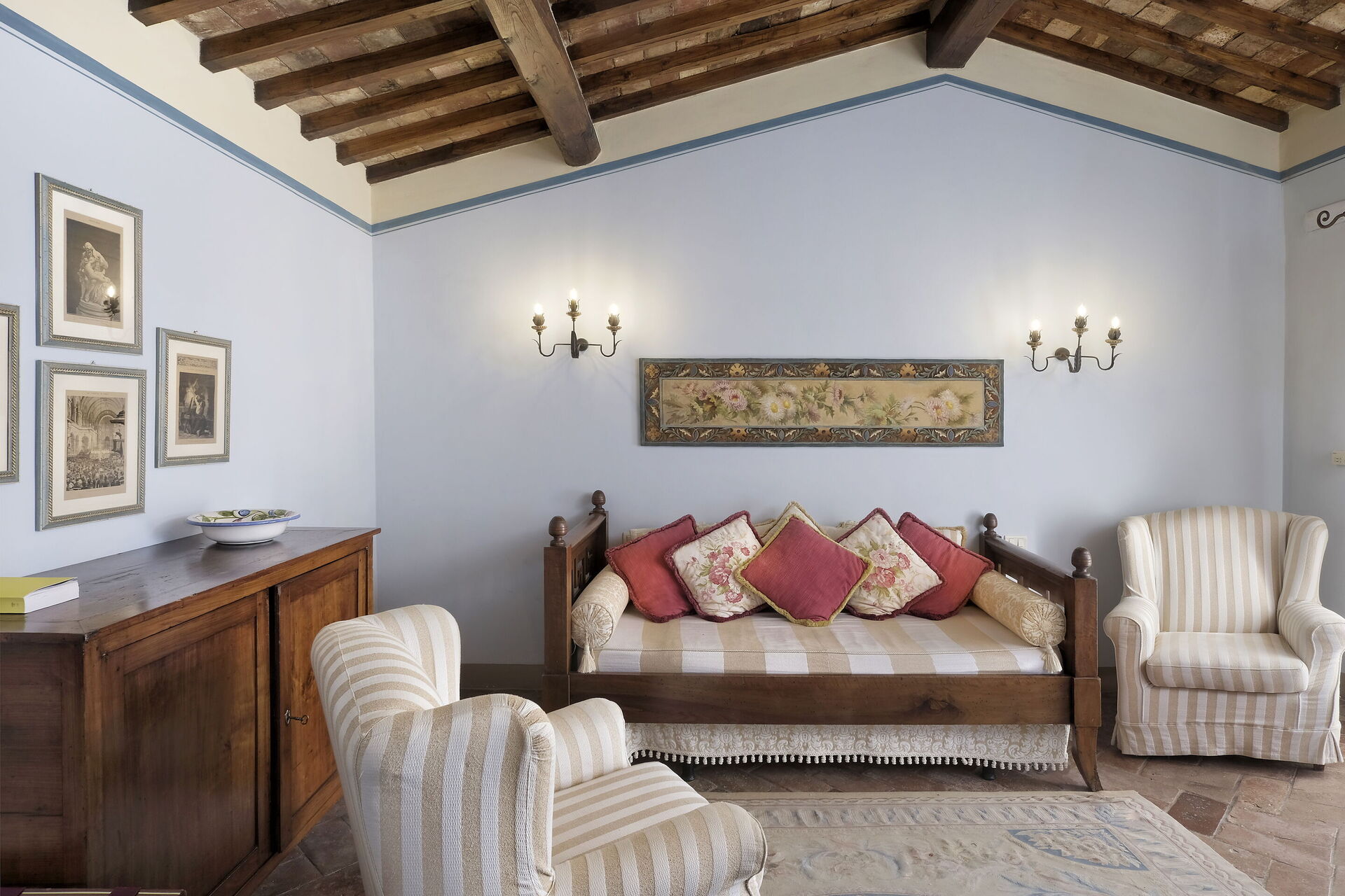 A lovely frescoed ceiling room, with adjoining small kitchen, is located adjacent to the swimming pool, suited to start the day with a breakfast together or to prepare small snacks during the day in the pool. A barbecue is available in the garden close to the swimming pool. The small stone buildings that make up the Borgo del Falco are joined by ladders, small alleys and everywhere the green fields and the garden that surrounds the property. Villa Borgo del Falco has the privilege of its position overlooking Cortona and its hill and the vineyards.