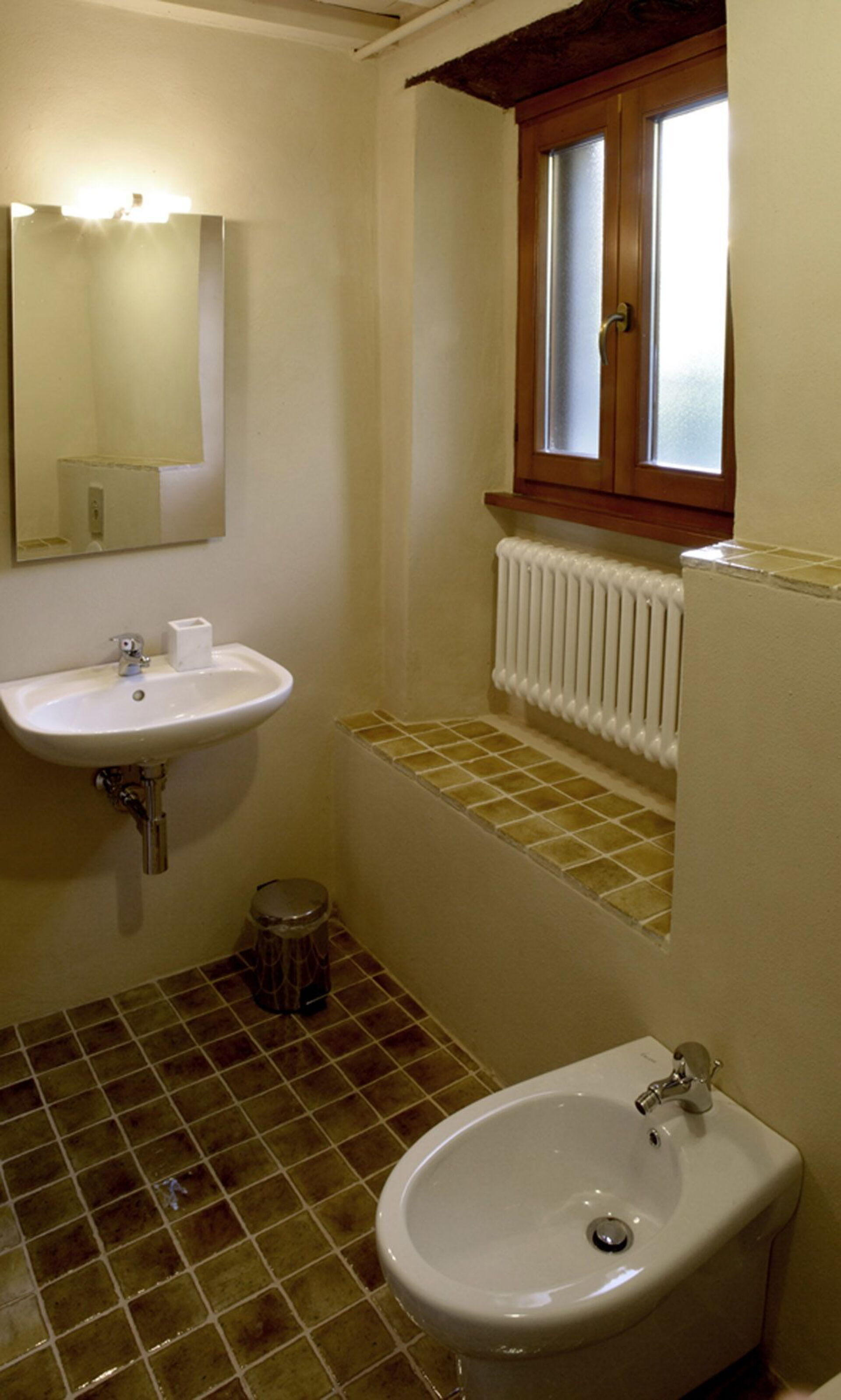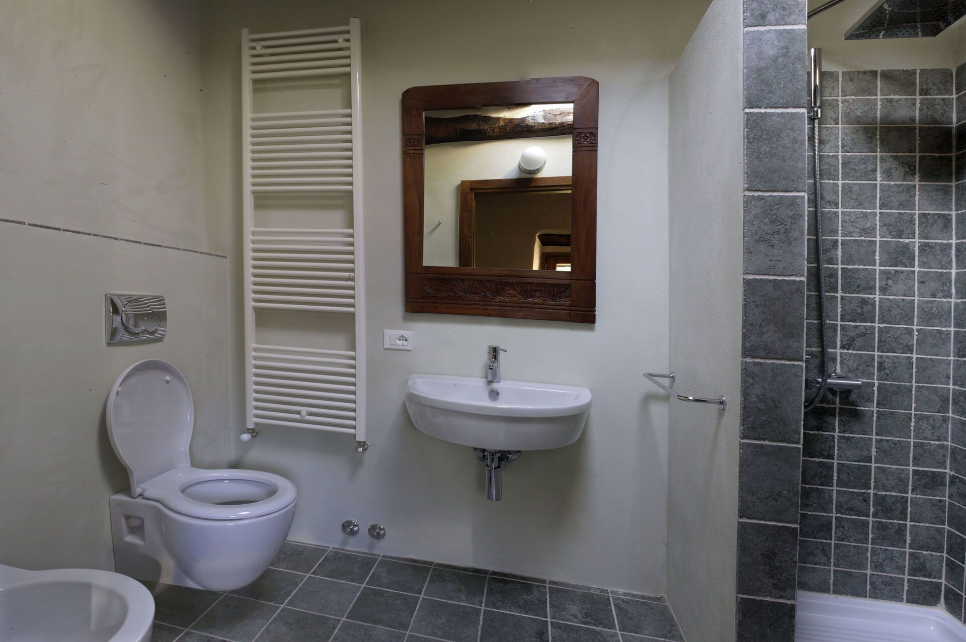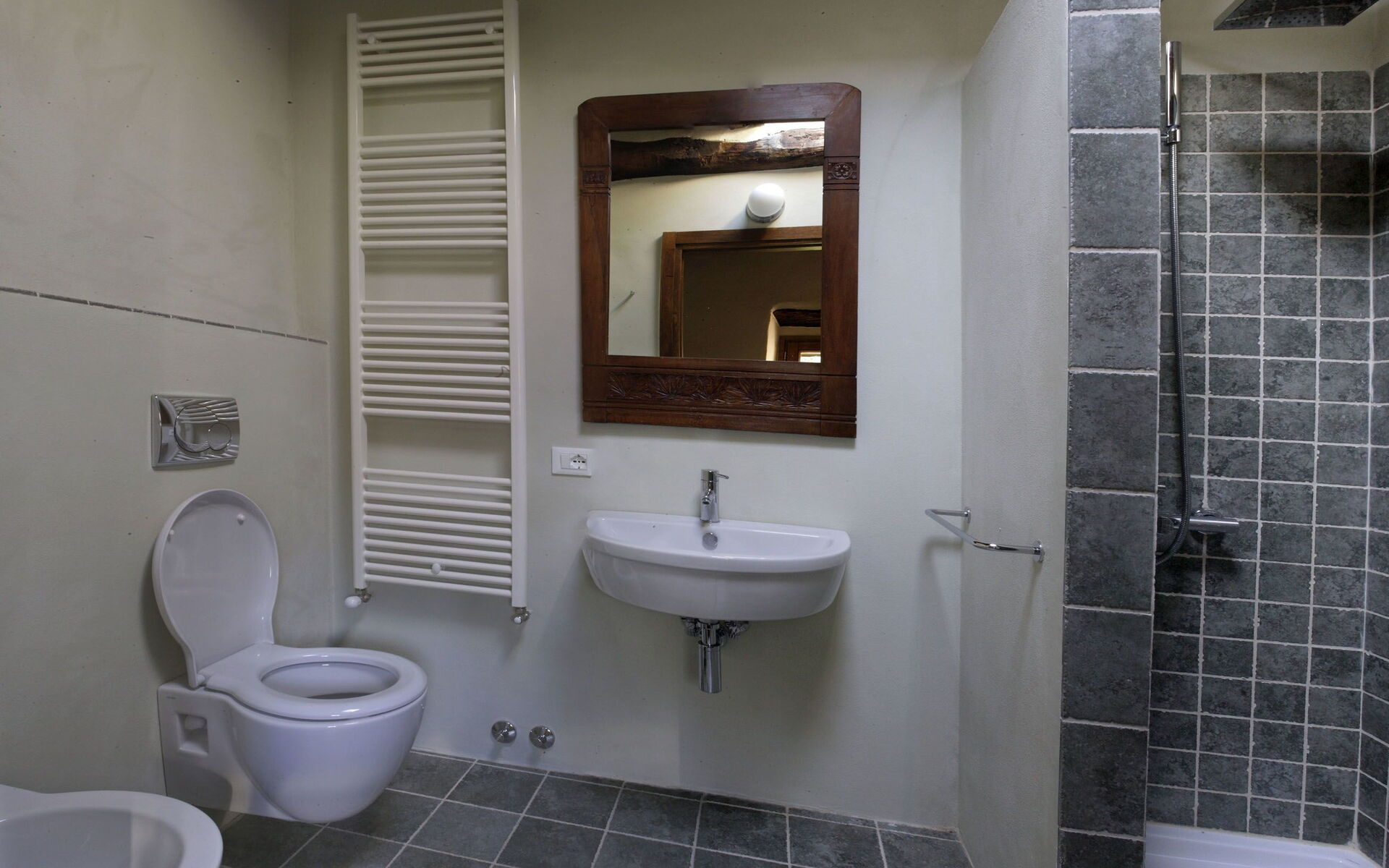 Bathroom: basin, toilet, bidet, shower.