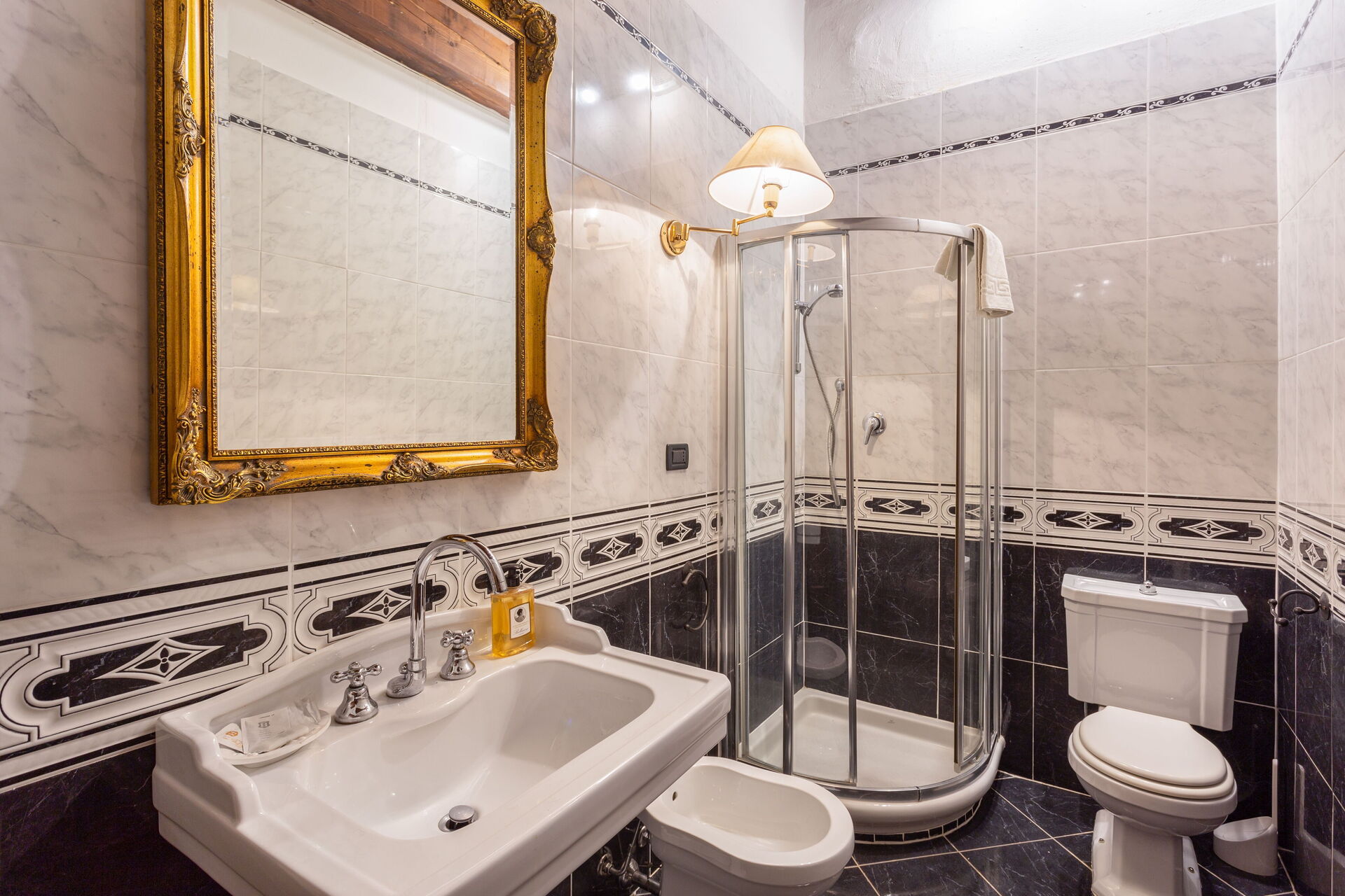 Bathroom: basin, toilet, bidet, shower.