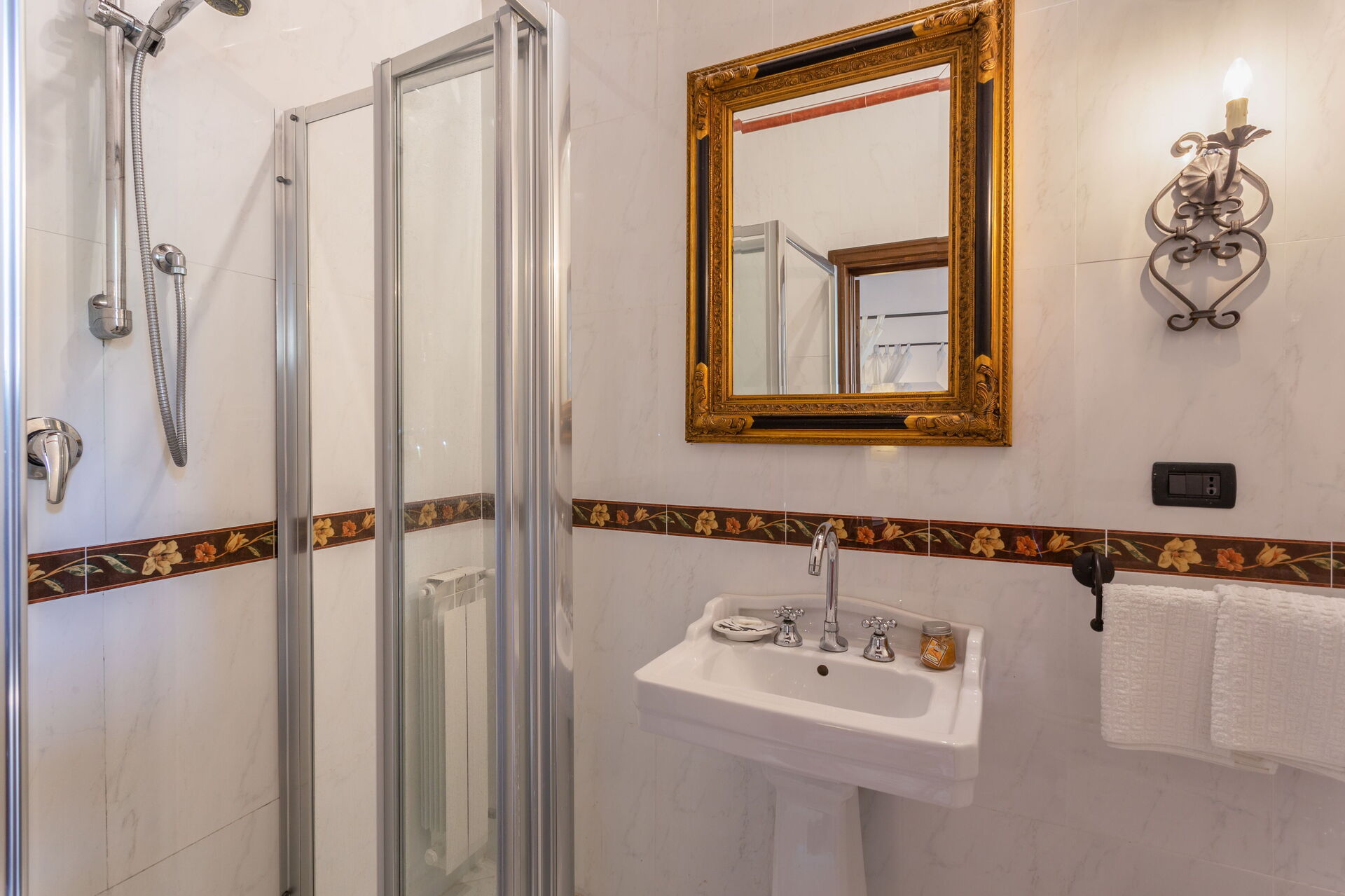 Bathroom 1: basin, toilet, bidet, shower.