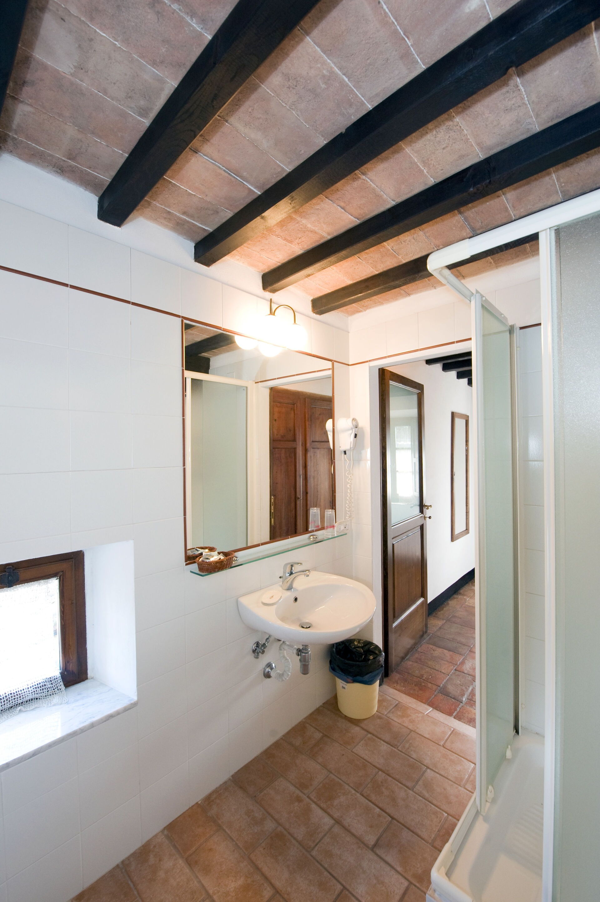 Bathroom: basin, toilet, shower, hairdryer.