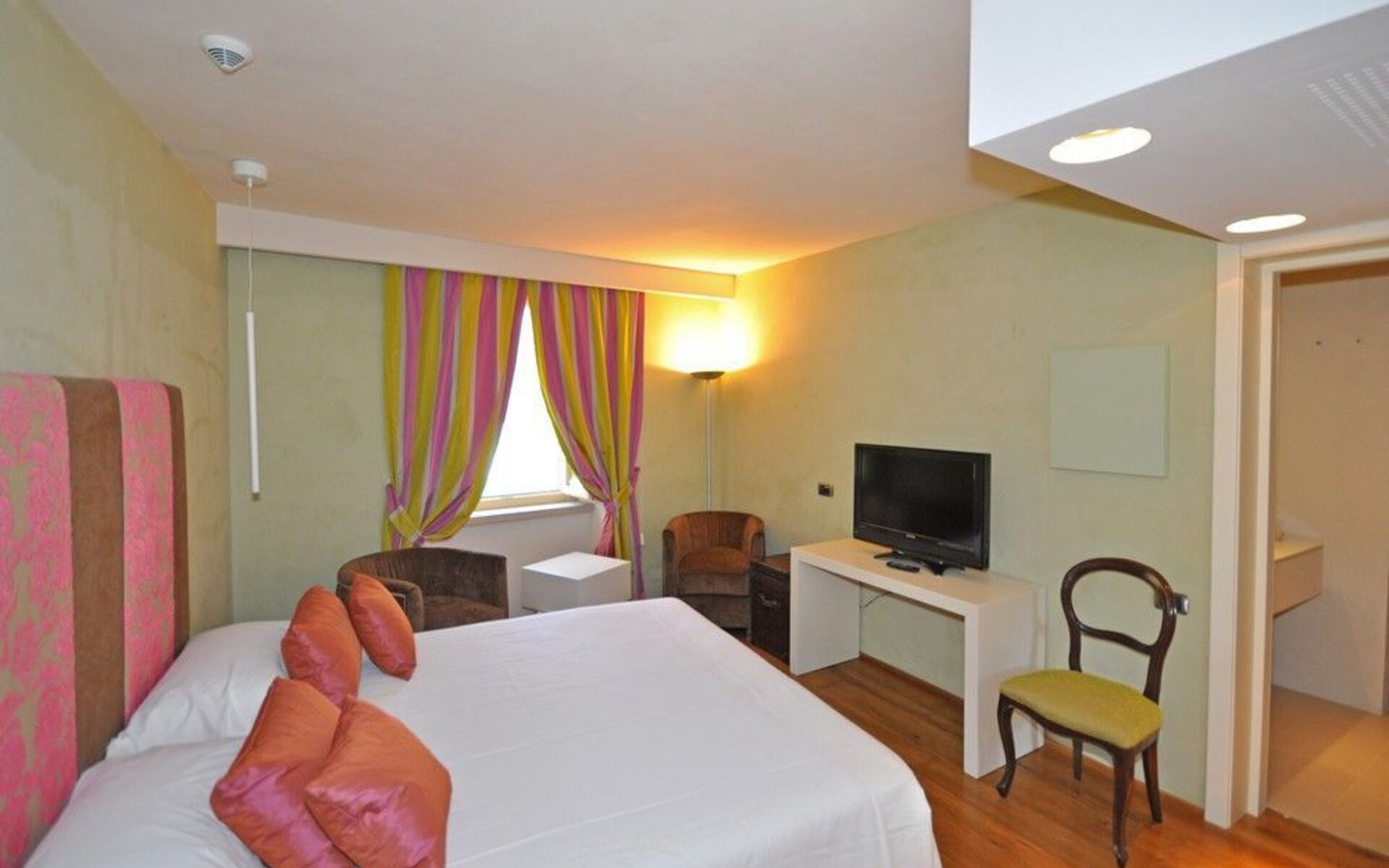 1st floor (also accessible via a lift): suite with living-room and double bedroom with ensuite bathroom with bathtub / shower, double bedroom with ensuite bathroom with bathtub / shower, double bedroom with ensuite bathroom with bathtub / shower, double bedroom with ensuite bathroom with shower, double bedroom with ensuite bathroom with bathtub, double bedroom with ensuite bathroom with shower, double bedroom with ensuite bathroom with bathtub and shower, double bedroom with ensuite bathroom with shower, kitchen corner with 2 electric hot plates, fridge and freezer, access on to a terrace, bedroom with French bed (also suitable for 2 adults) with ensuite bathroom with bathtub / shower (this room can be connected to the nearby double bedroom).