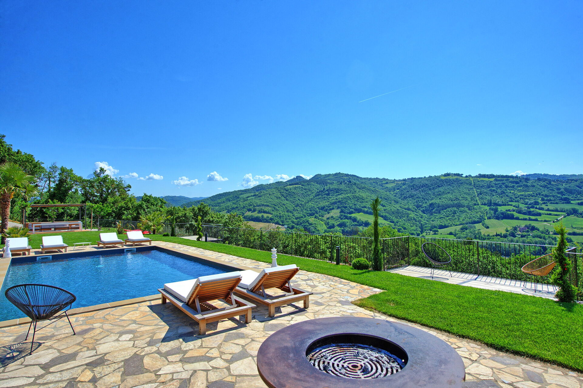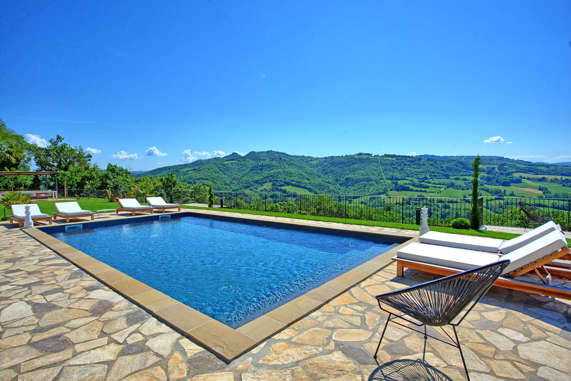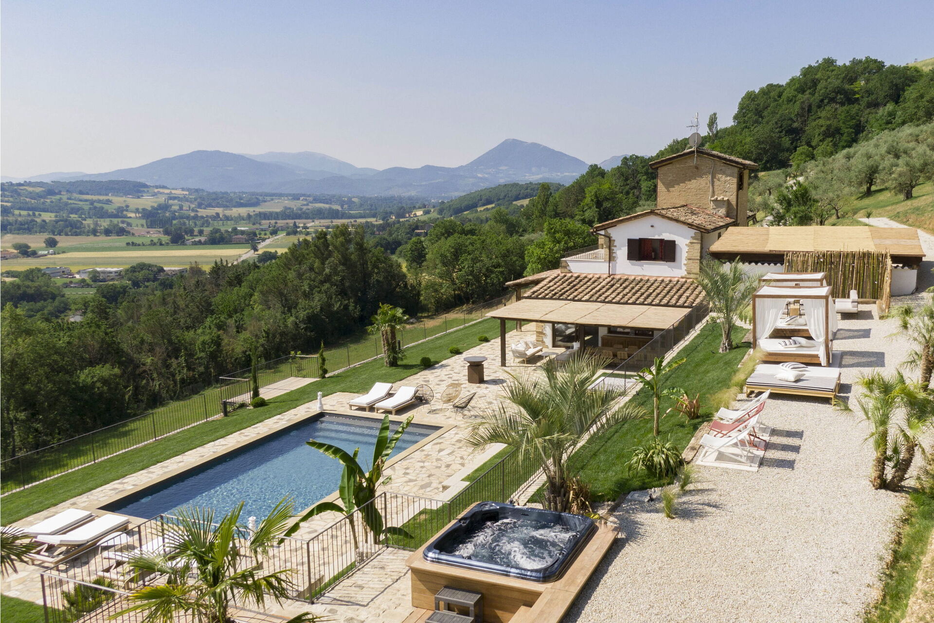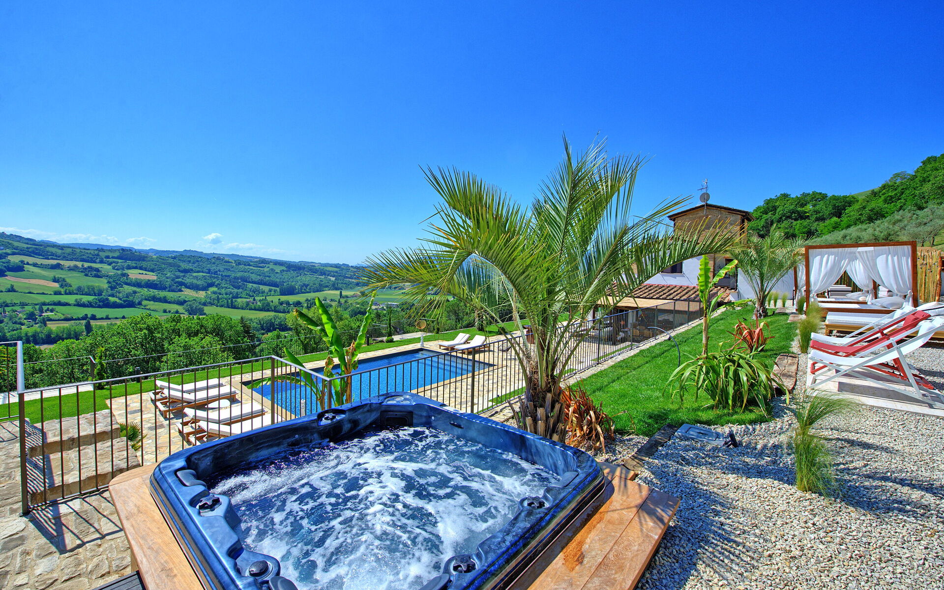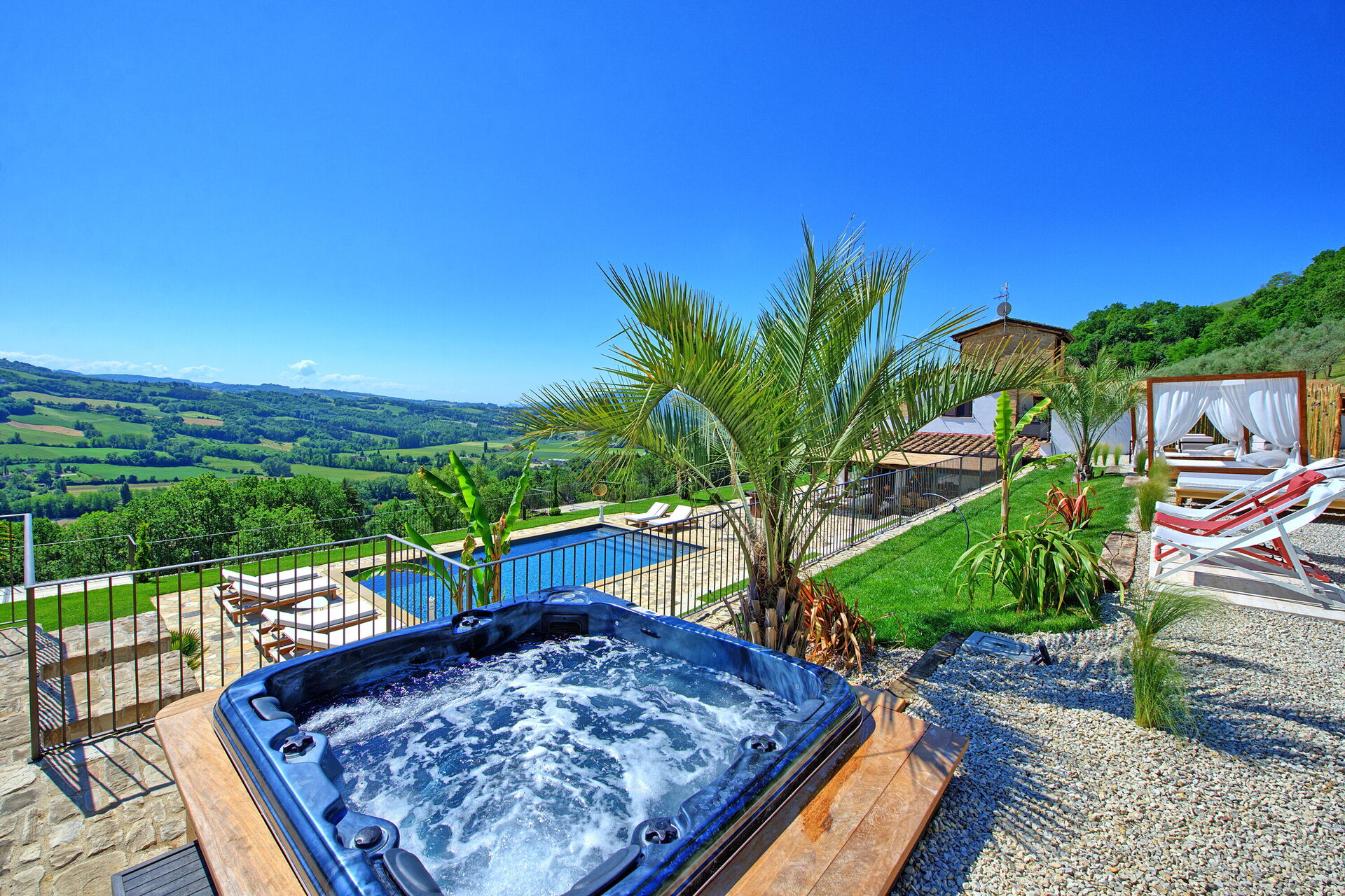 On the outside, Villa Pura offers to its guests a beautiful wide garden with trees and flowers, where you can find a marvellous private swimming pool, a jacuzzi, sunbeds and umbrellas: that is the perfect place to spend the hottest days with your family and friends. There is also a bbq area, covered with a gazebo and equipped with table, chairs and armchairs to easily dine outdoor. From the property, you can enjoy a breathtaking panoramic view over the hills.
