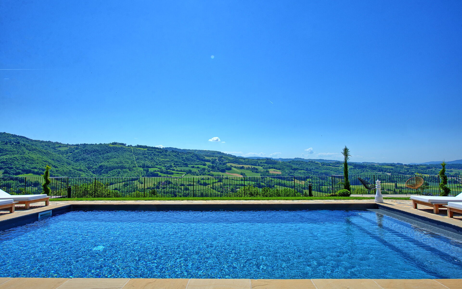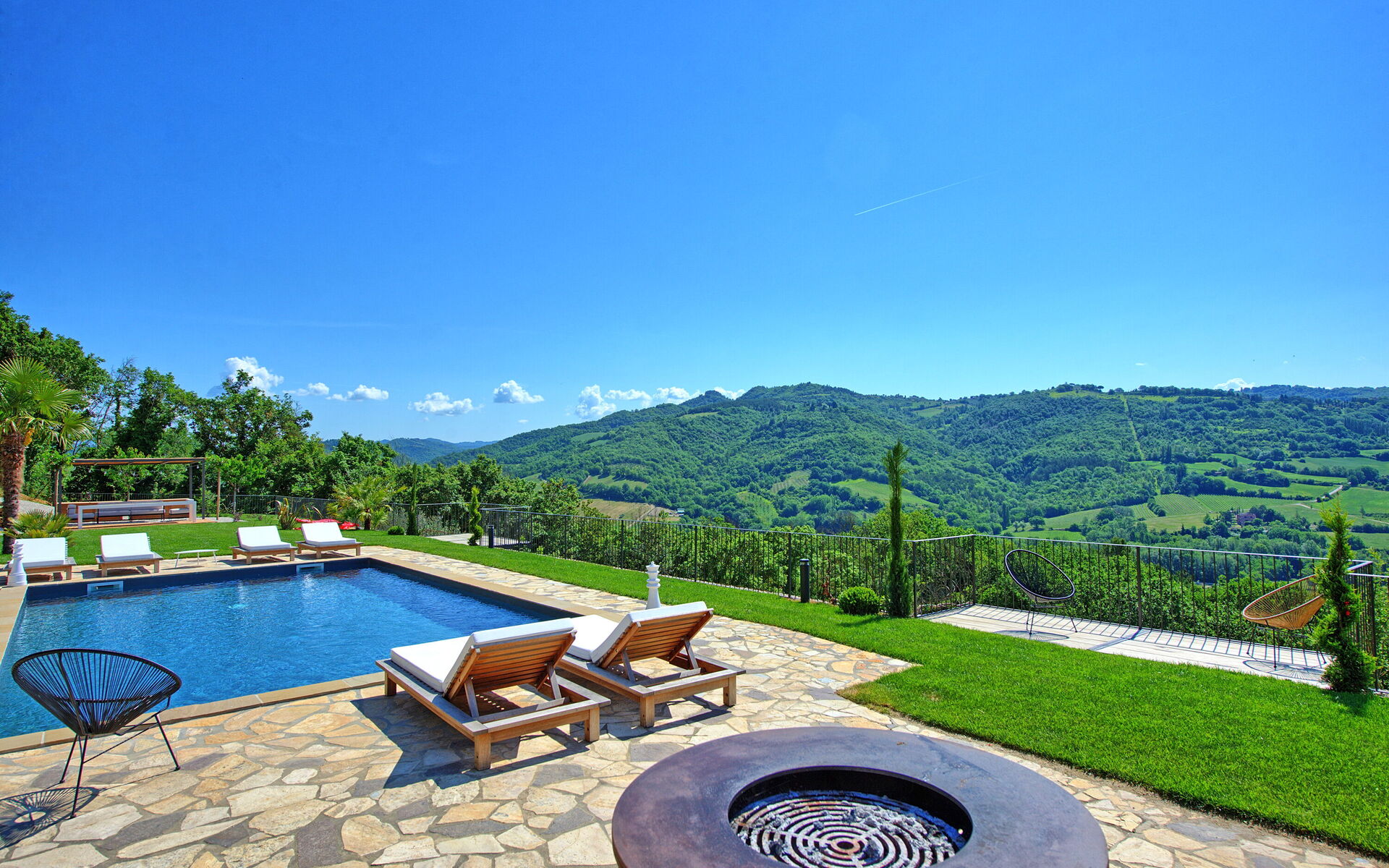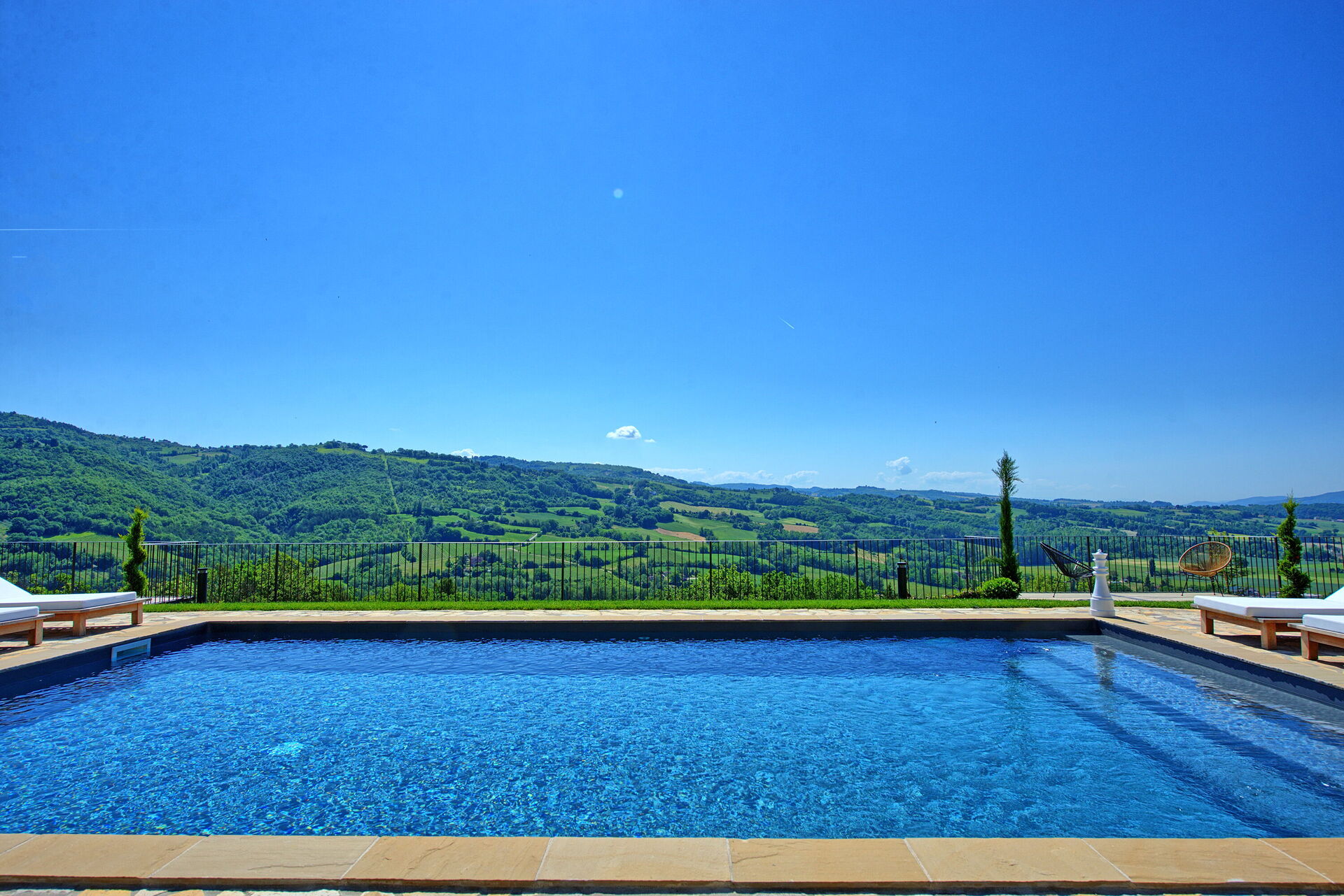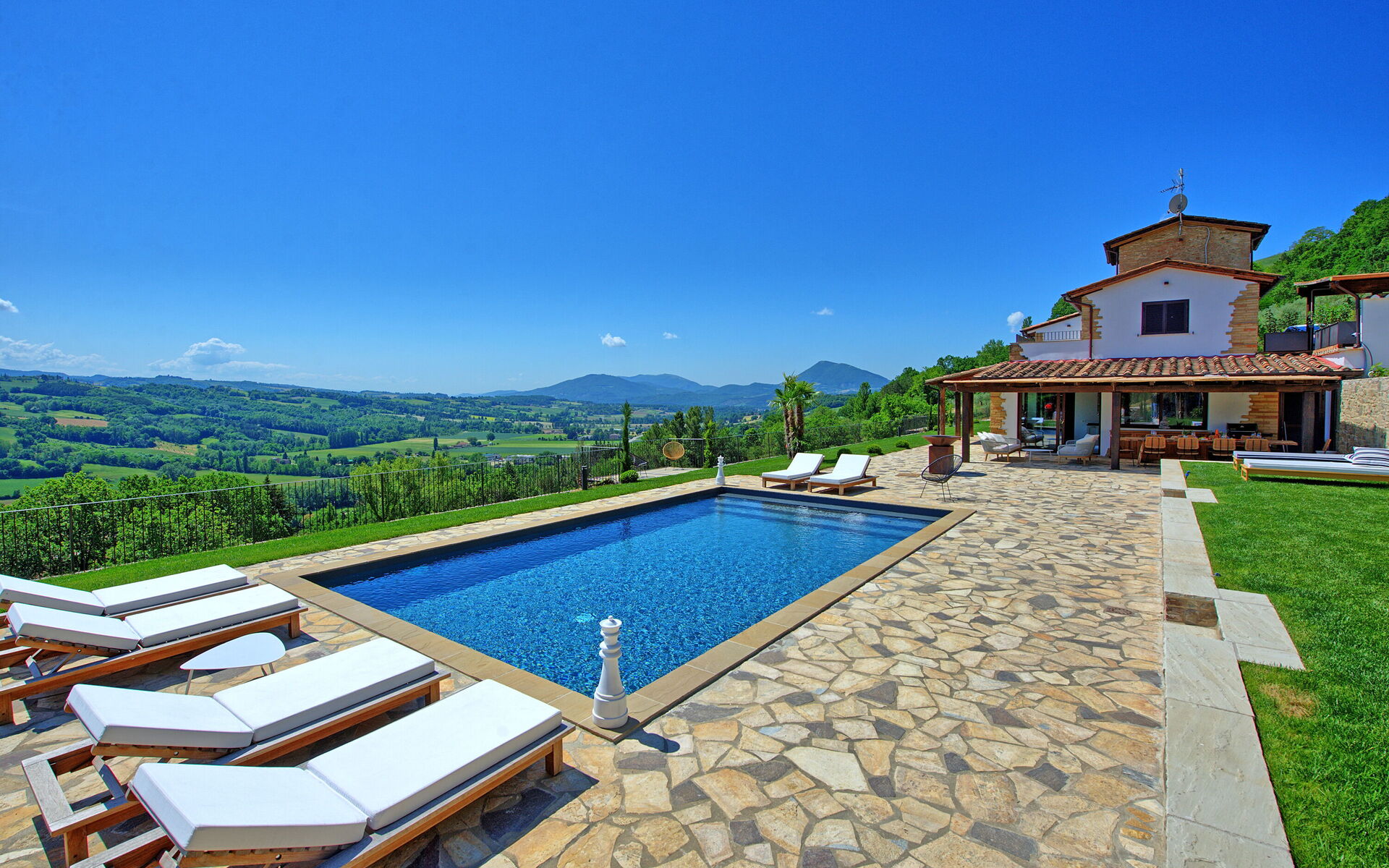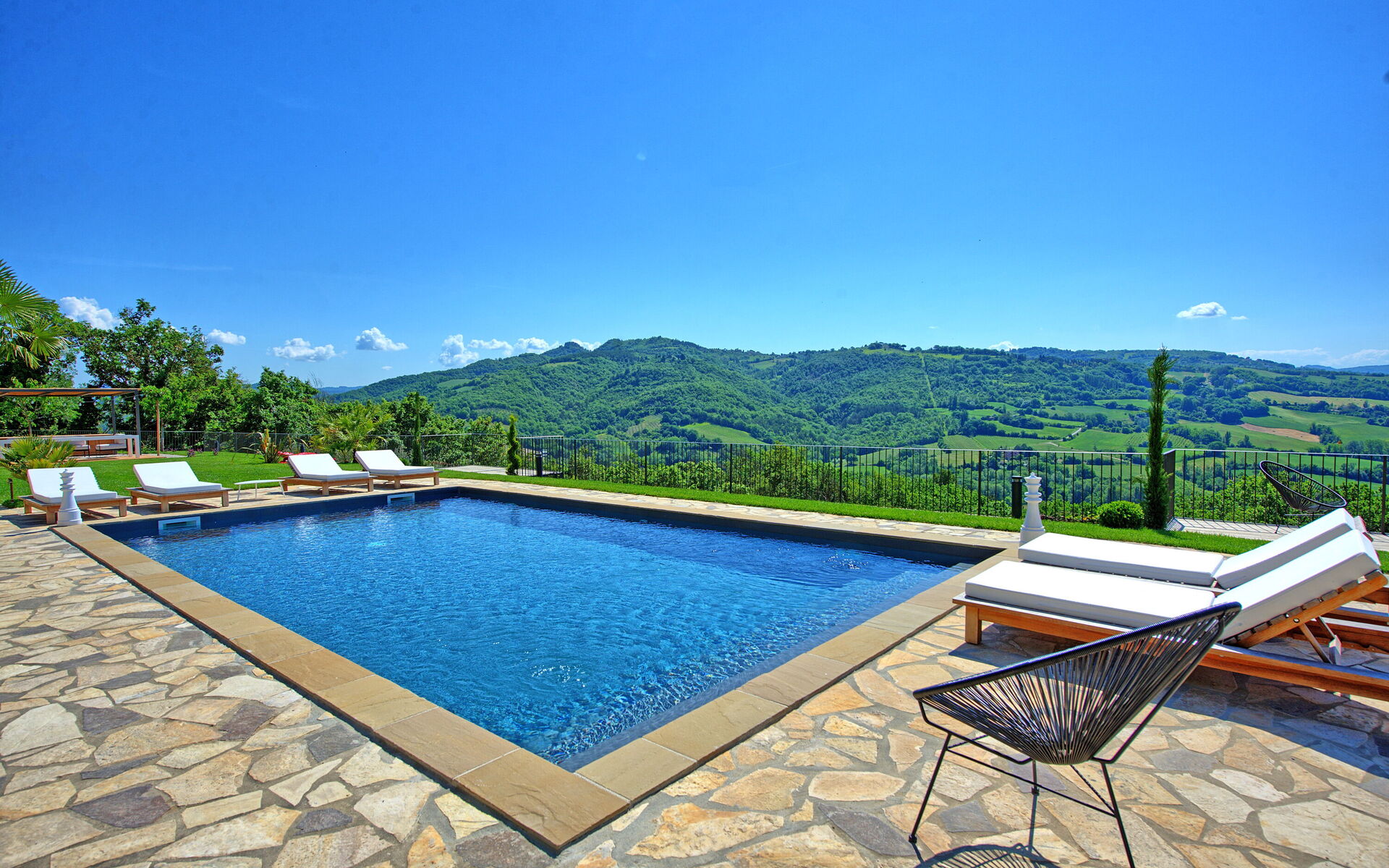 On the outside, Villa Pura offers to its guests a beautiful wide garden with trees and flowers, where you can find a marvellous private swimming pool, a jacuzzi, sunbeds and umbrellas: that is the perfect place to spend the hottest days with your family and friends. There is also a bbq area, covered with a gazebo and equipped with table, chairs and armchairs to easily dine outdoor. From the property, you can enjoy a breathtaking panoramic view over the hills.