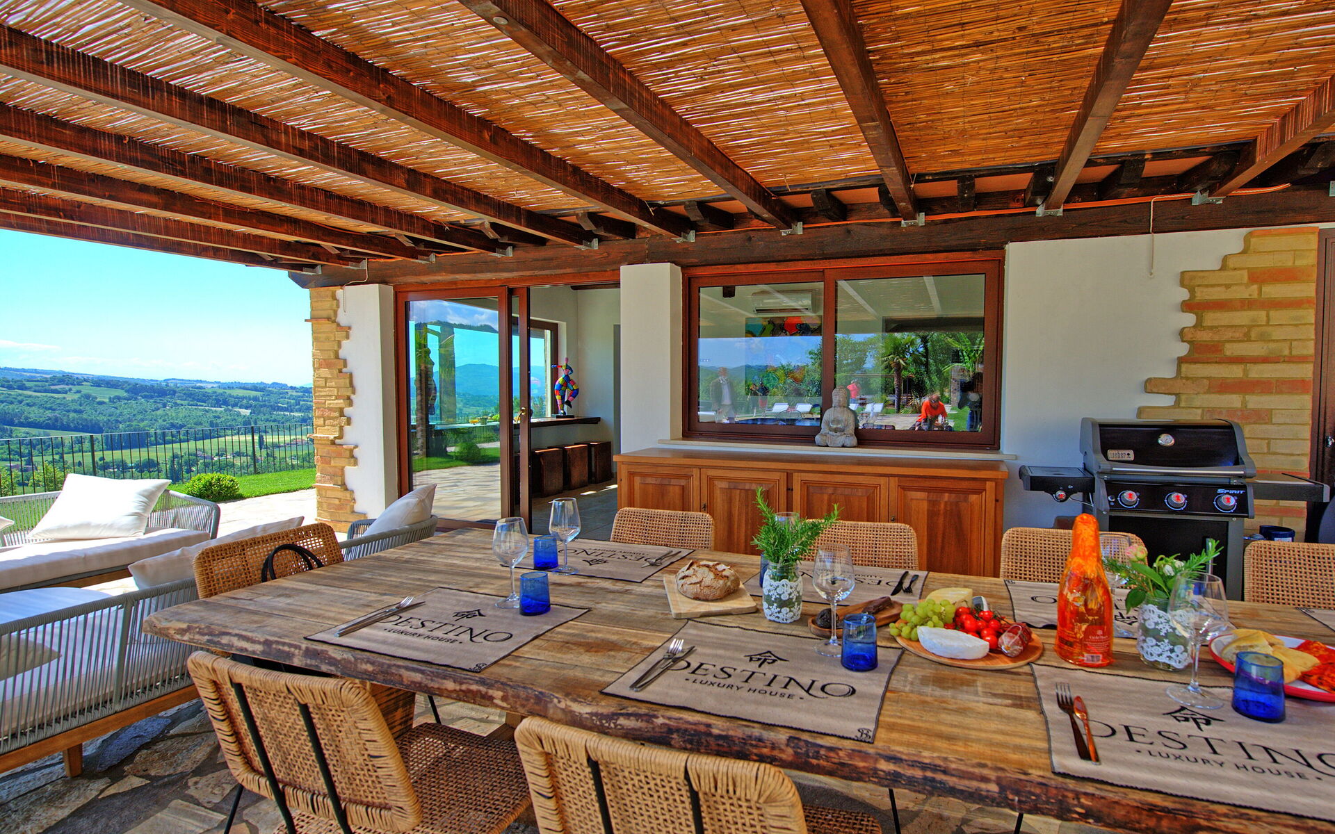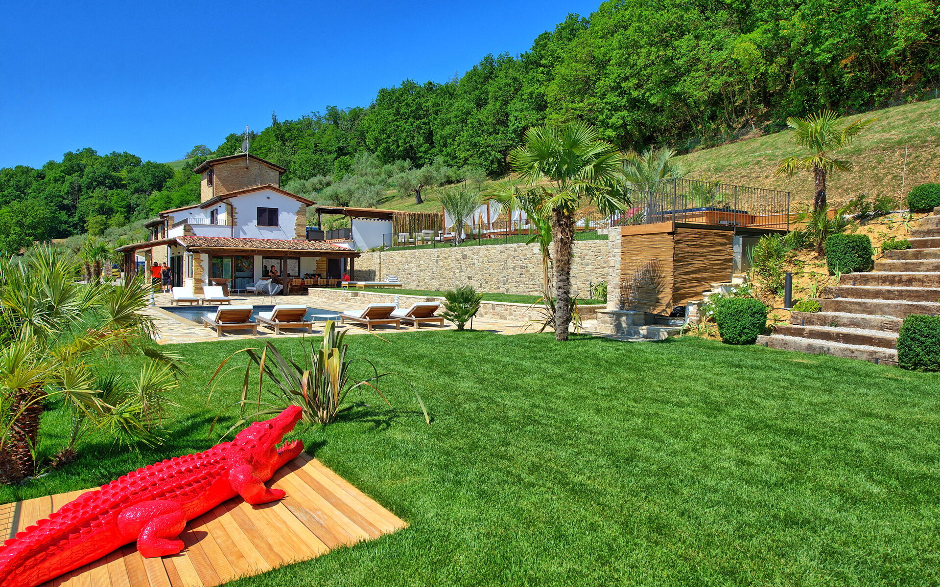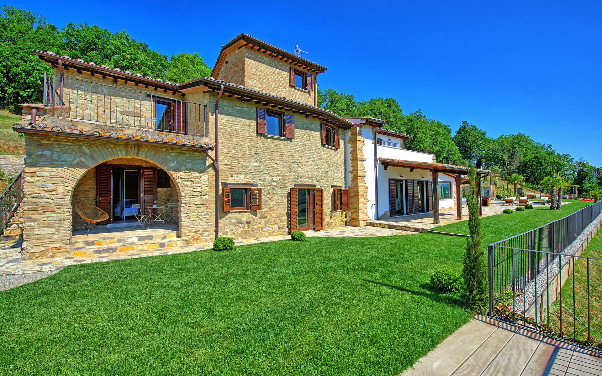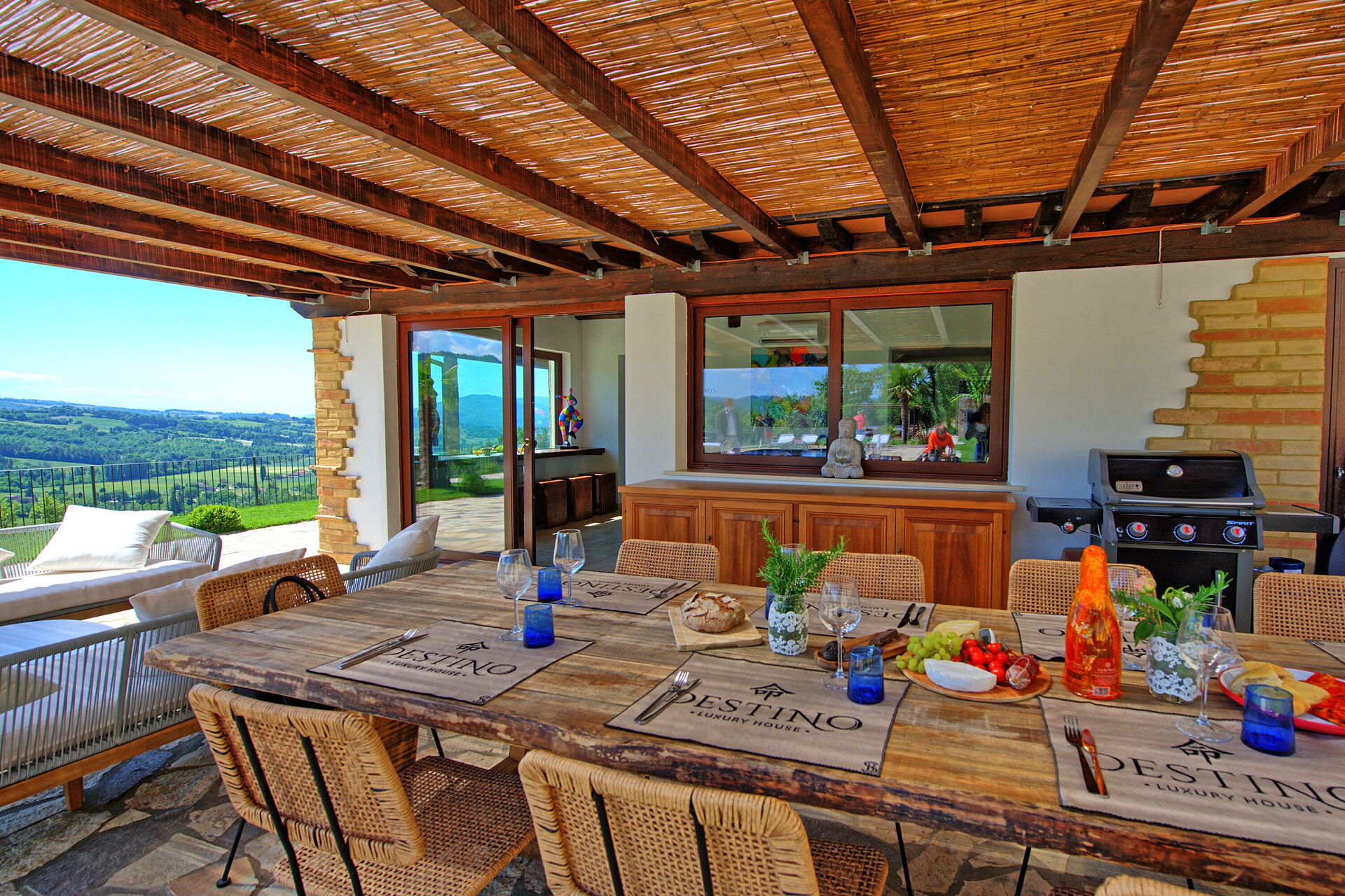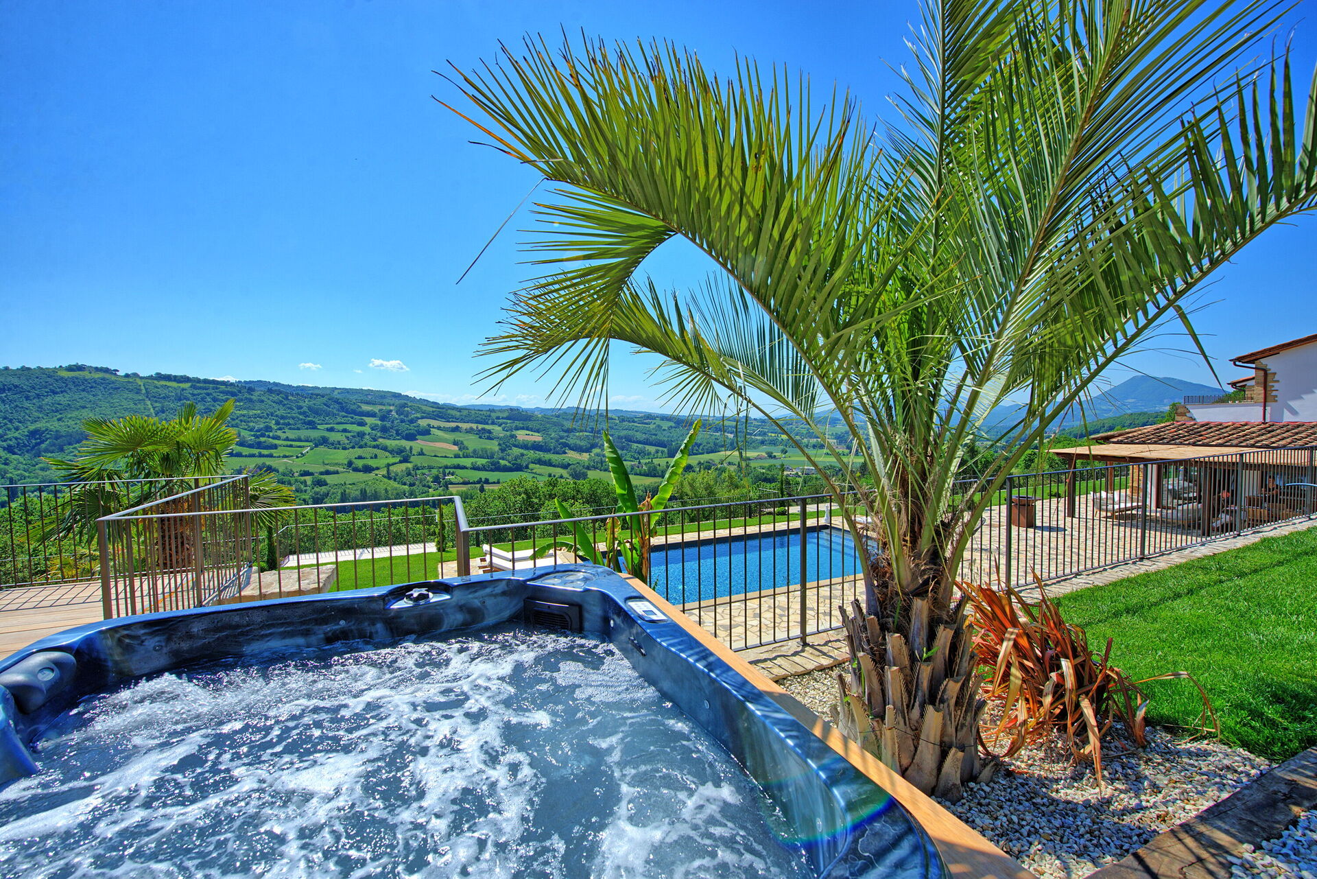 On the outside, Villa Pura offers to its guests a beautiful wide garden with trees and flowers, where you can find a marvellous private swimming pool, a jacuzzi, sunbeds and umbrellas: that is the perfect place to spend the hottest days with your family and friends. There is also a bbq area, covered with a gazebo and equipped with table, chairs and armchairs to easily dine outdoor. From the property, you can enjoy a breathtaking panoramic view over the hills.