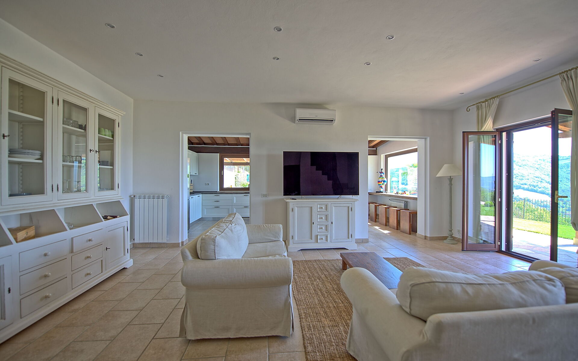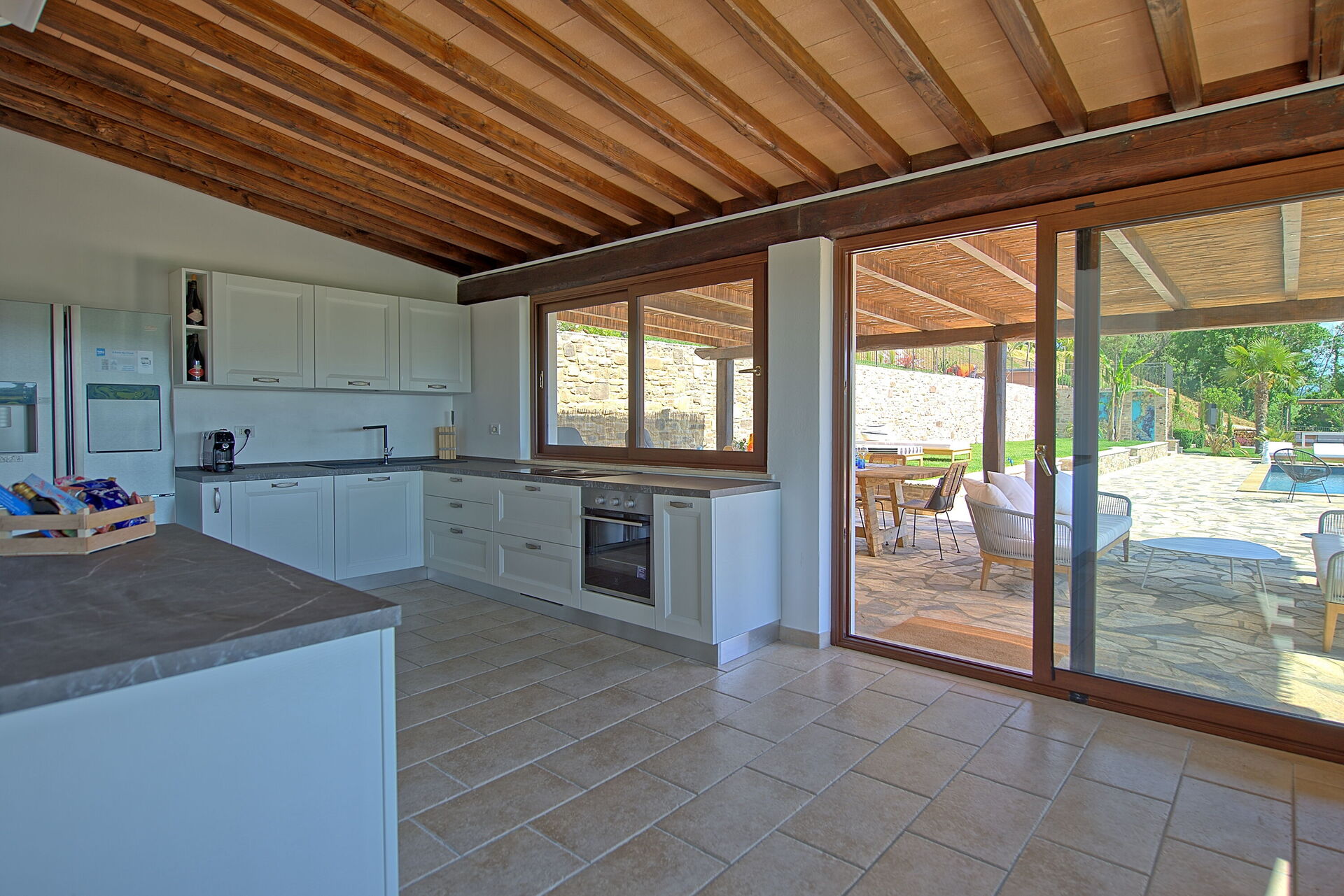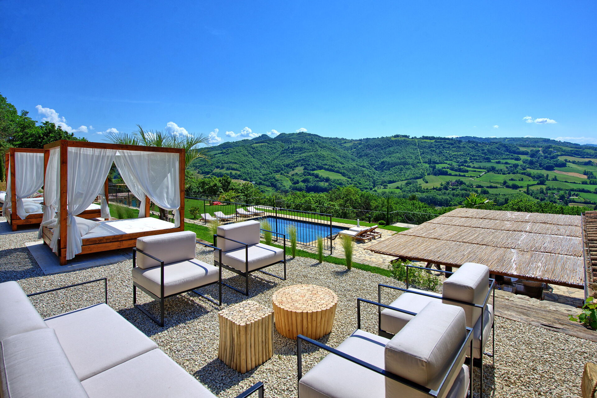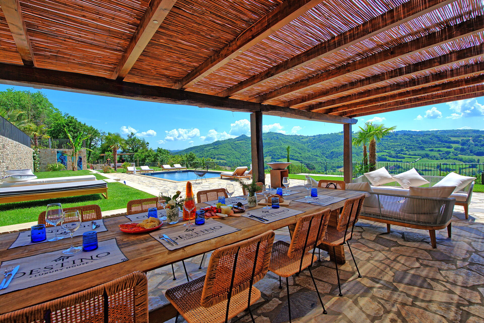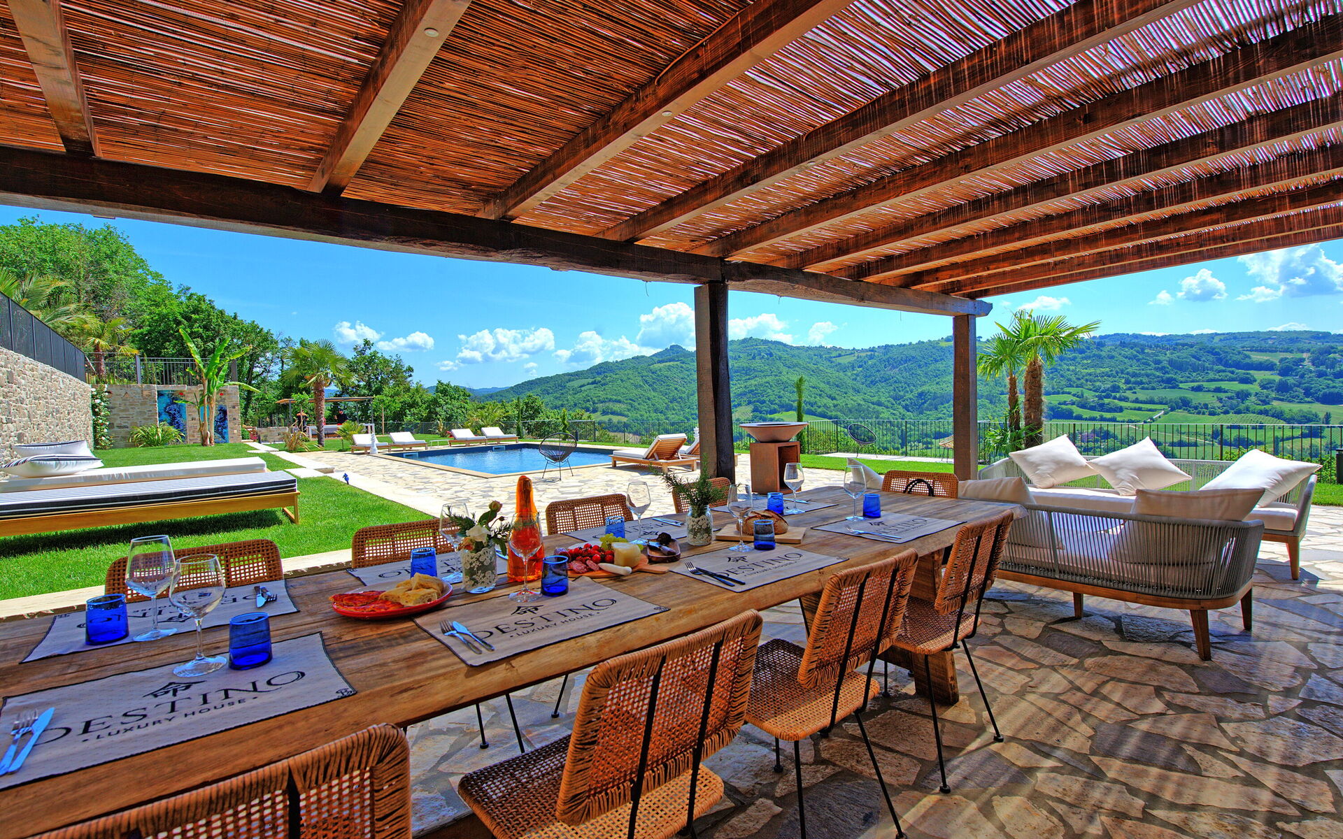 On the outside, Villa Pura offers to its guests a beautiful wide garden with trees and flowers, where you can find a marvellous private swimming pool, a jacuzzi, sunbeds and umbrellas: that is the perfect place to spend the hottest days with your family and friends. There is also a bbq area, covered with a gazebo and equipped with table, chairs and armchairs to easily dine outdoor. From the property, you can enjoy a breathtaking panoramic view over the hills.