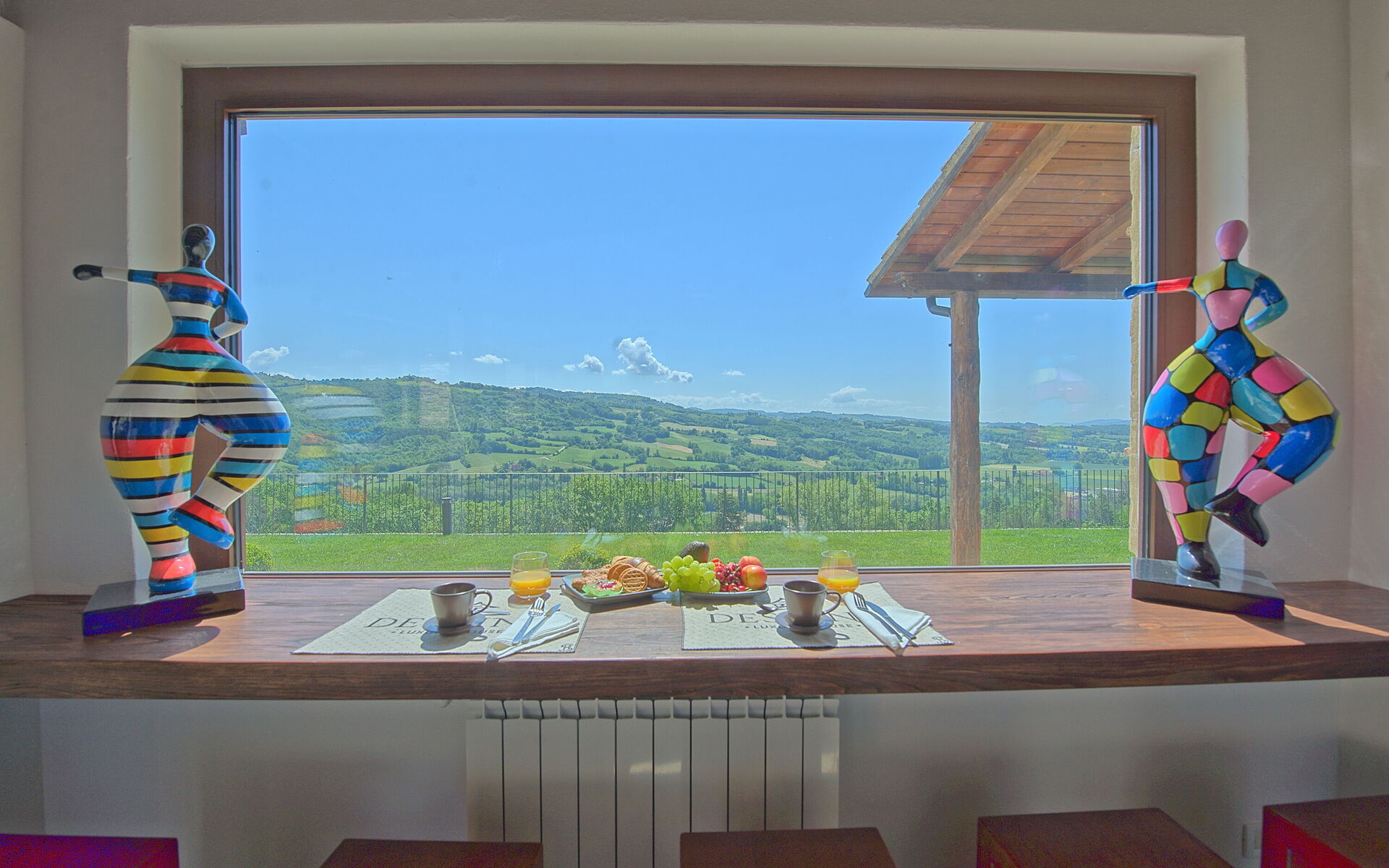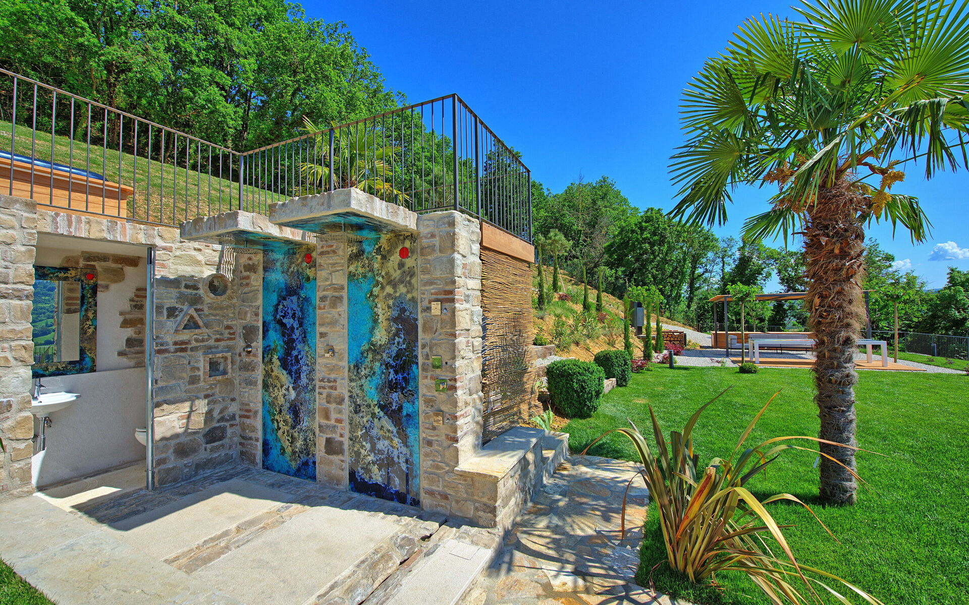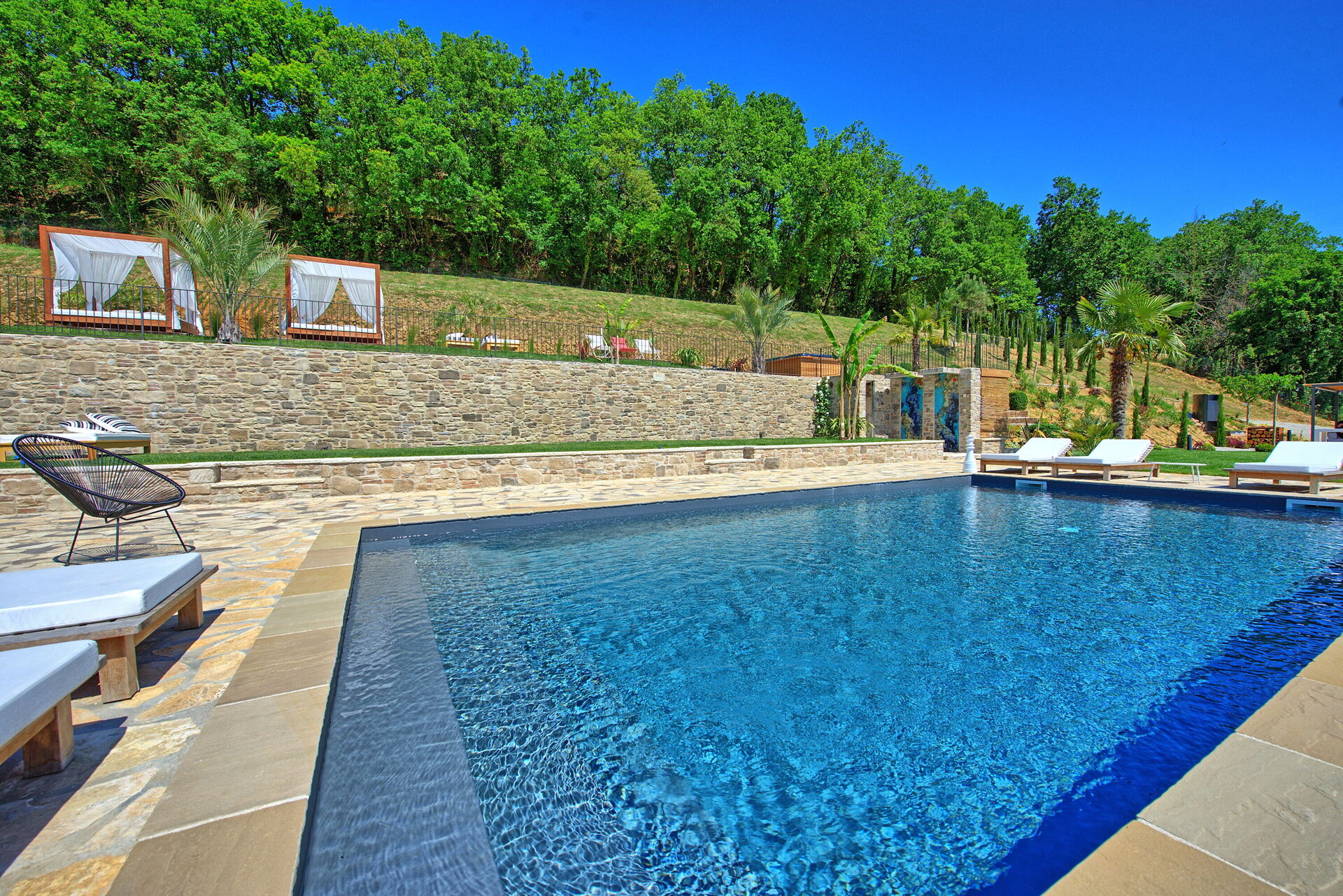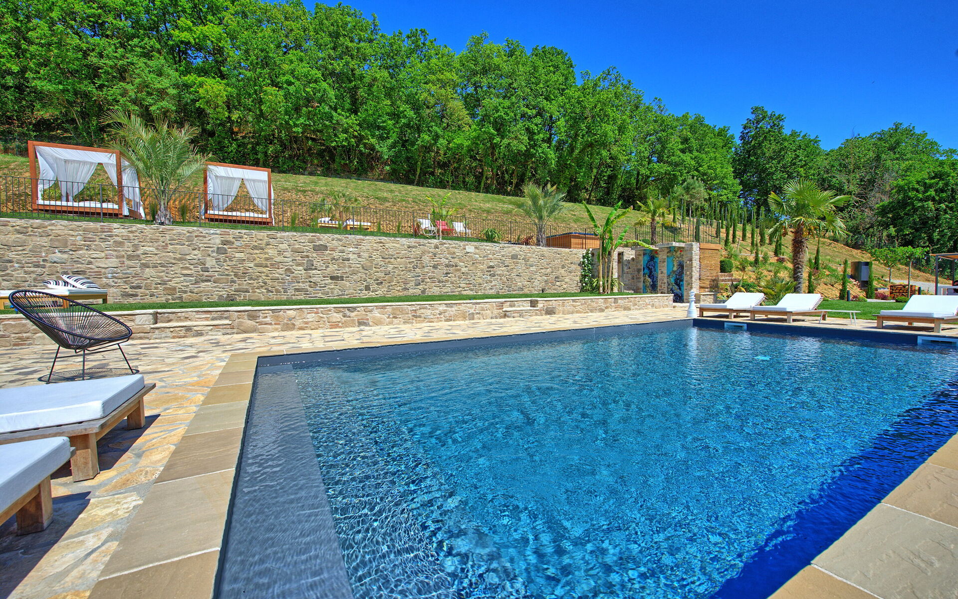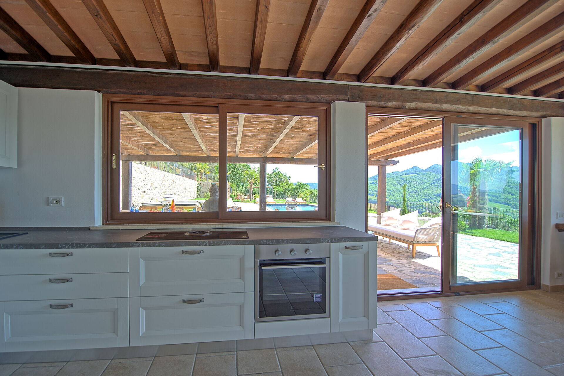 On the outside, Villa Pura offers to its guests a beautiful wide garden with trees and flowers, where you can find a marvellous private swimming pool, a jacuzzi, sunbeds and umbrellas: that is the perfect place to spend the hottest days with your family and friends. There is also a bbq area, covered with a gazebo and equipped with table, chairs and armchairs to easily dine outdoor. From the property, you can enjoy a breathtaking panoramic view over the hills.