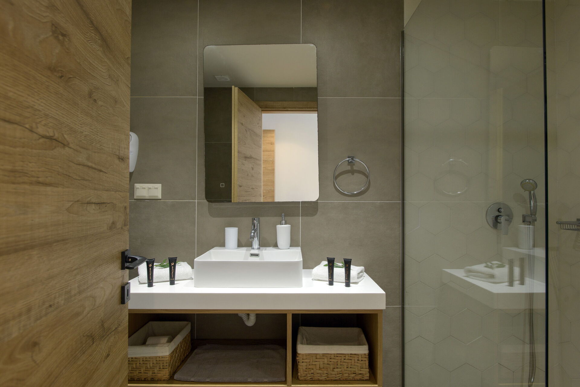 Begane grond: leefruimte met woonkamer (smart TV), eethoek en keuken (oven, vriezer, vaatwasser, magnetron, broodrooster, waterkoker en koffiezetapparaat); WC; 2 slaapkamers, elk met eigen badkamer met douche; slaapkamer met 2 eenpersoonsbedden (kunnen op aanvraag worden samengevoegd) en eigen badkamer met douche.