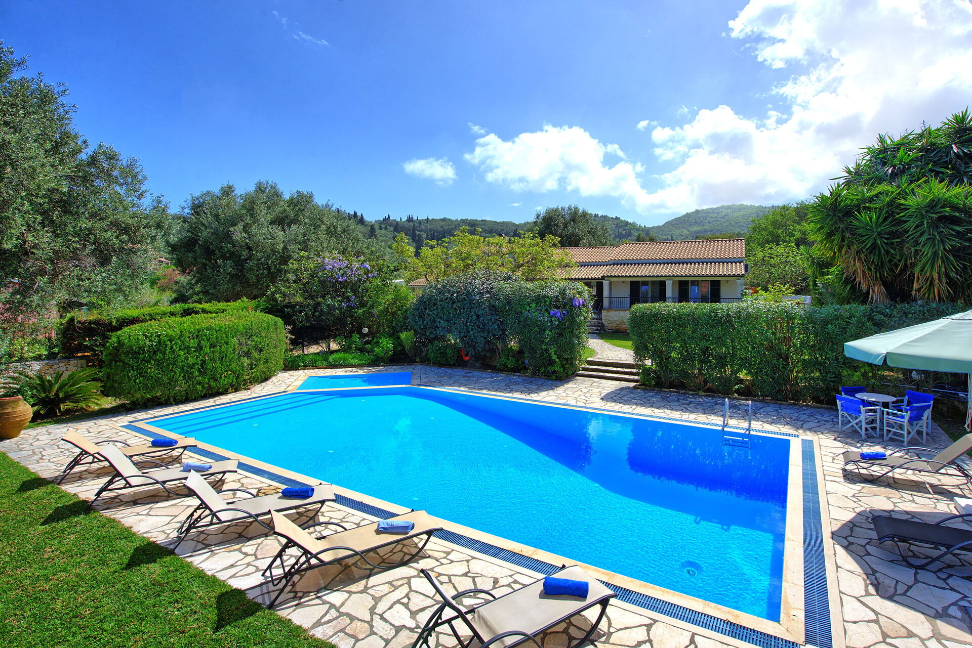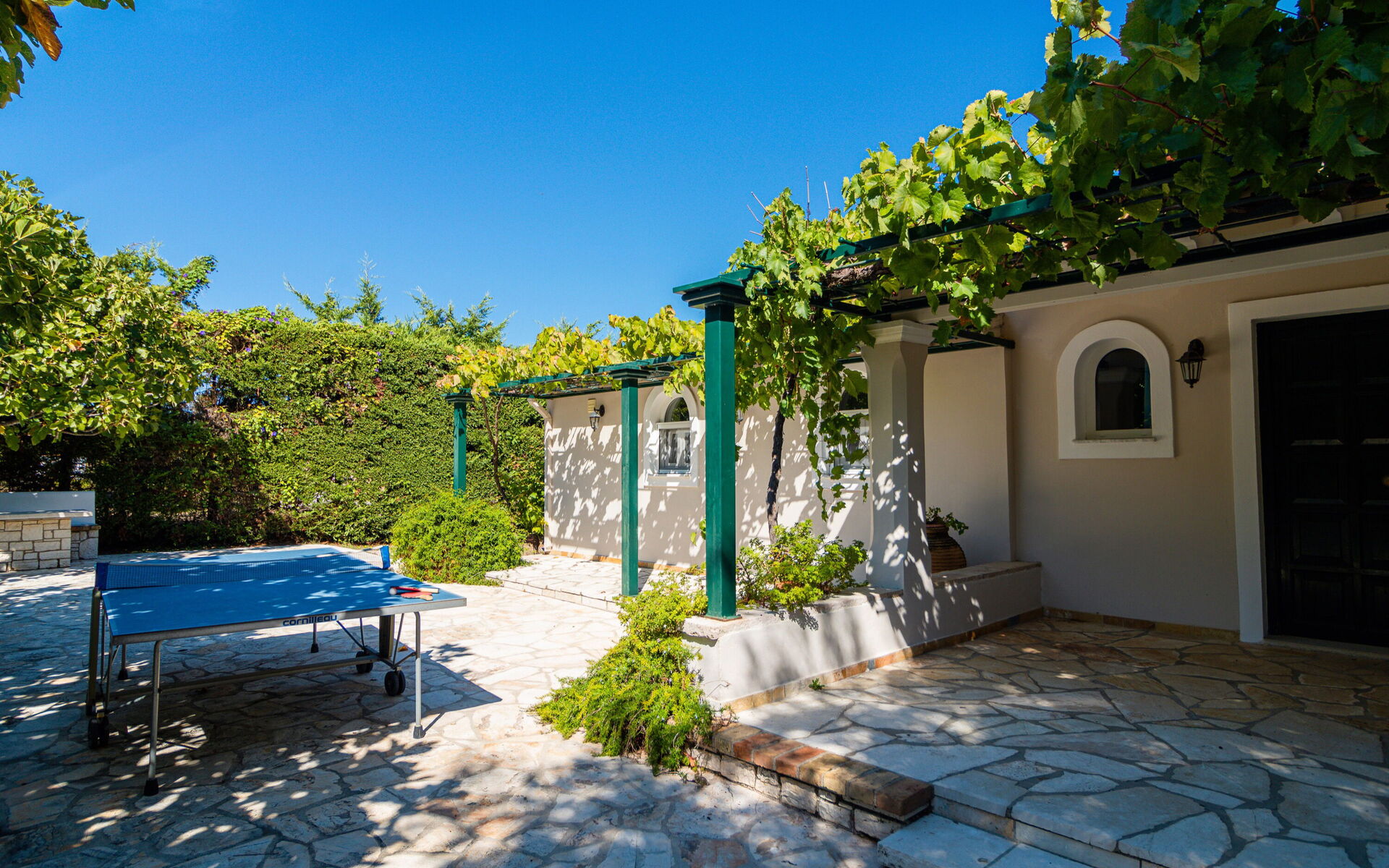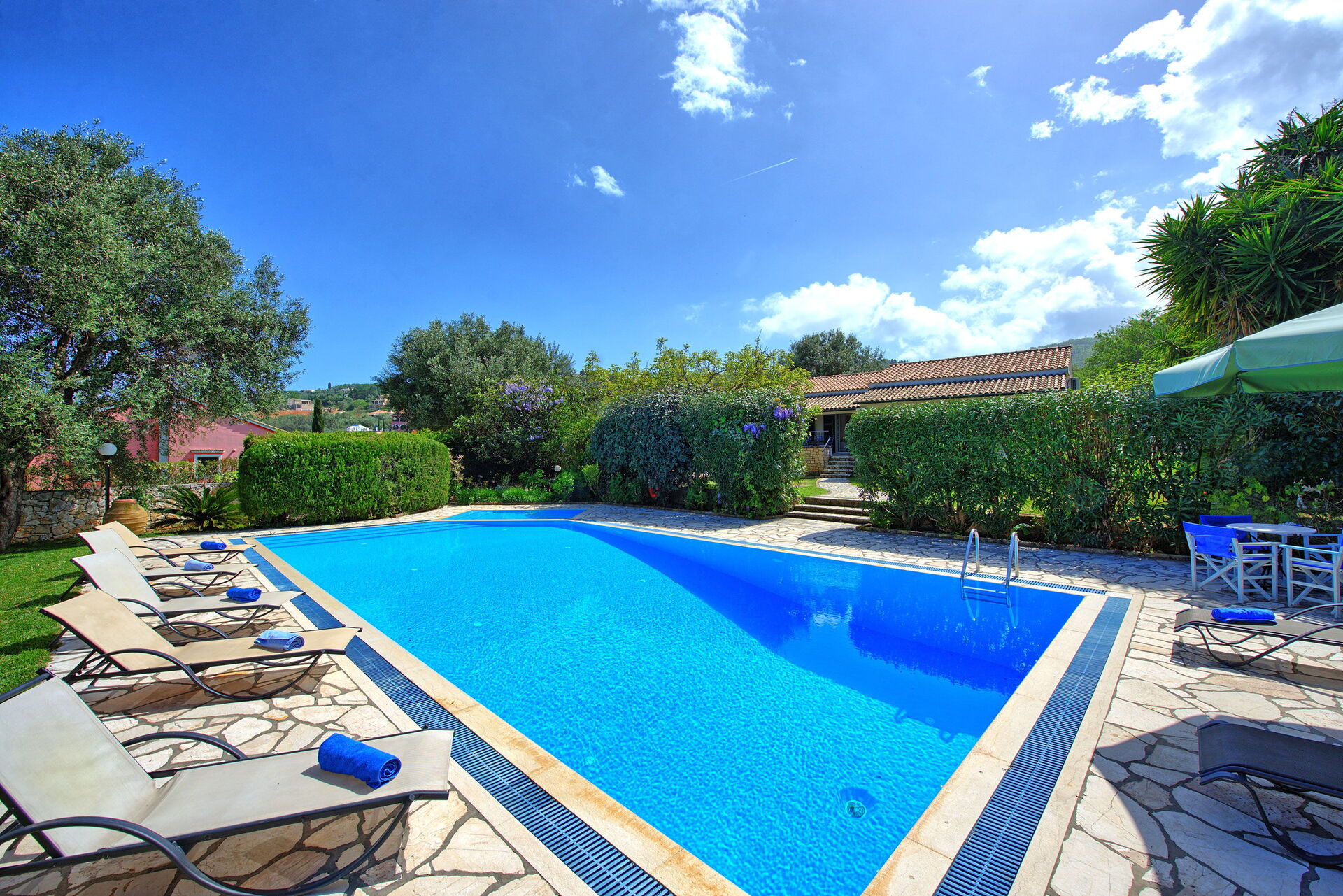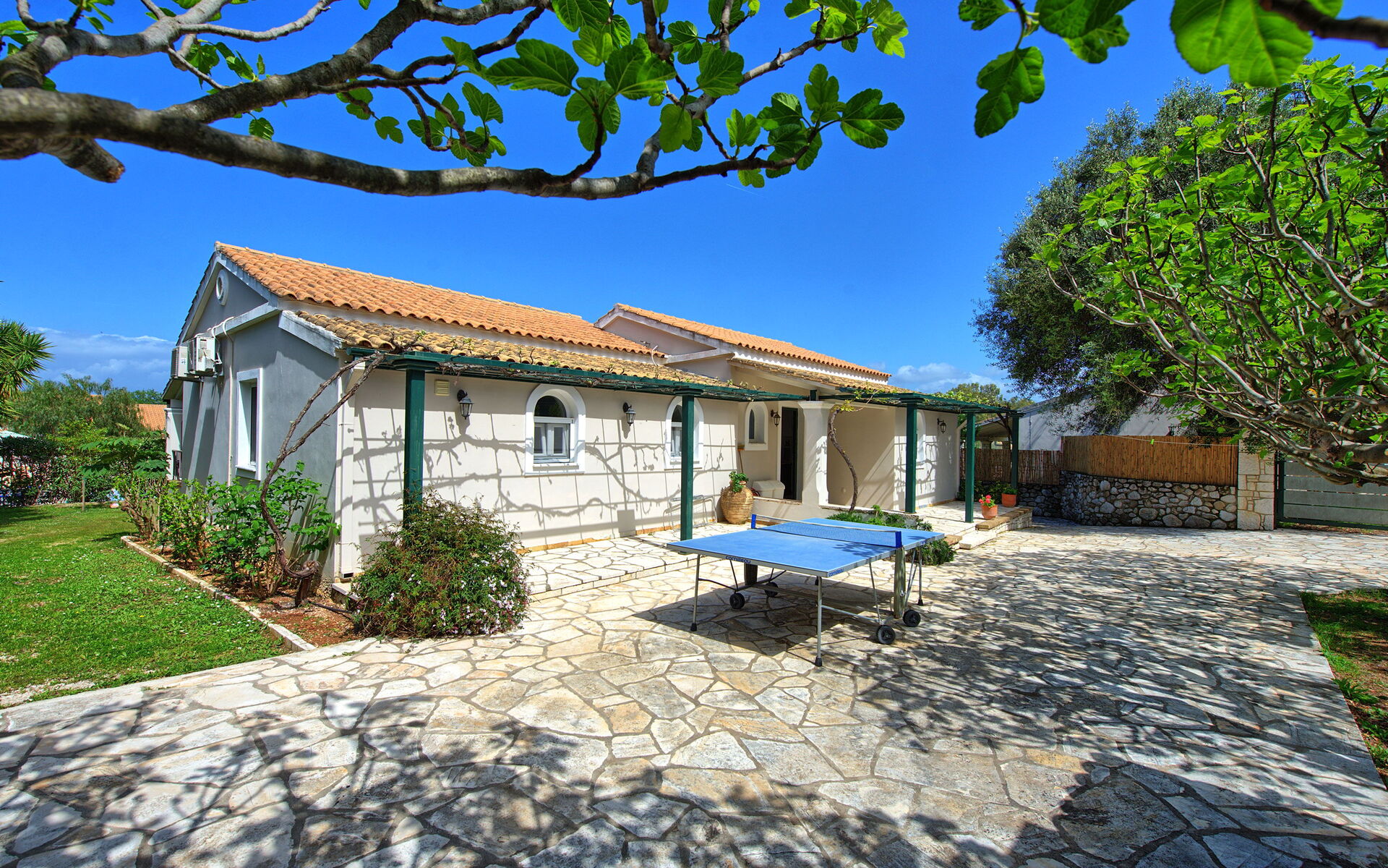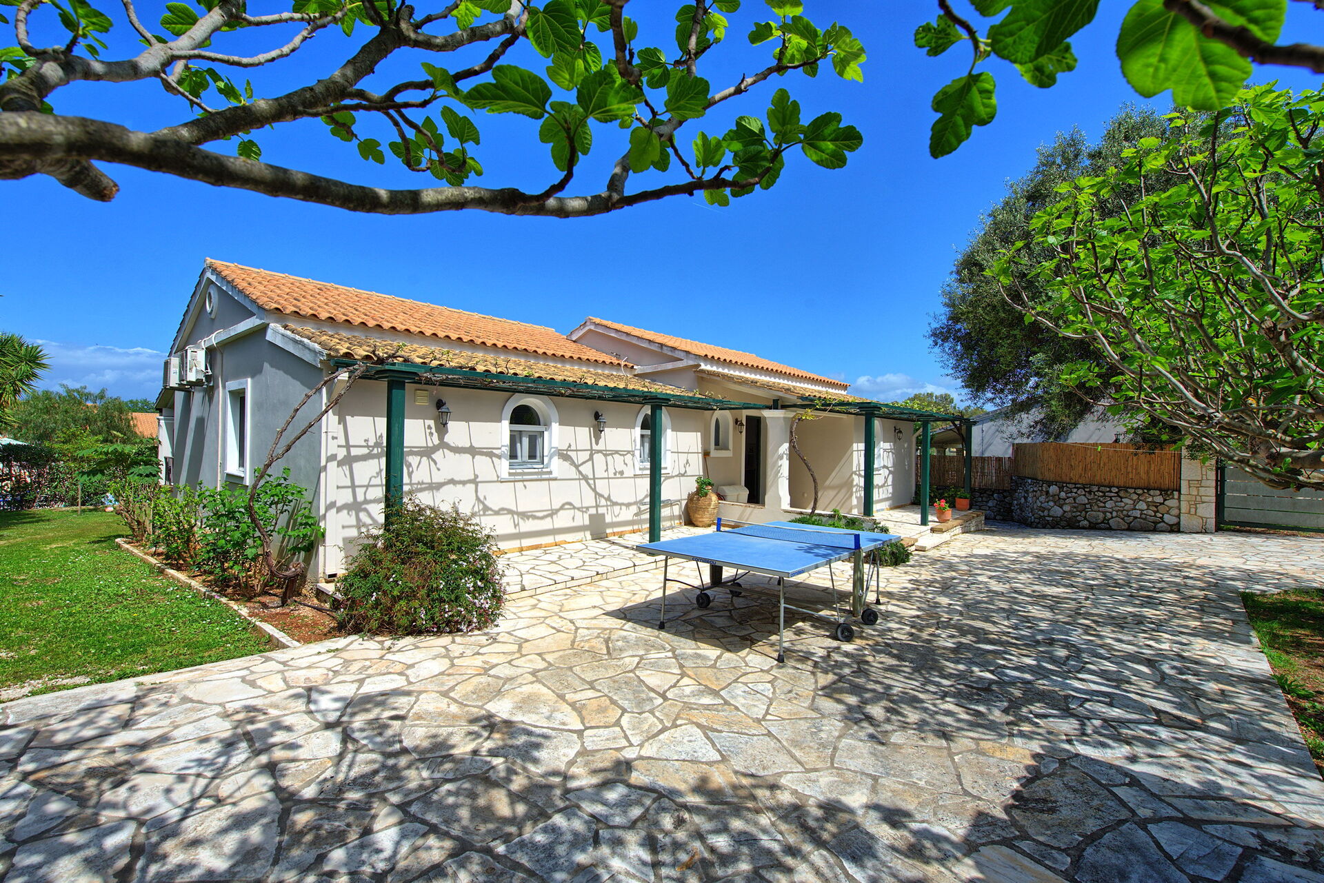 Ter beschikking van de gasten van de villa: privétuin ingericht om buiten te eten; privé zwembad (12,5 x 6,50 meter; minimale diepte 0,80 meter; maximale diepte: 3,00 meter; een deel van het zwembad heeft een ondiep gedeelte ideaal voor kleine kinderen); nabijheid van de zee en de stad Kassiopi; Ping-pong tafel; airconditioning; Wifi-internet; parkeren
