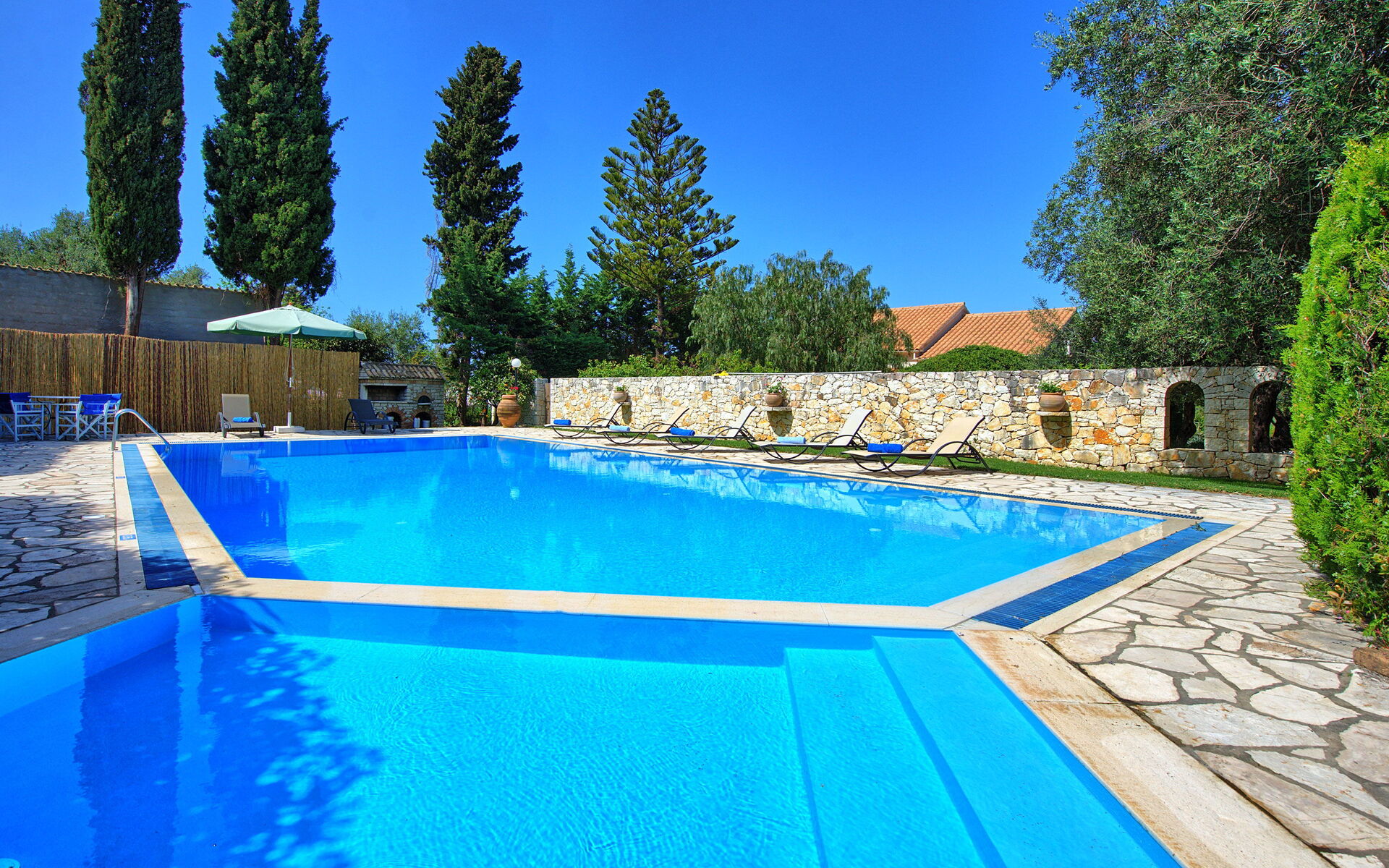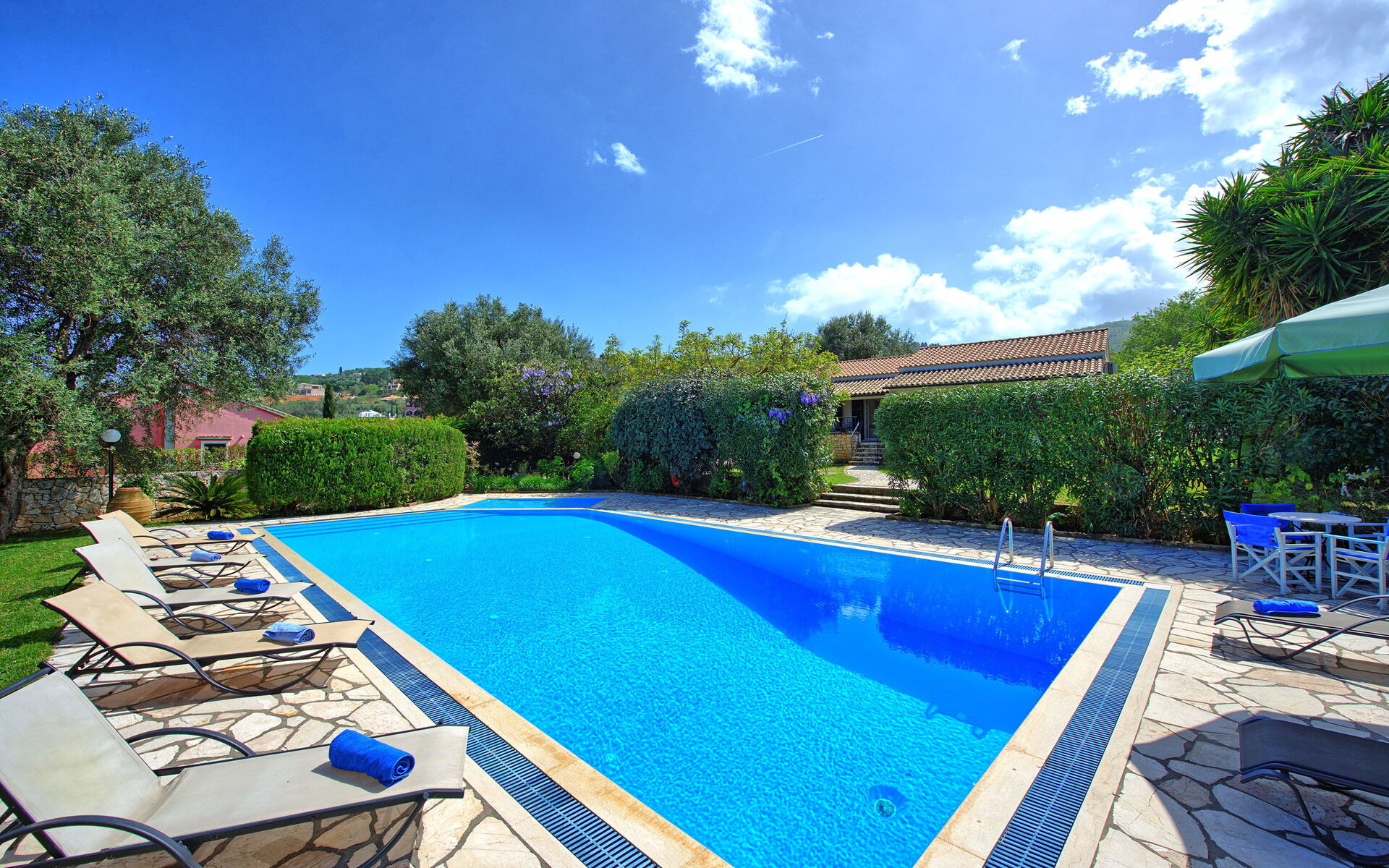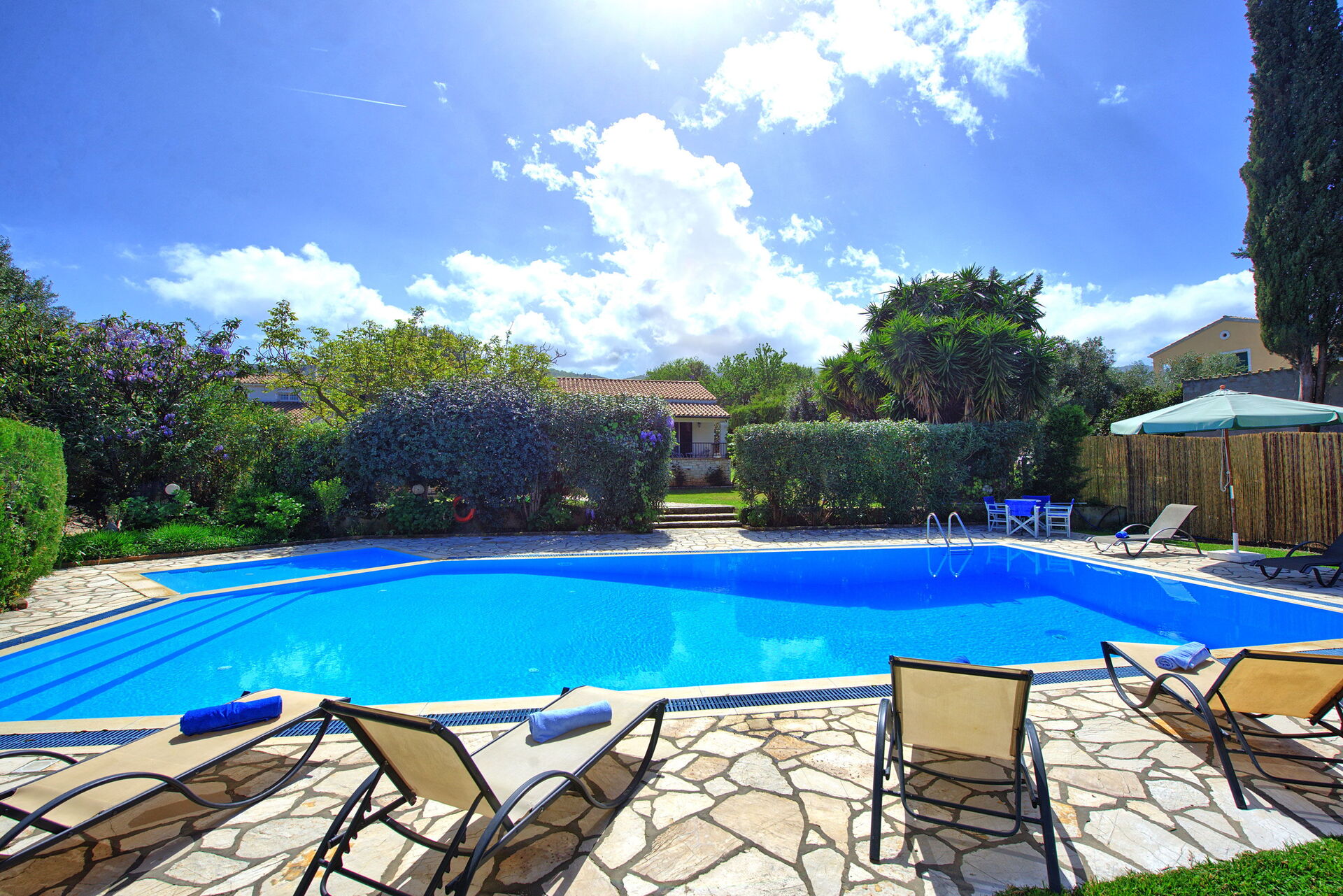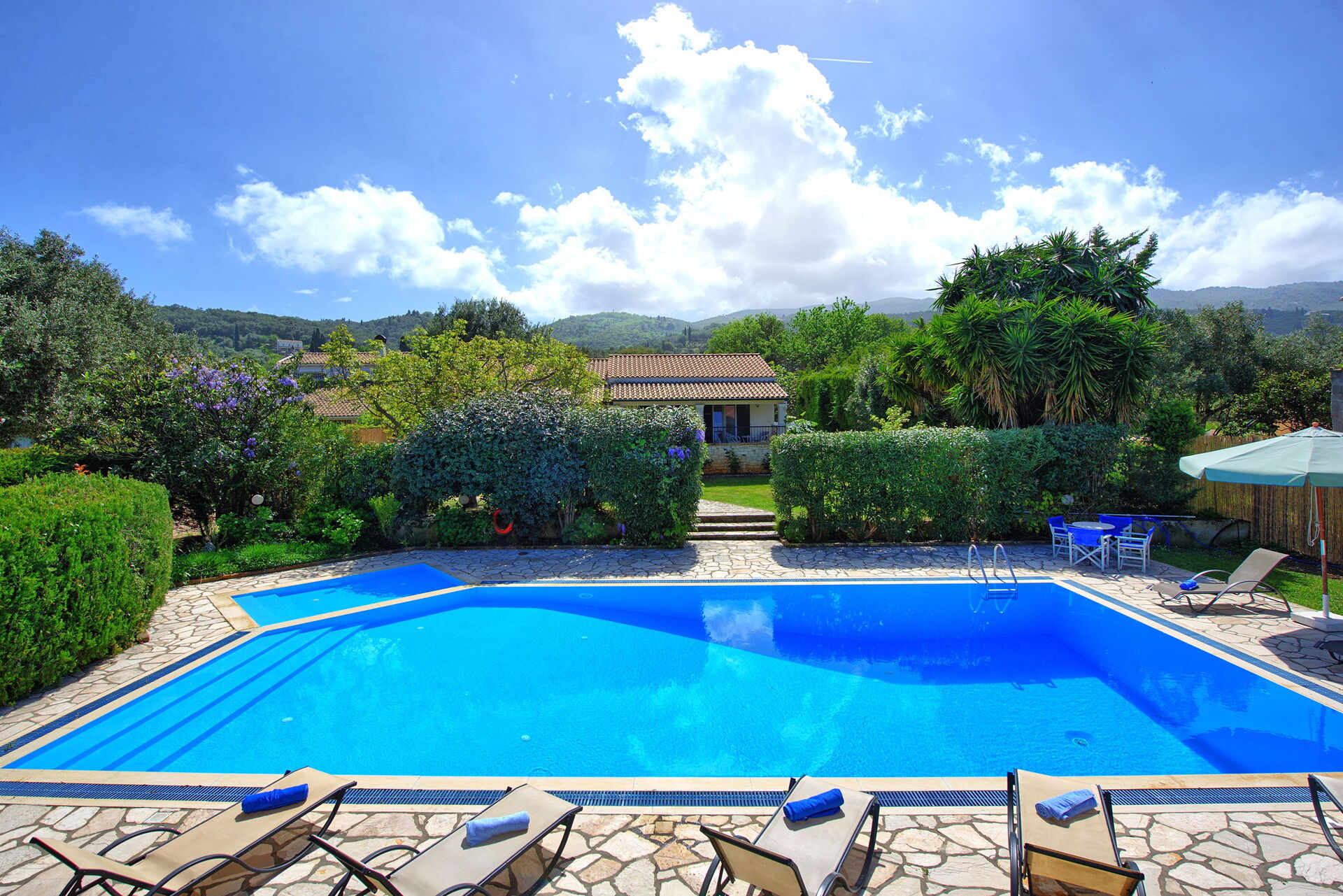 Ter beschikking van de gasten van de villa: privétuin ingericht om buiten te eten; privé zwembad (12,5 x 6,50 meter; minimale diepte 0,80 meter; maximale diepte: 3,00 meter; een deel van het zwembad heeft een ondiep gedeelte ideaal voor kleine kinderen); nabijheid van de zee en de stad Kassiopi; Ping-pong tafel; airconditioning; Wifi-internet; parkeren