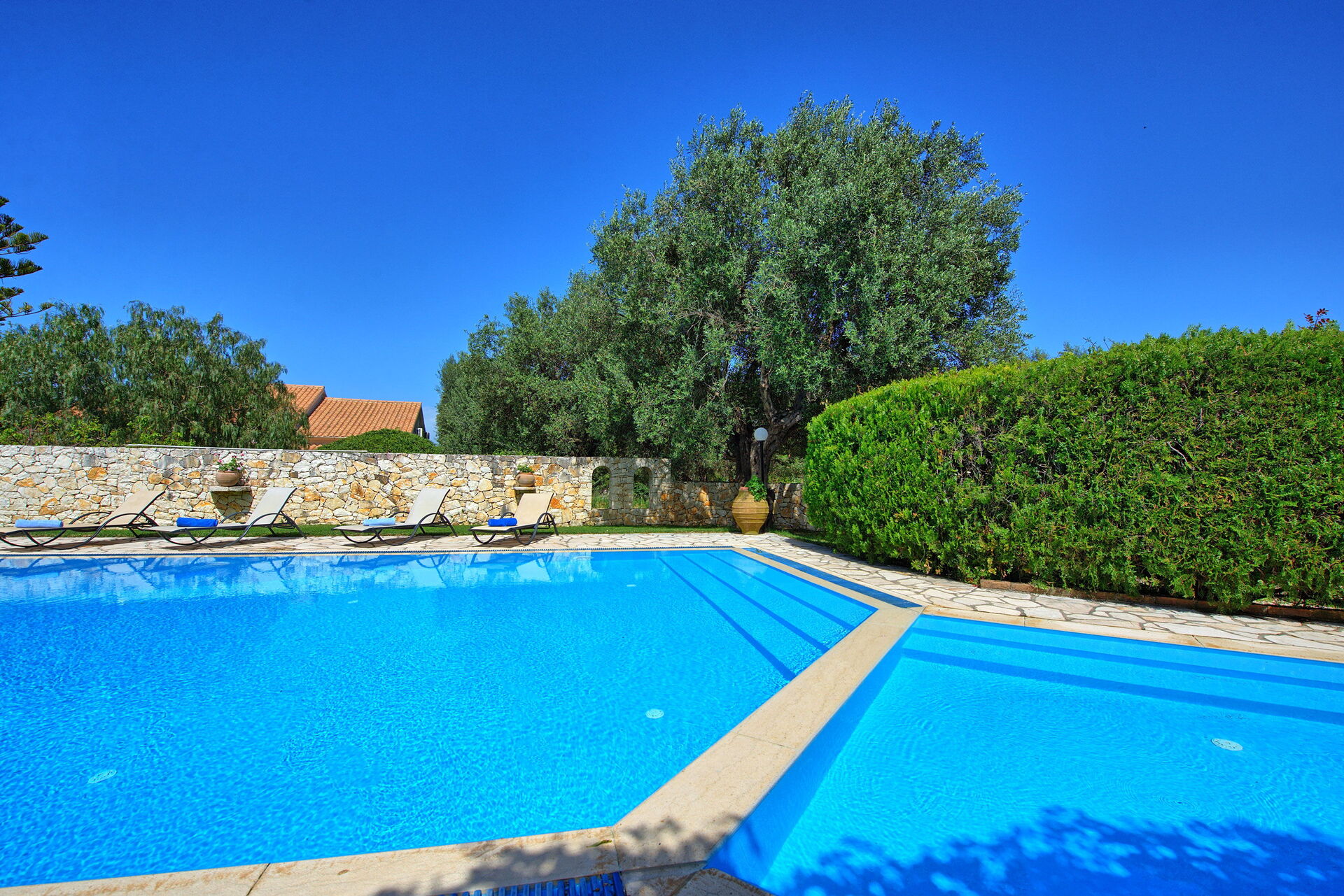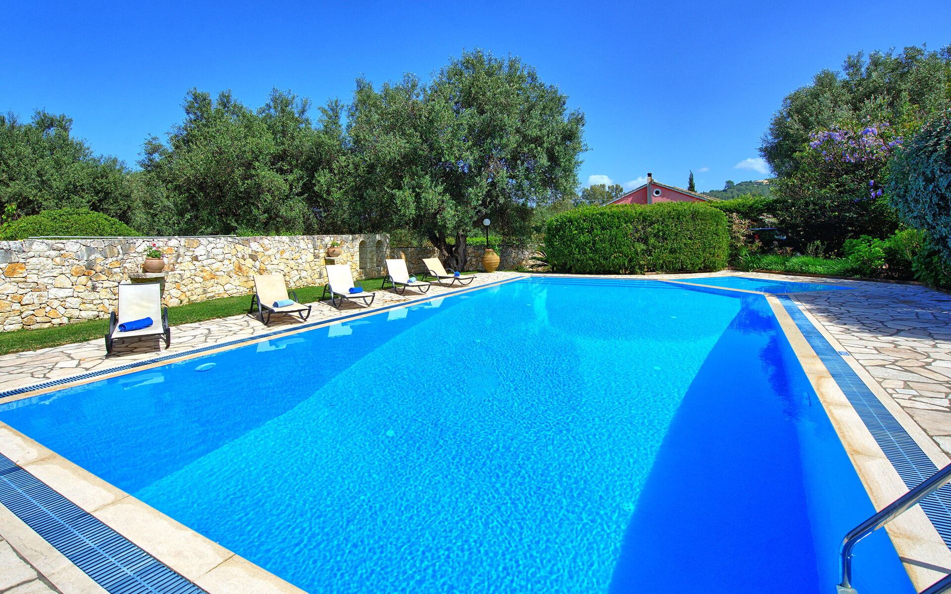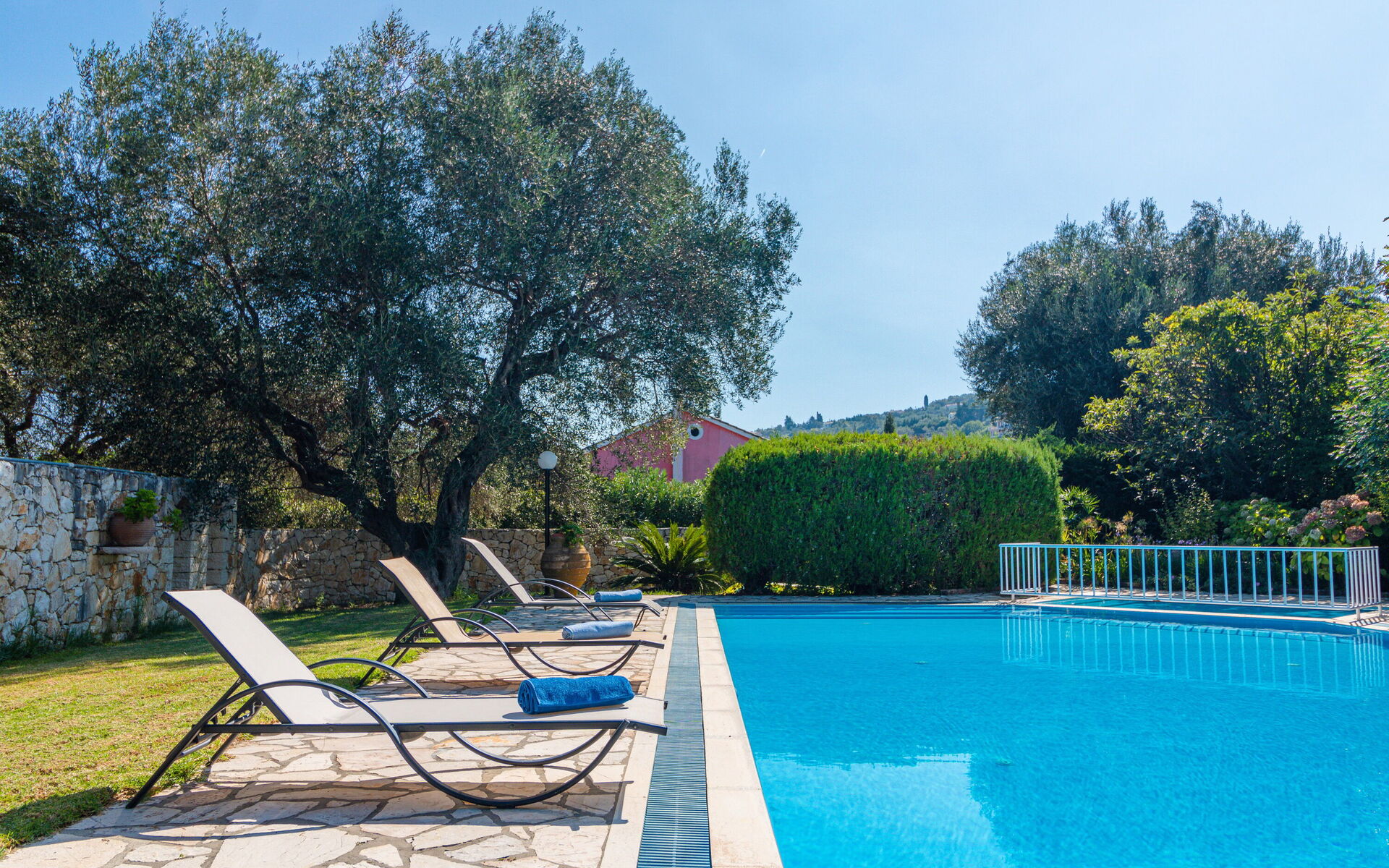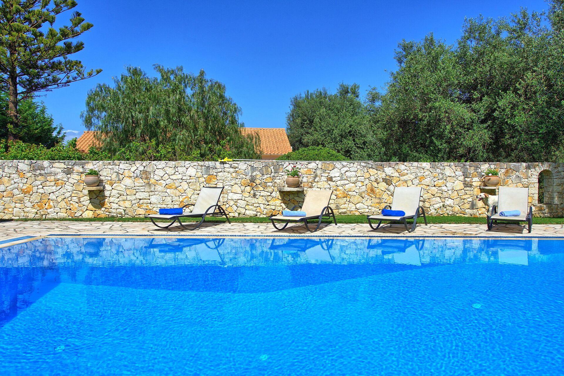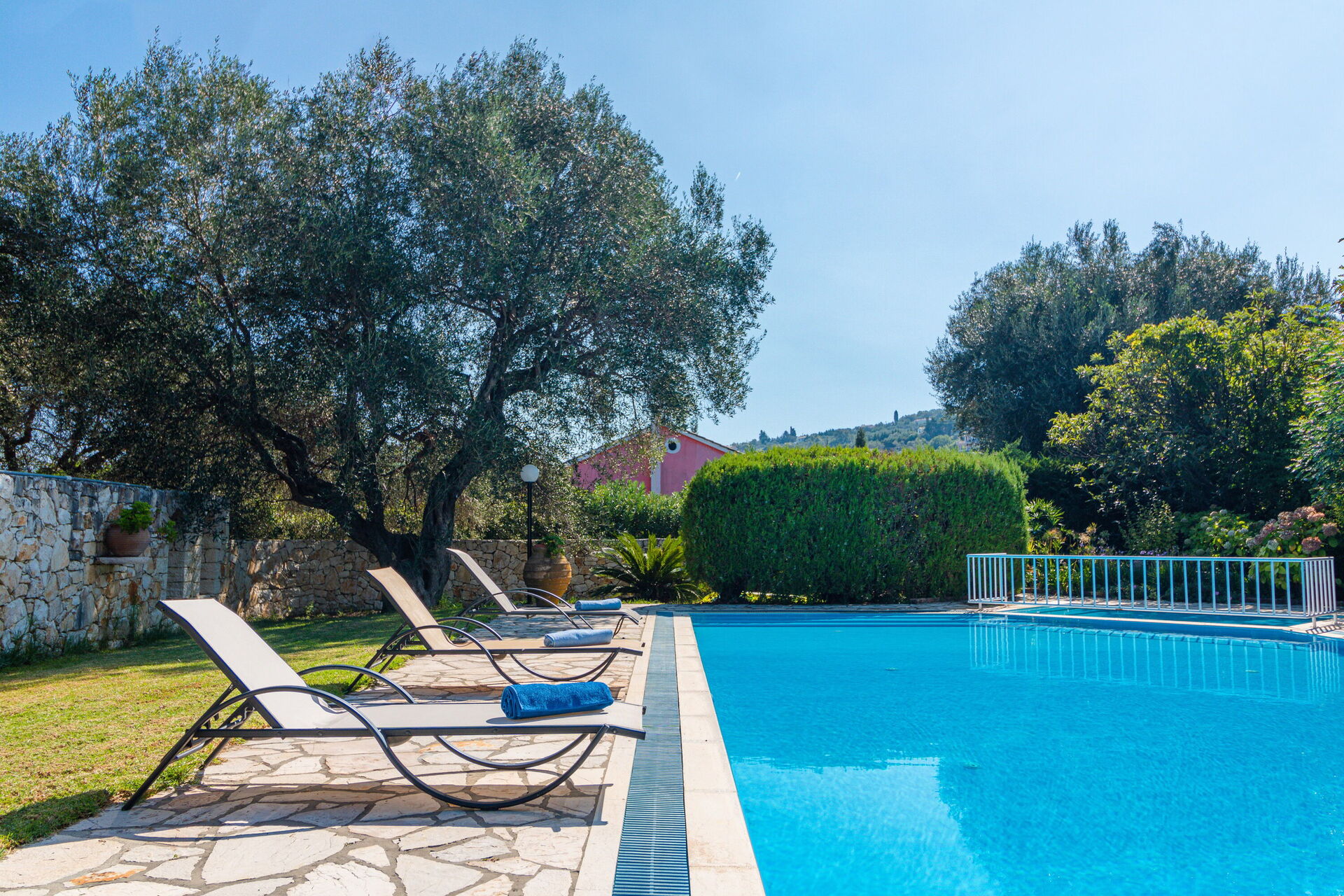 Ter beschikking van de gasten van de villa: privétuin ingericht om buiten te eten; privé zwembad (12,5 x 6,50 meter; minimale diepte 0,80 meter; maximale diepte: 3,00 meter; een deel van het zwembad heeft een ondiep gedeelte ideaal voor kleine kinderen); nabijheid van de zee en de stad Kassiopi; Ping-pong tafel; airconditioning; Wifi-internet; parkeren