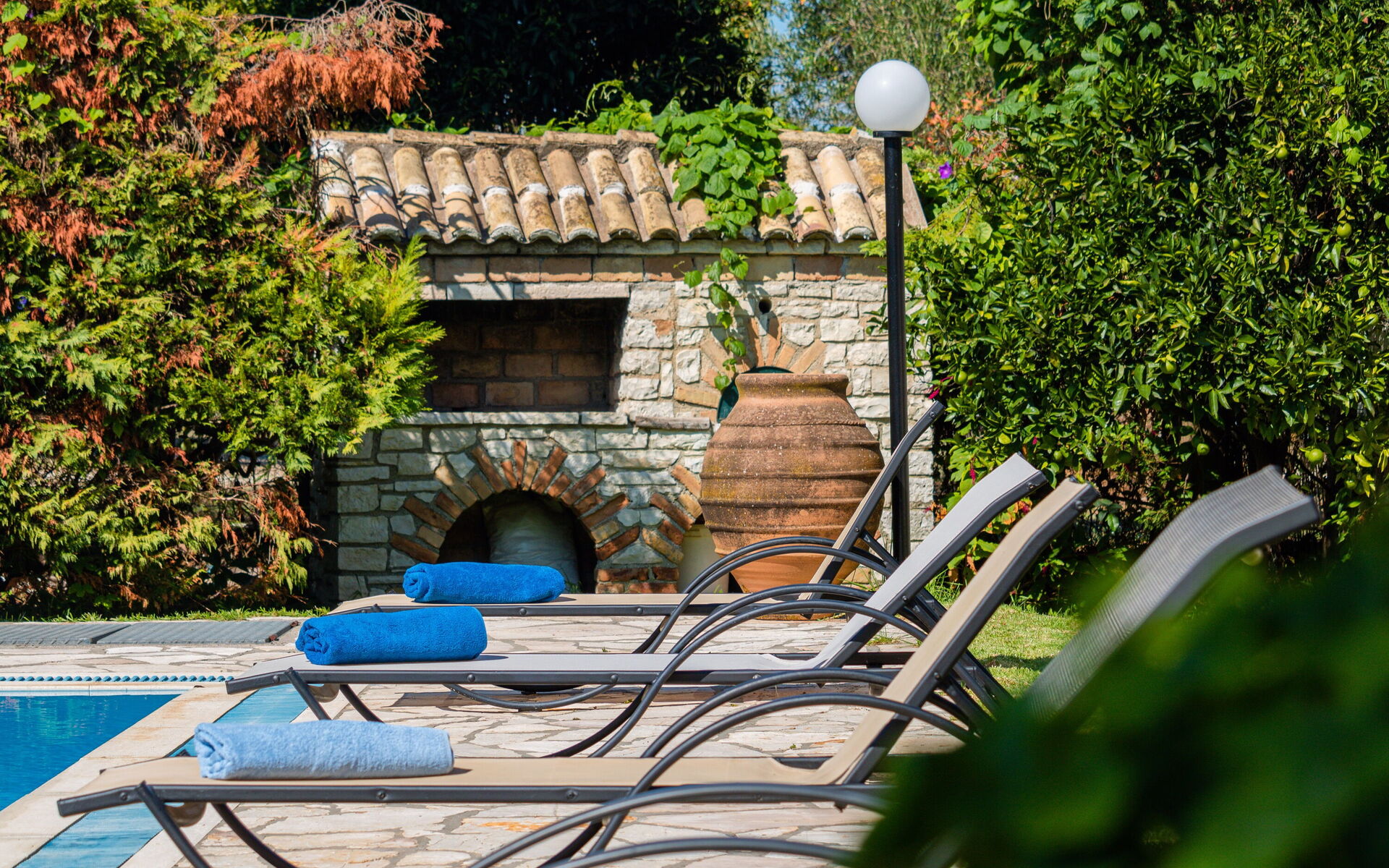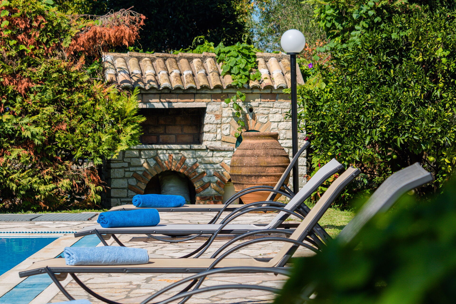 Buiten heeft de villa een tuin met een zwembad en een barbecue met tafel en stoelen om buiten te dineren.