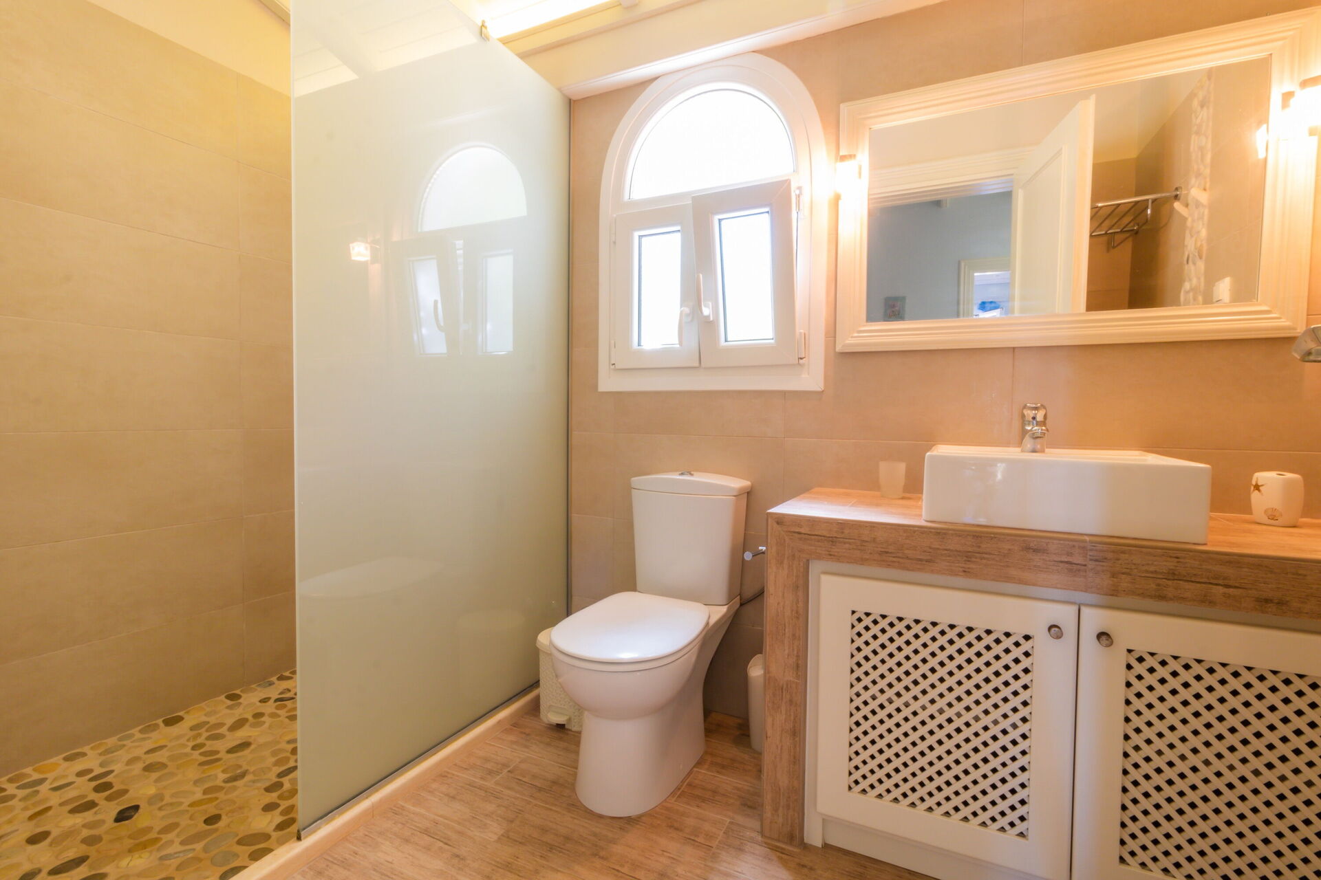 Begane grond: ruime woonkamer met keuken (vaatwasser, magnetron, oven, kookplaat), eetkamer en woonkamer, hoofdslaapkamer met ensuite badkamer met douche en directe toegang tot de patio, twee slaapkamers met twee eenpersoonsbedden die verbonden zijn met de patio, badkamer met douche, badkamer met douche en een wasmachine.