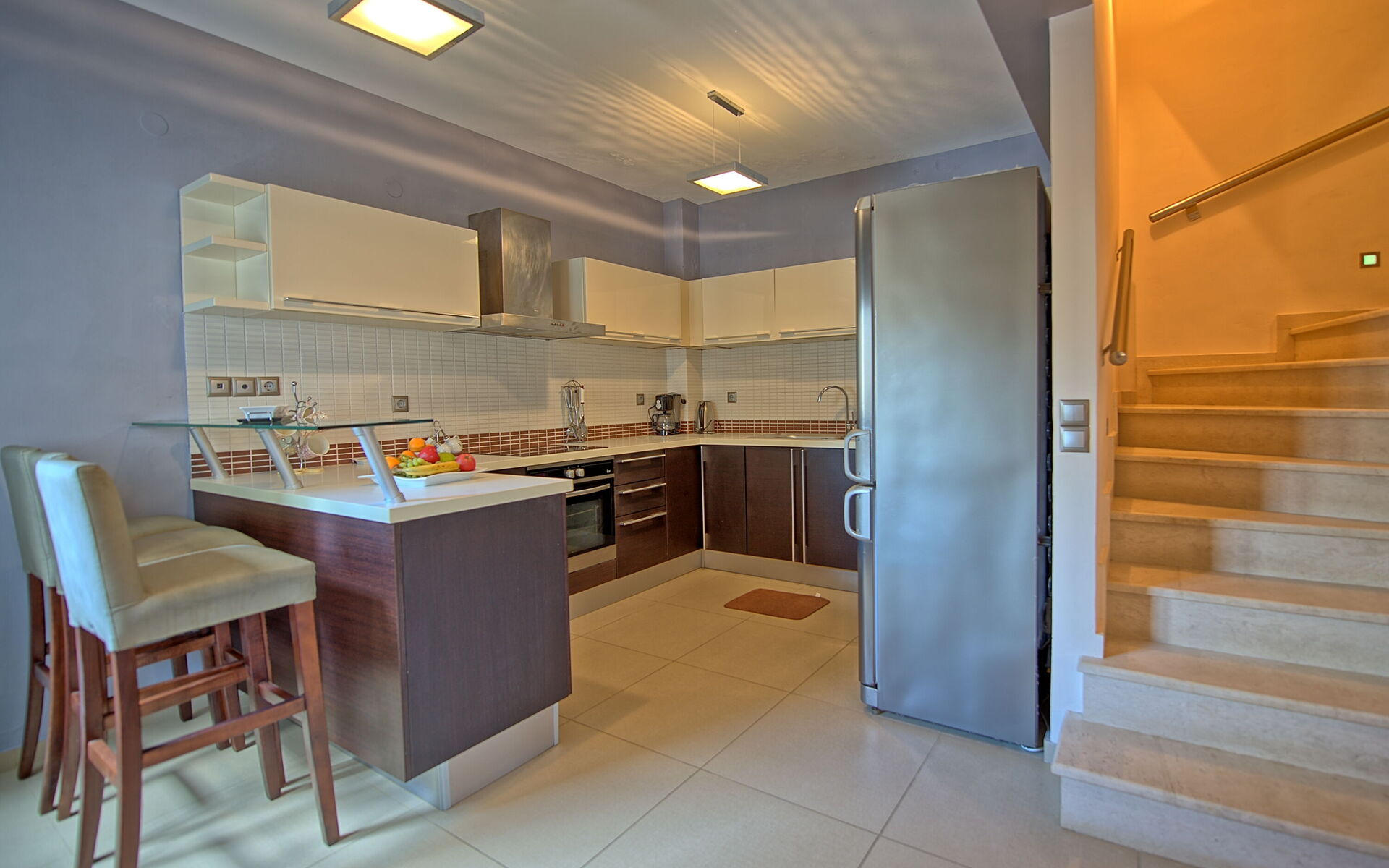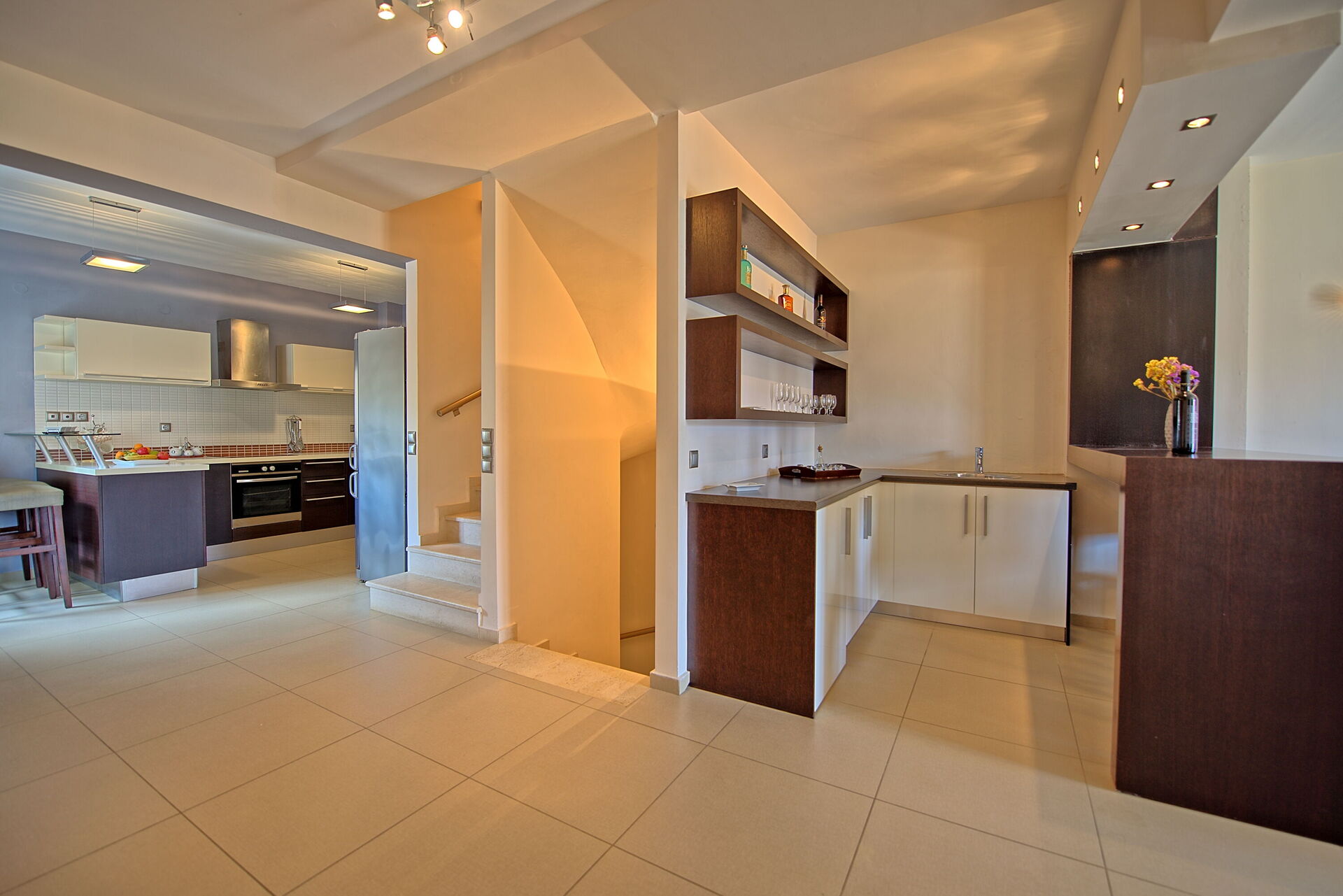 Eerste verdieping: grote woonkamer (satelliet TV) met eethoek, barhoek (koelkast) en keuken (oven, vriezer, vaatwasser, Amerikaans koffiezetapparaat magnetron); deze verdieping heeft ook directe toegang naar buiten.