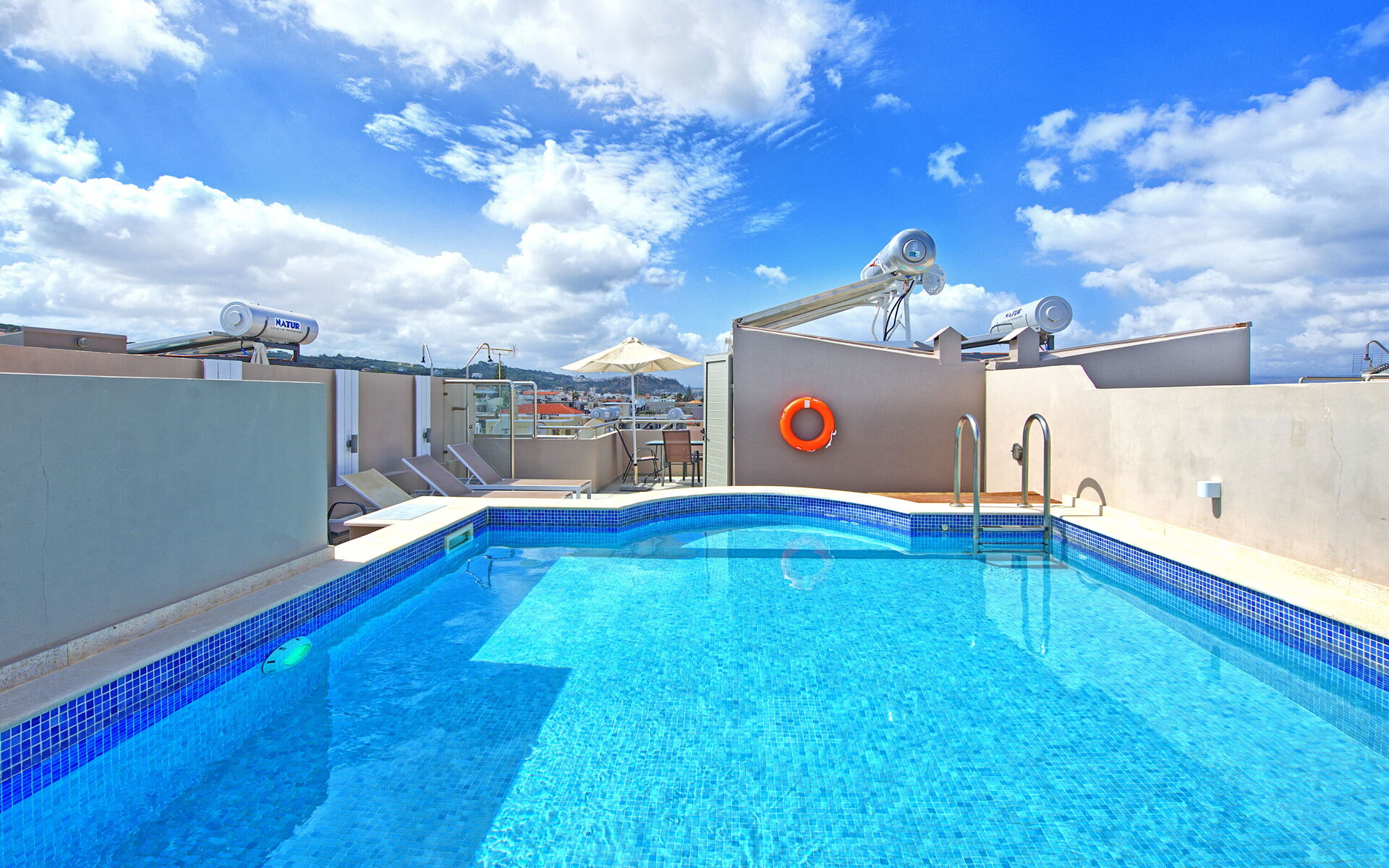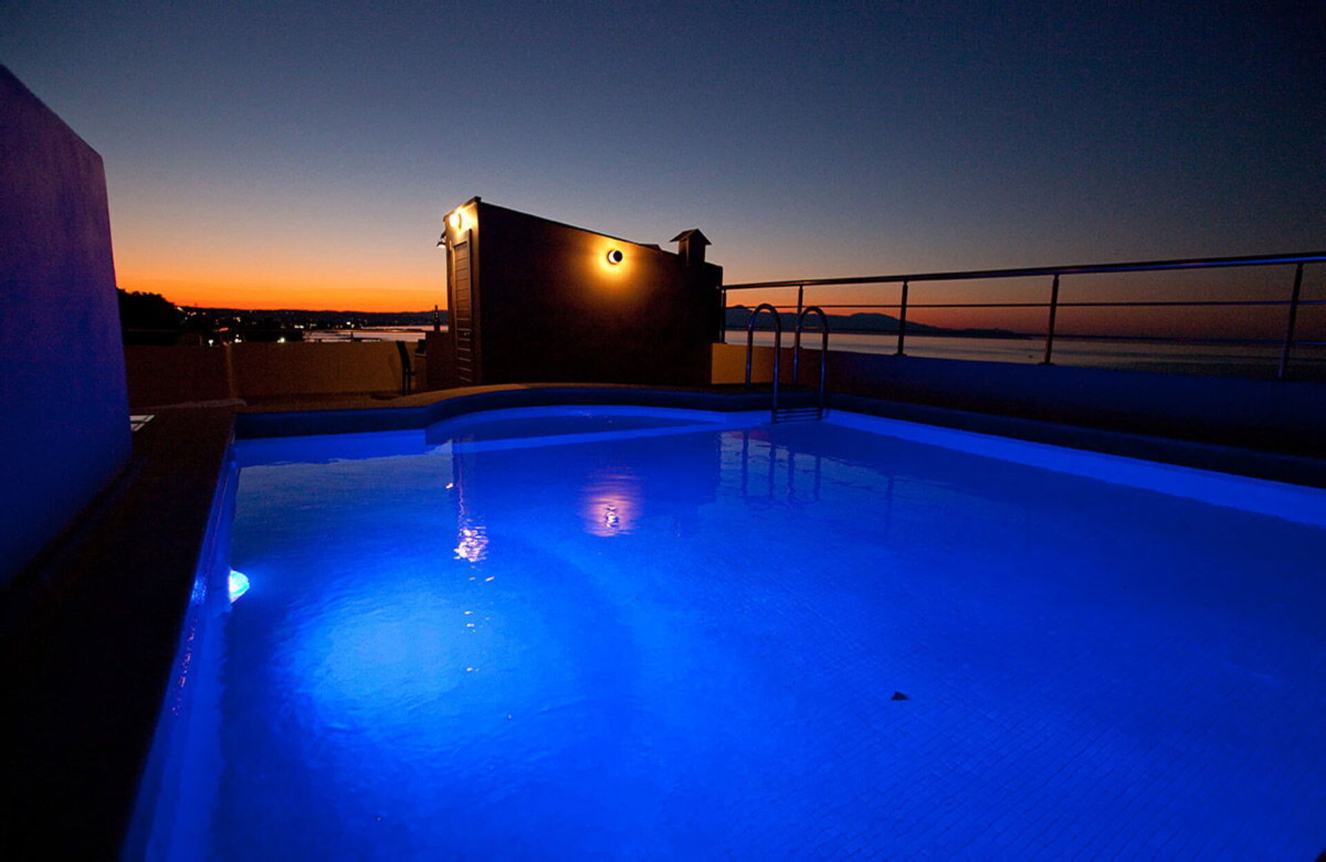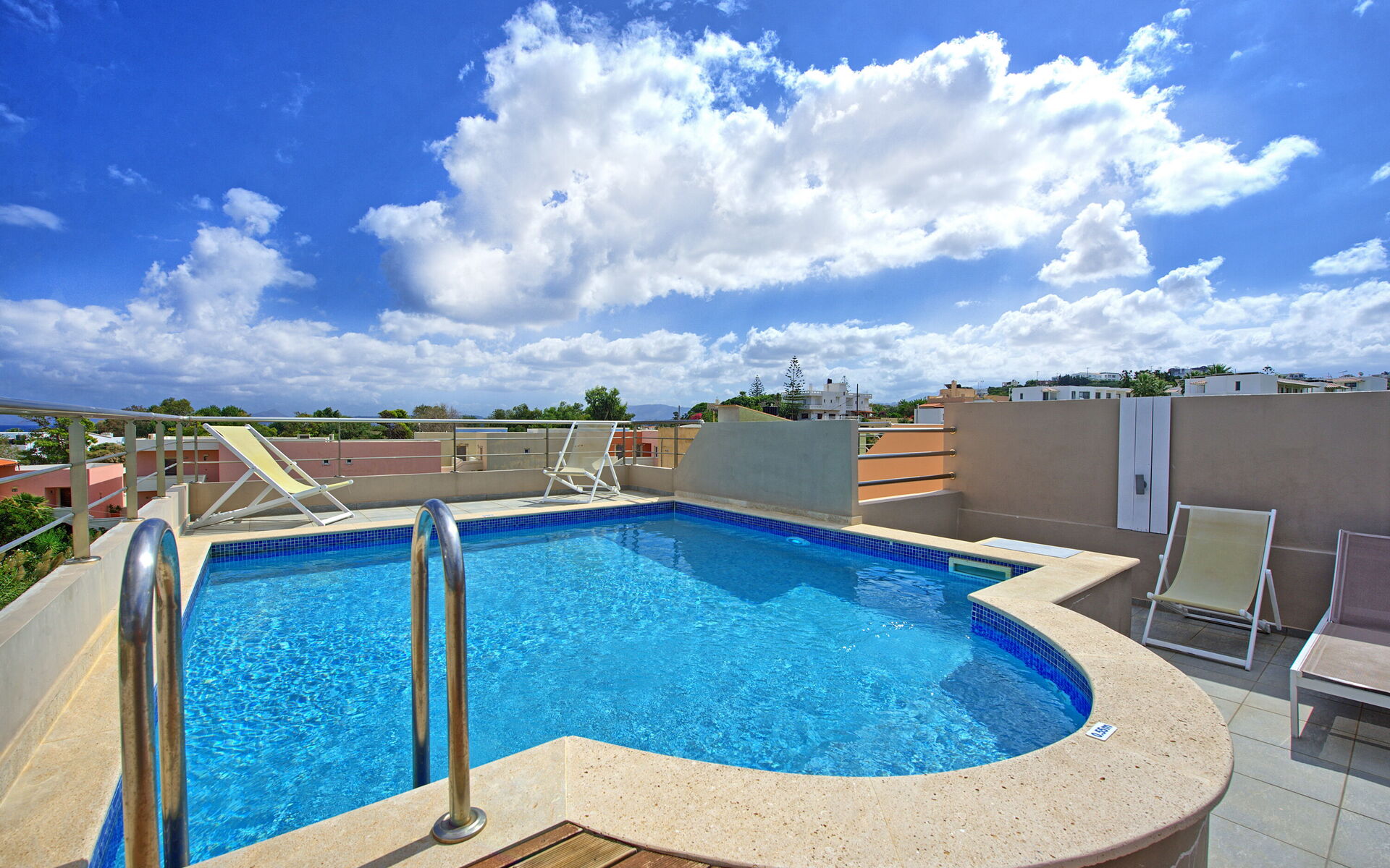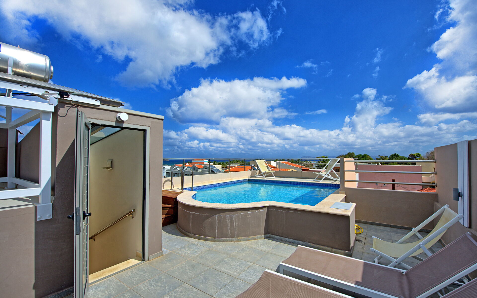Derde verdieping: terras met panoramisch uitzicht en privézwembad (diepte: 0,55 meter), buitendouche, tafel en stoelen om buiten te eten.