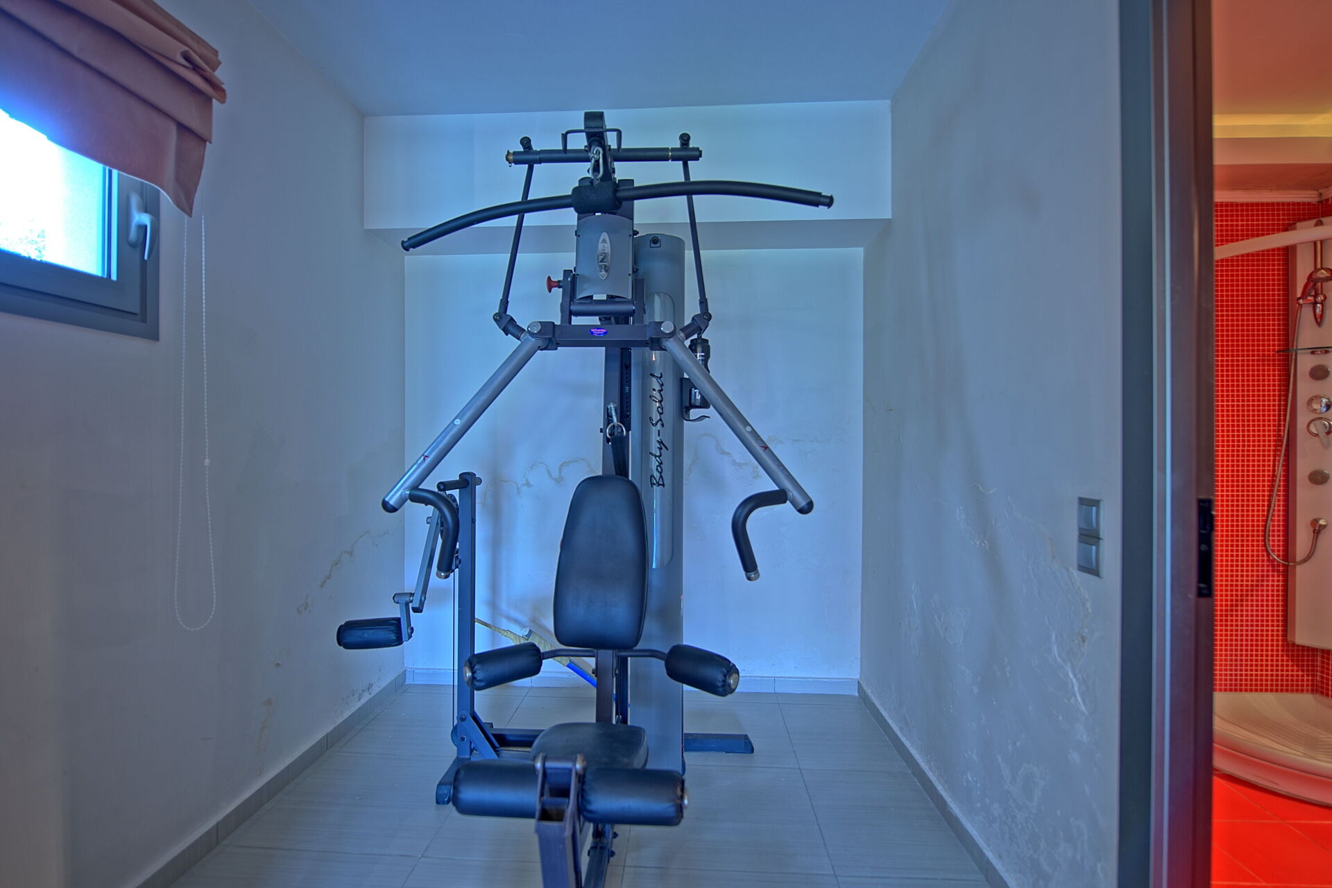 Begane grond: woonkamer (satelliet-tv) en fitnessruimte (loopband, gewichtsmachine); dubbele slaapkamer; badkamer met douche (geen raam); kamer met wasmachine.