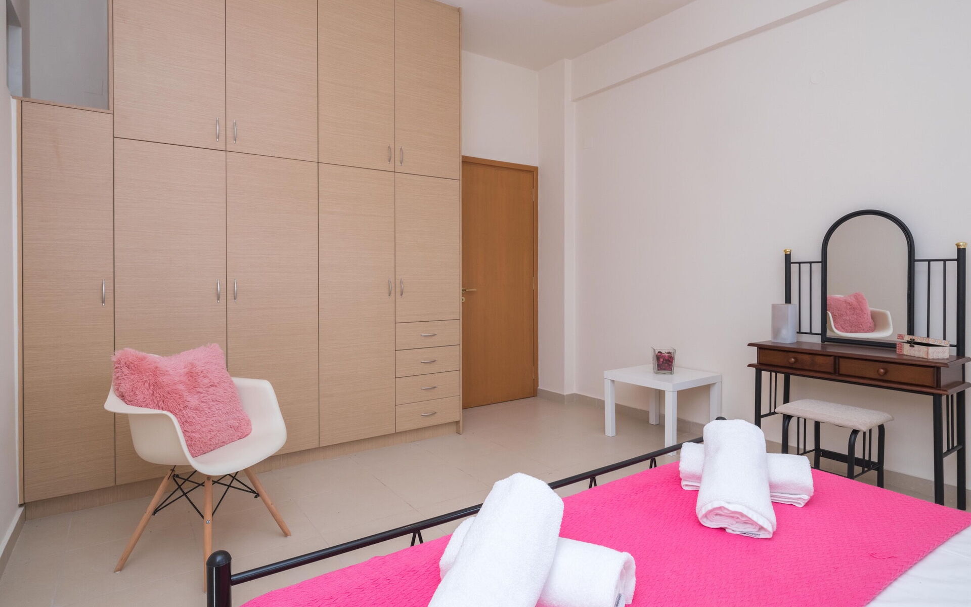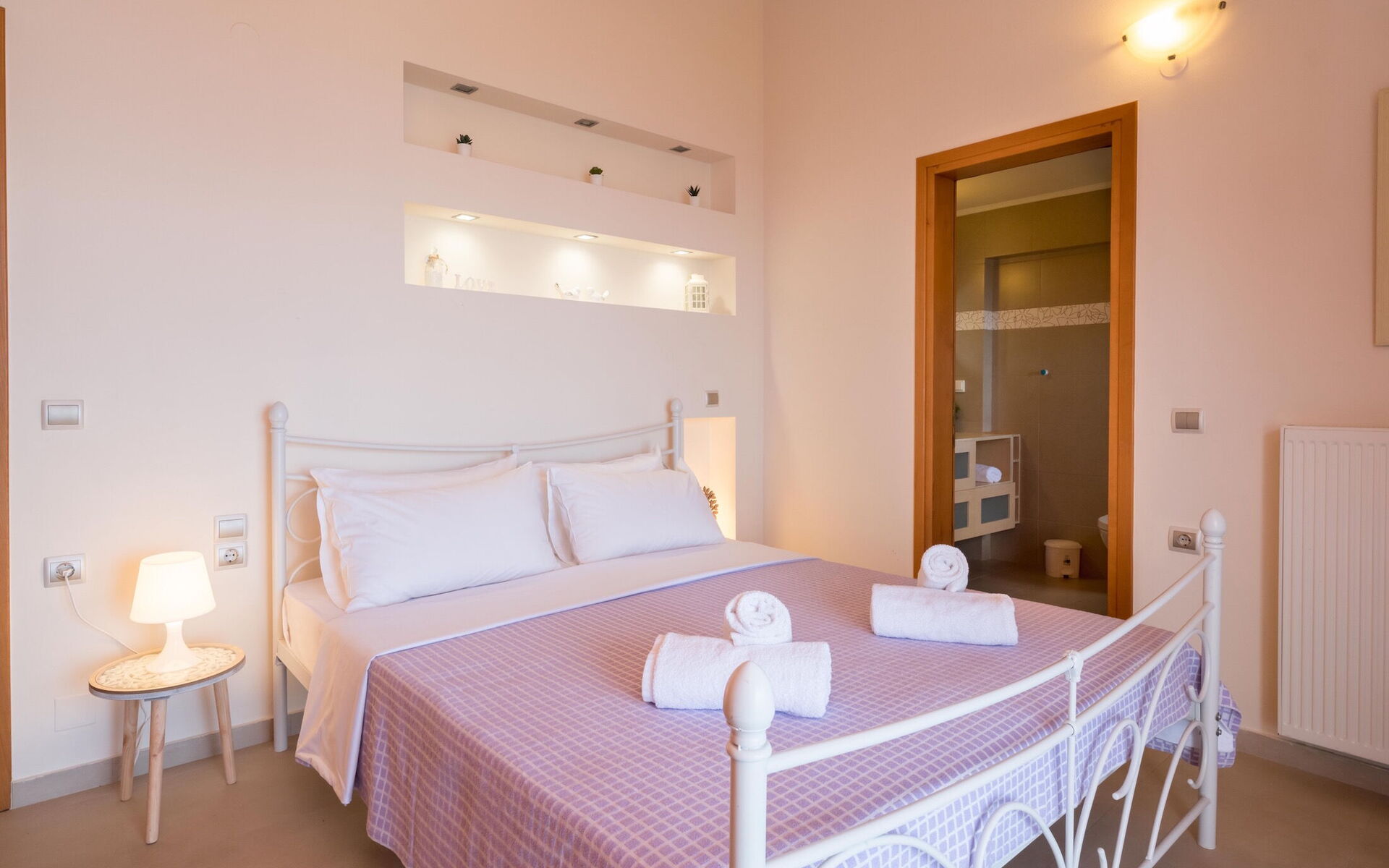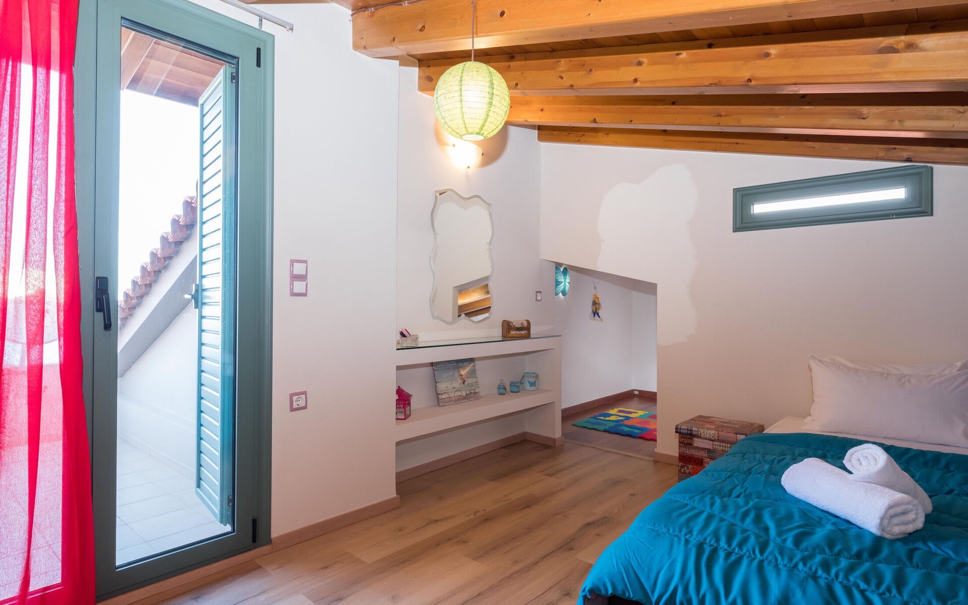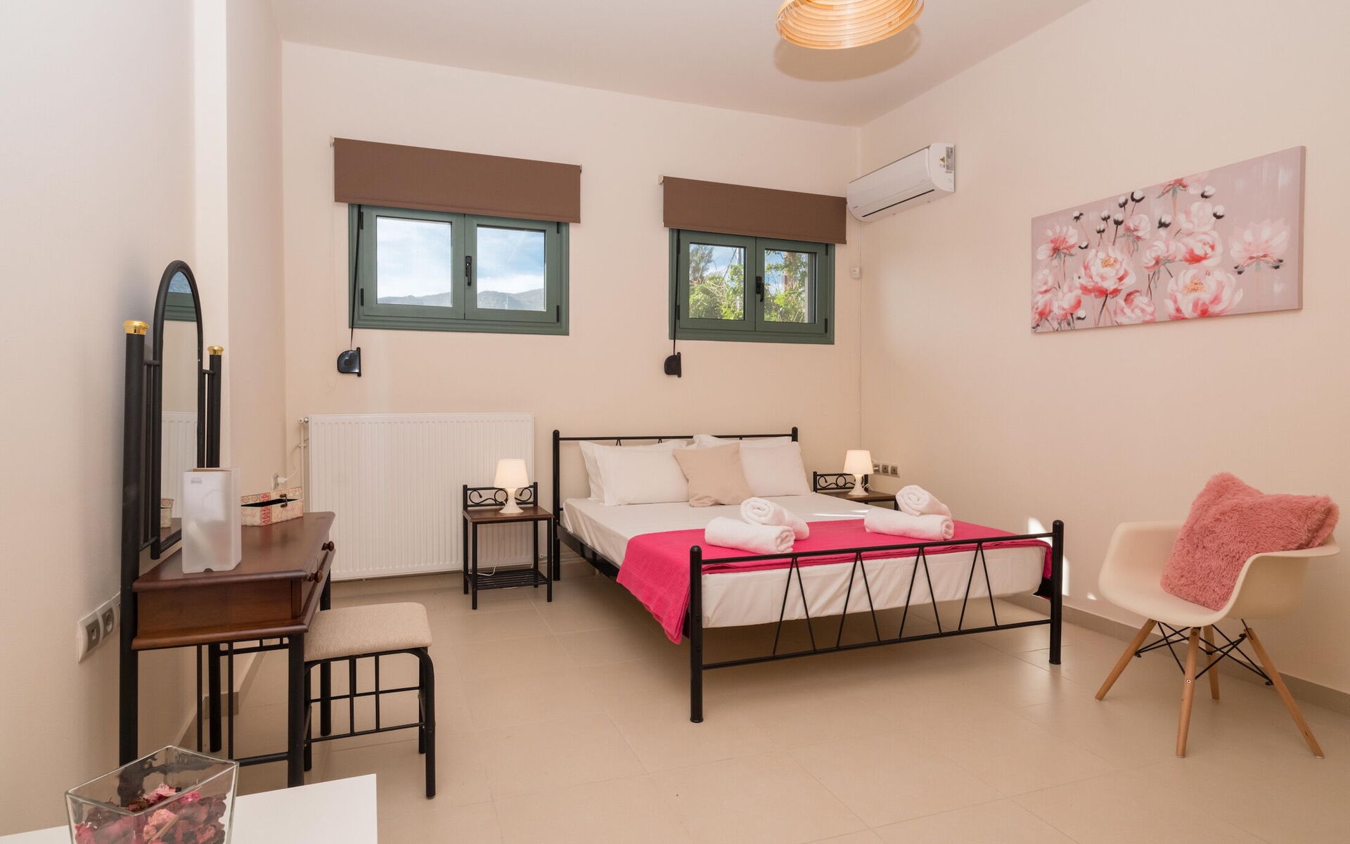 Slaapkamer: tweepersoonsbed, airconditioning, bank, uitgang naar de tuin.