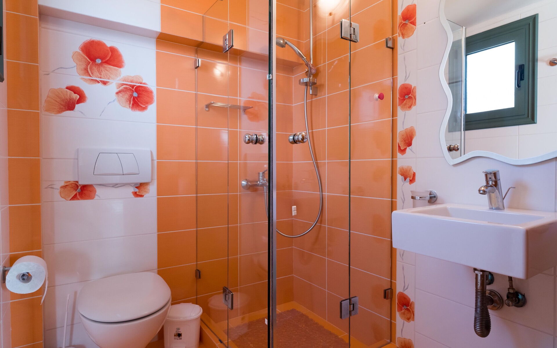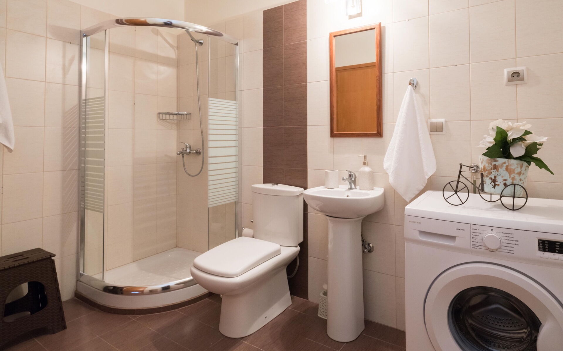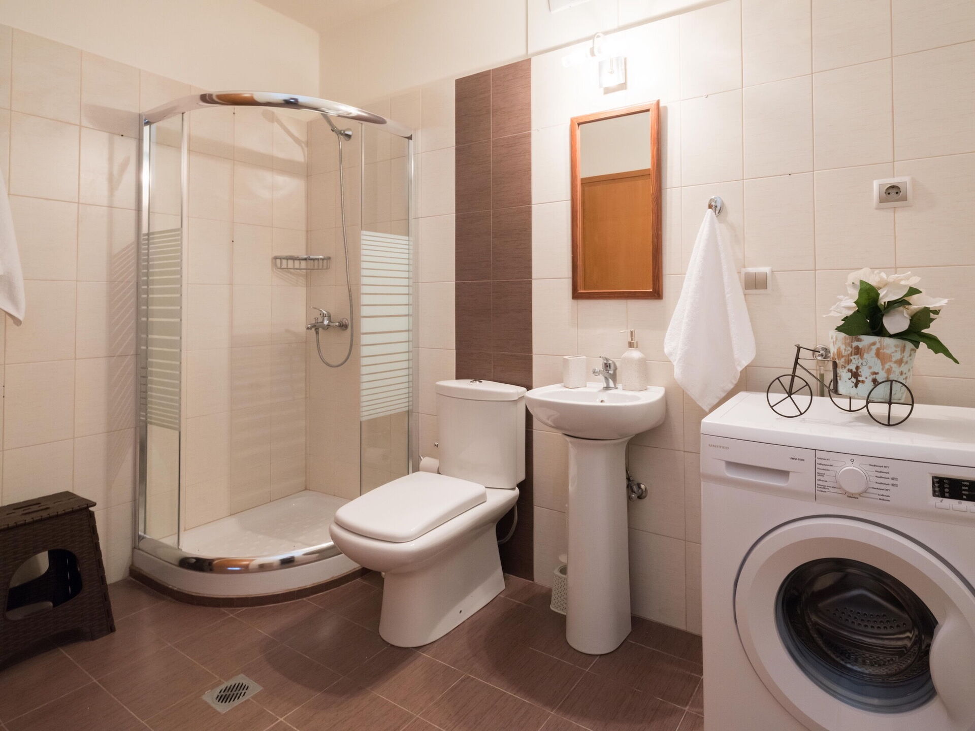 Badkamer: wastafel, toilet , douche, wasmachine.
