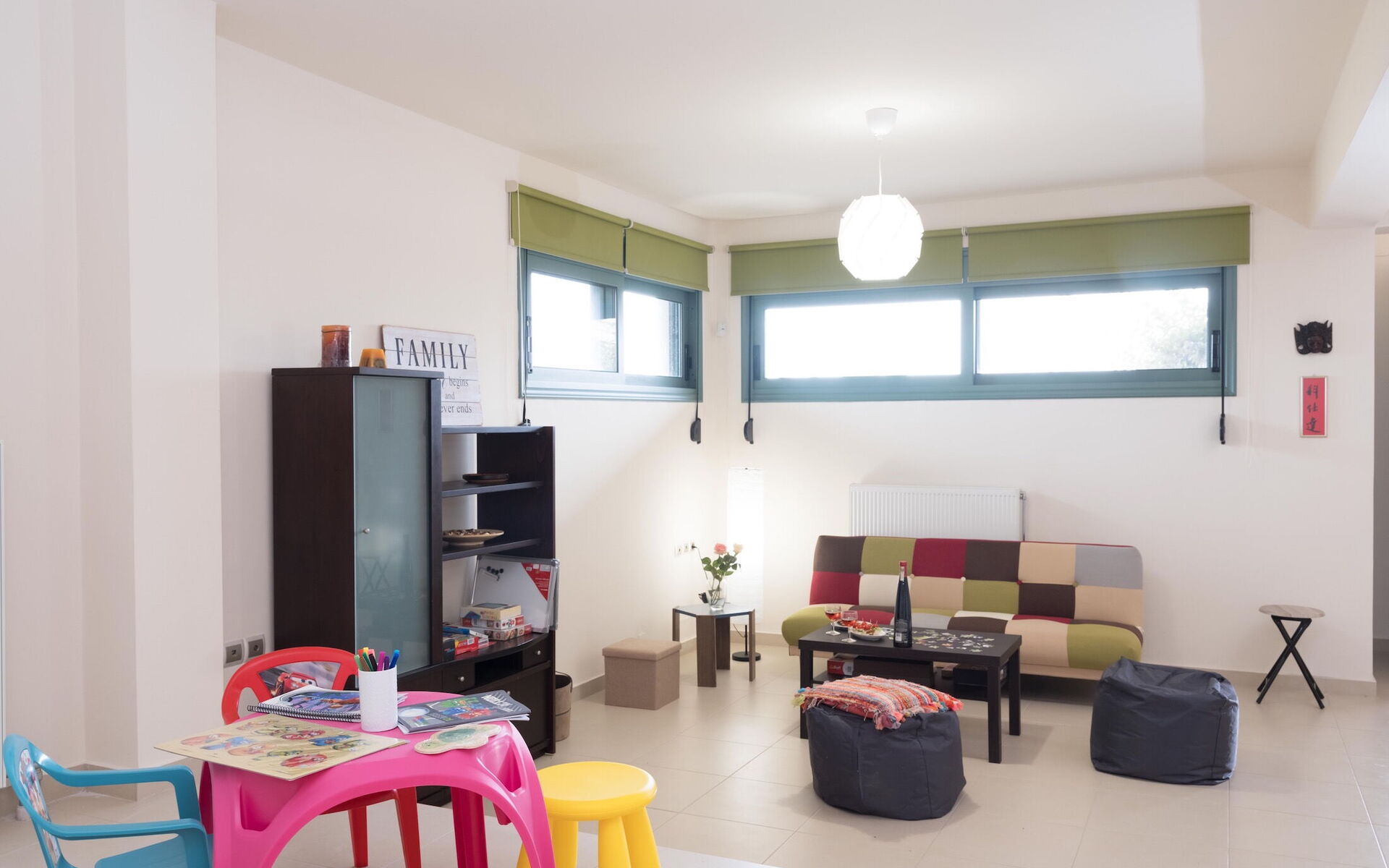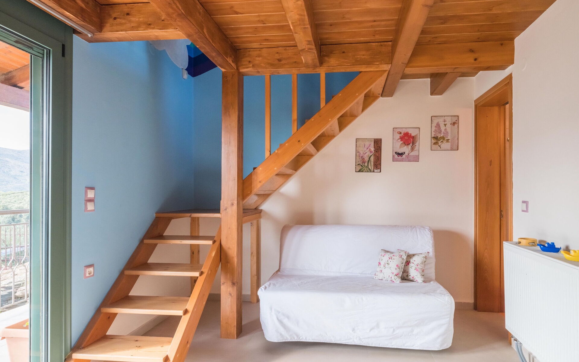 Woonkamer: slaapbank, internet, airconditioning, uitgang naar de tuin.