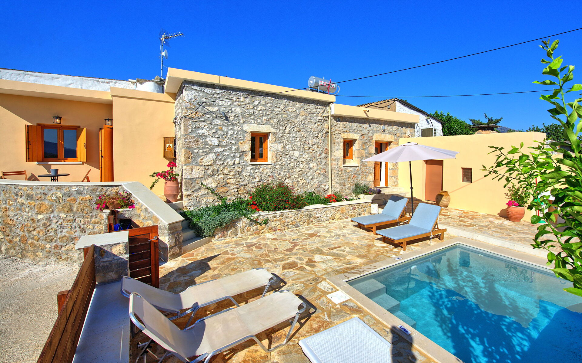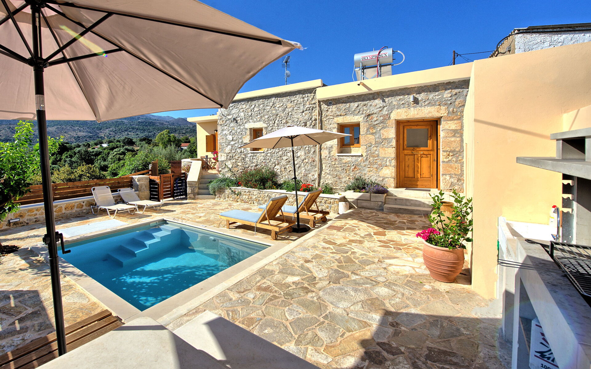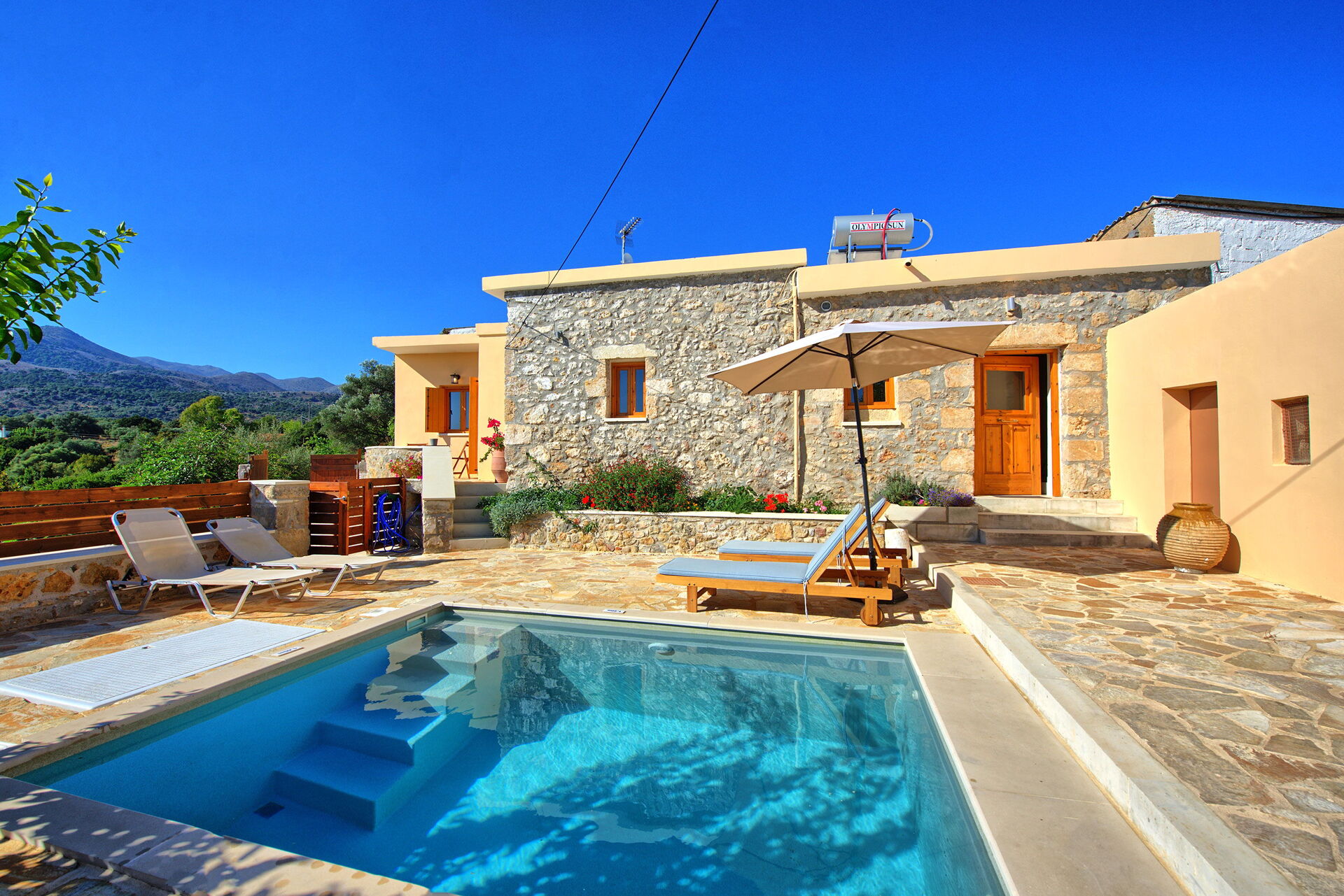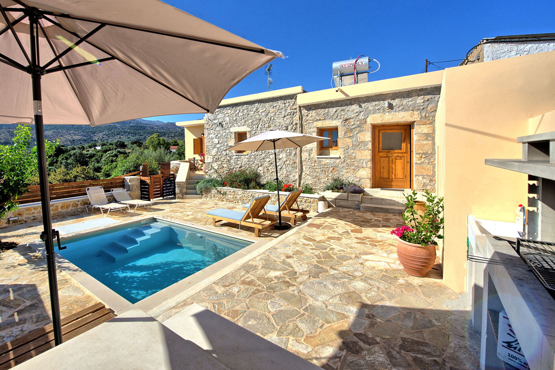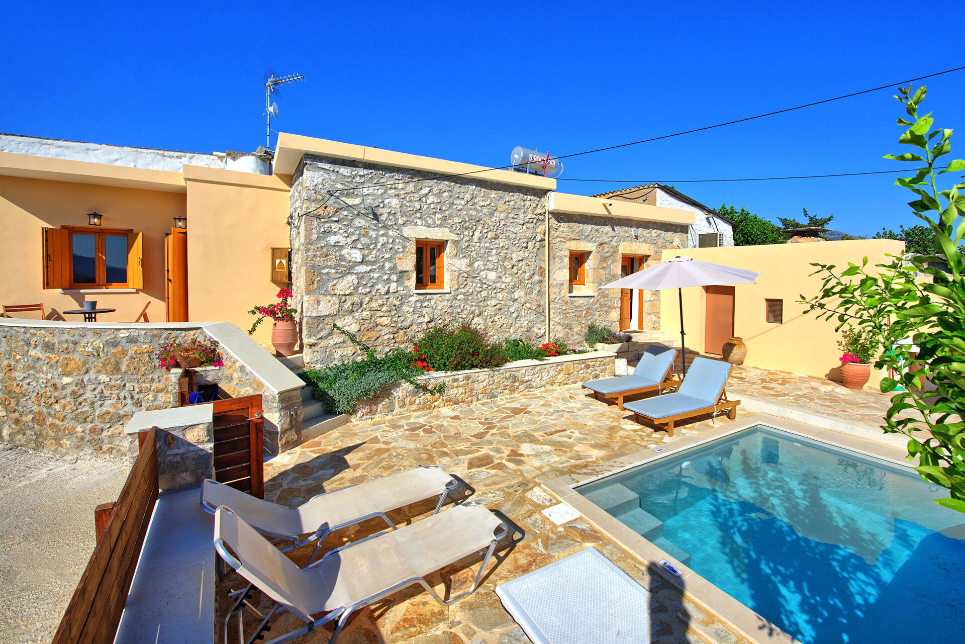 Buiten is er een privézwembad om plezier te hebben en af te koelen op de hete zomerdagen van Kreta.