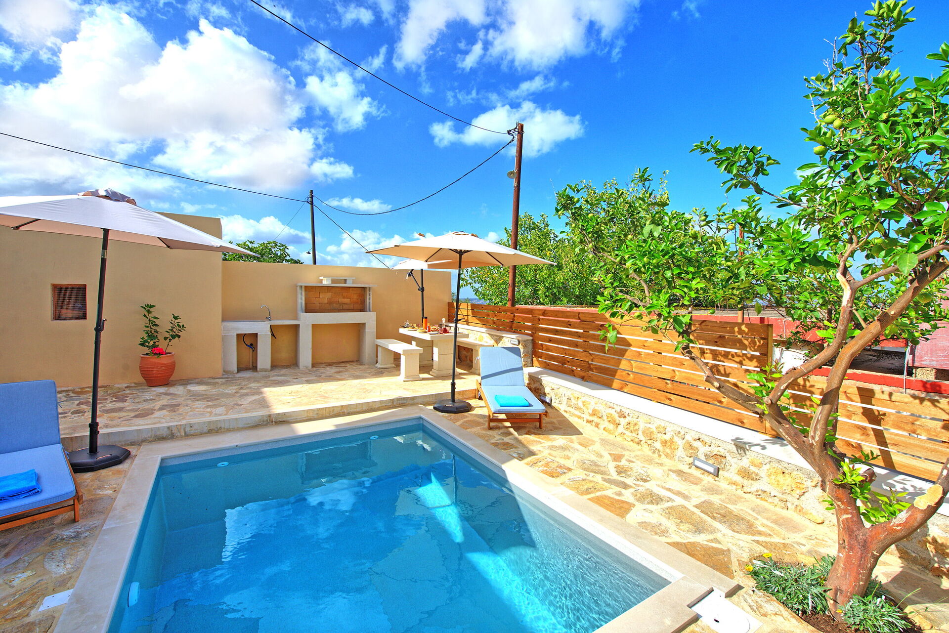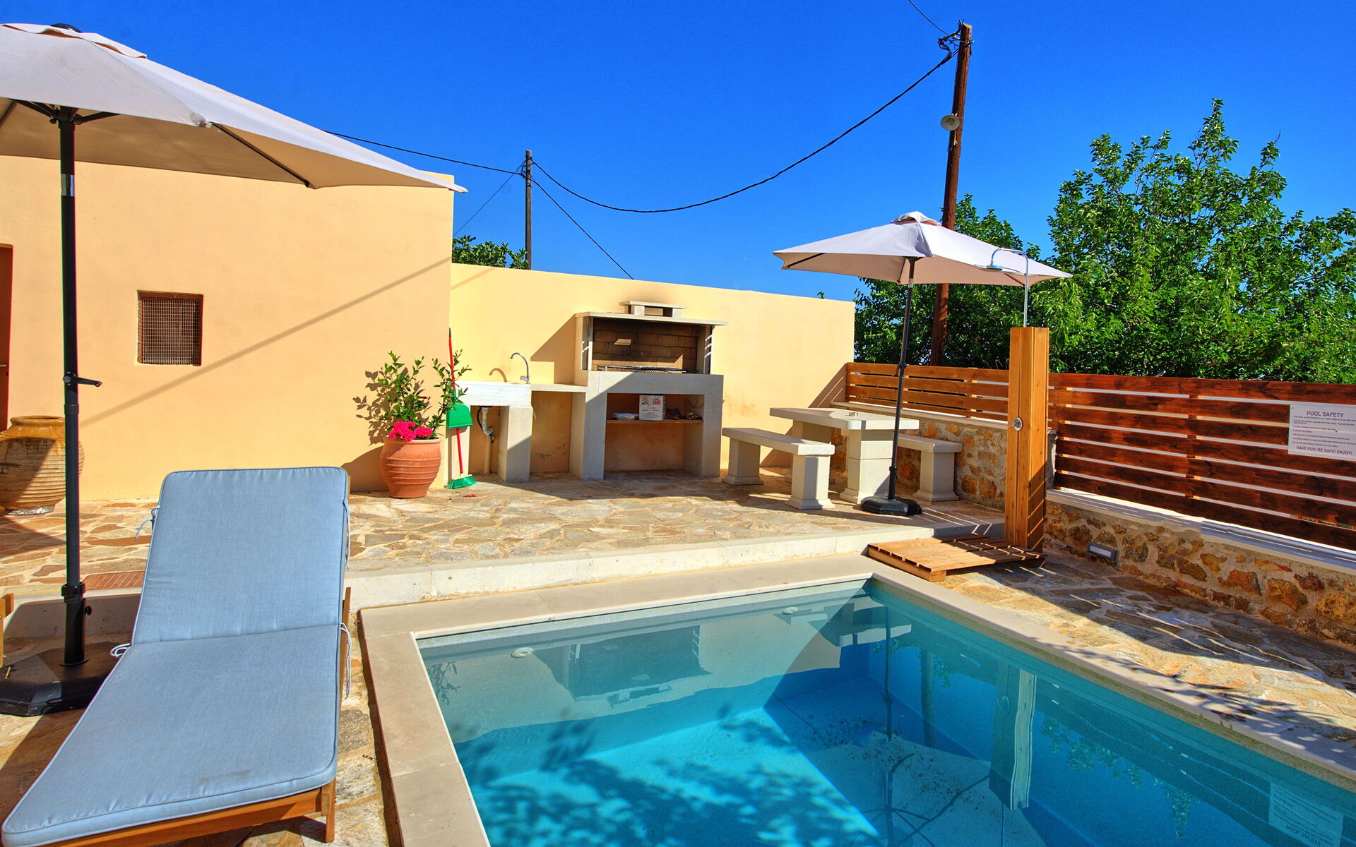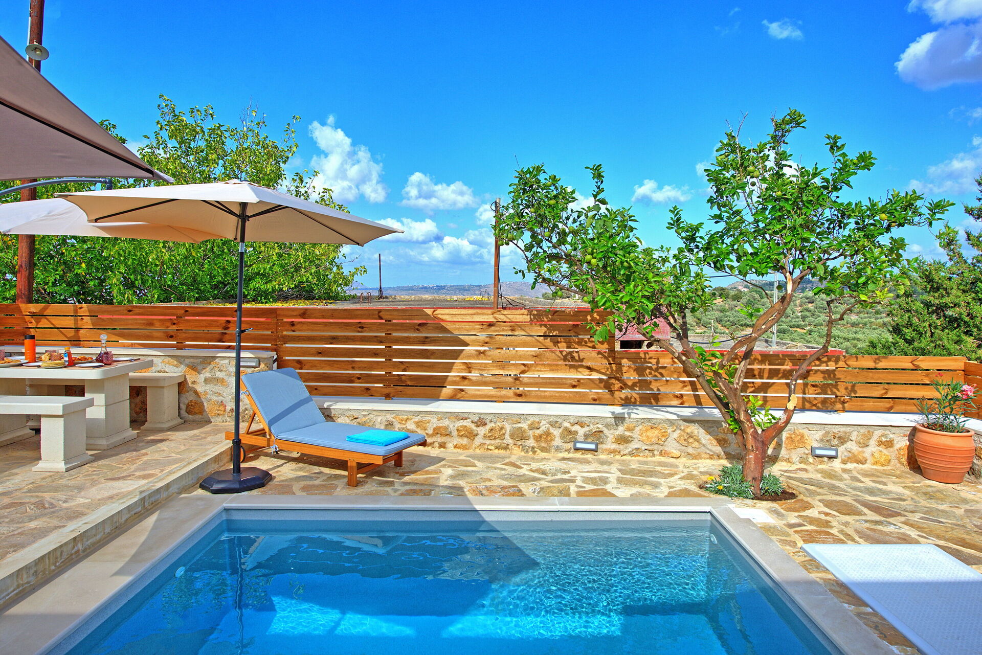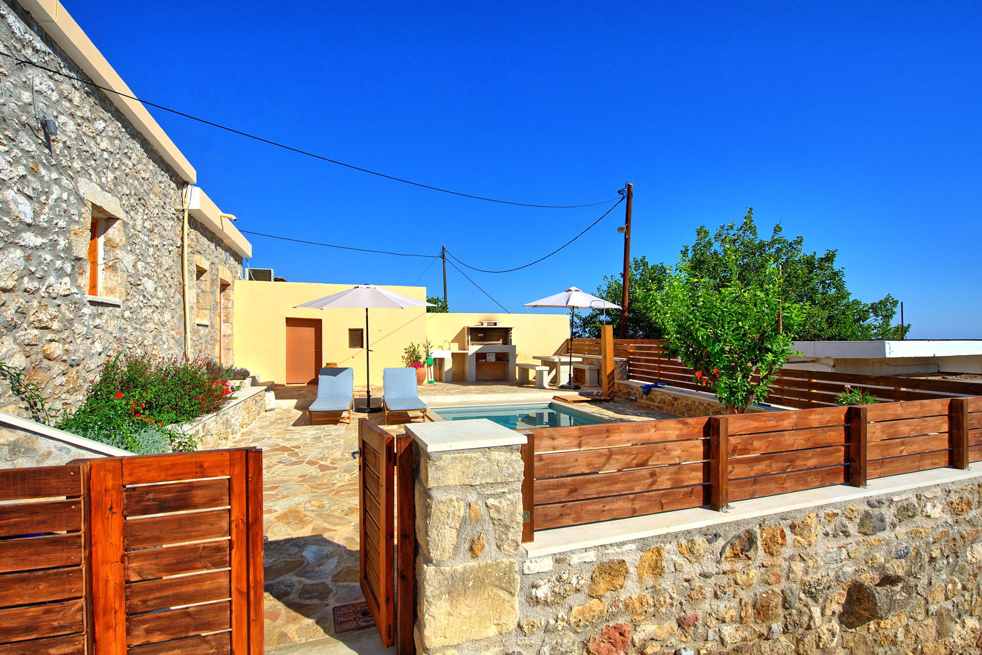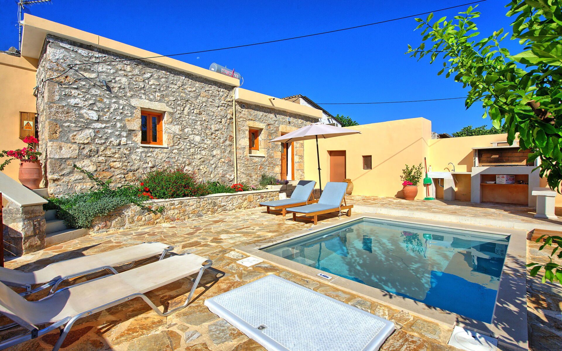 Buiten is er een privézwembad om plezier te hebben en af te koelen op de hete zomerdagen van Kreta.