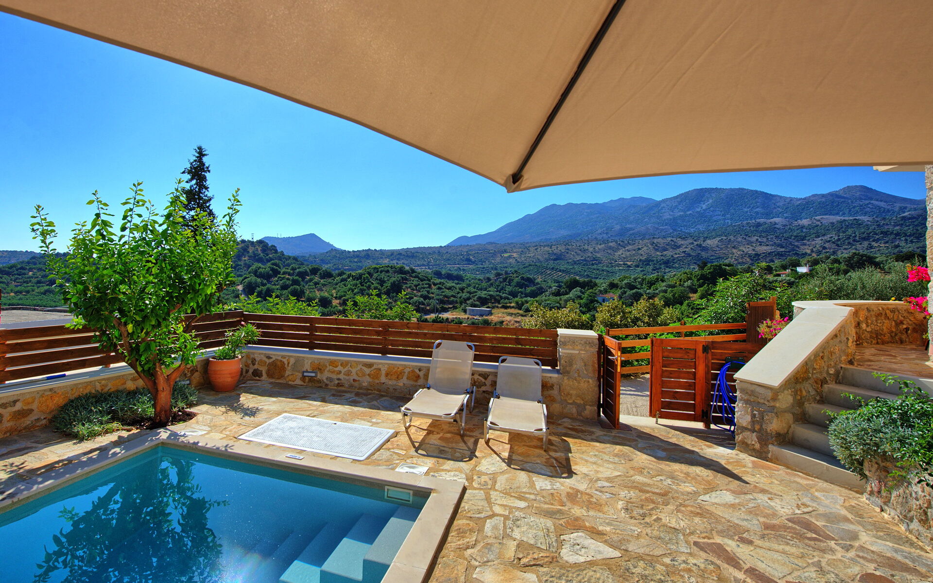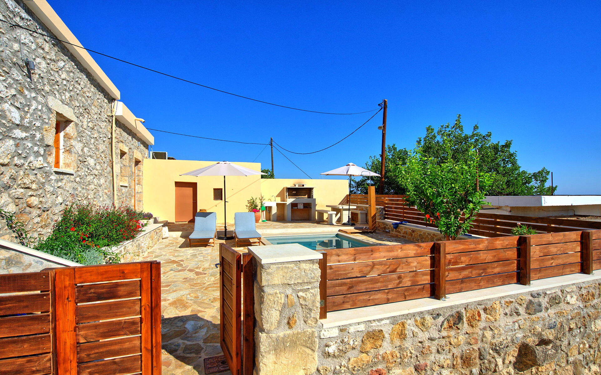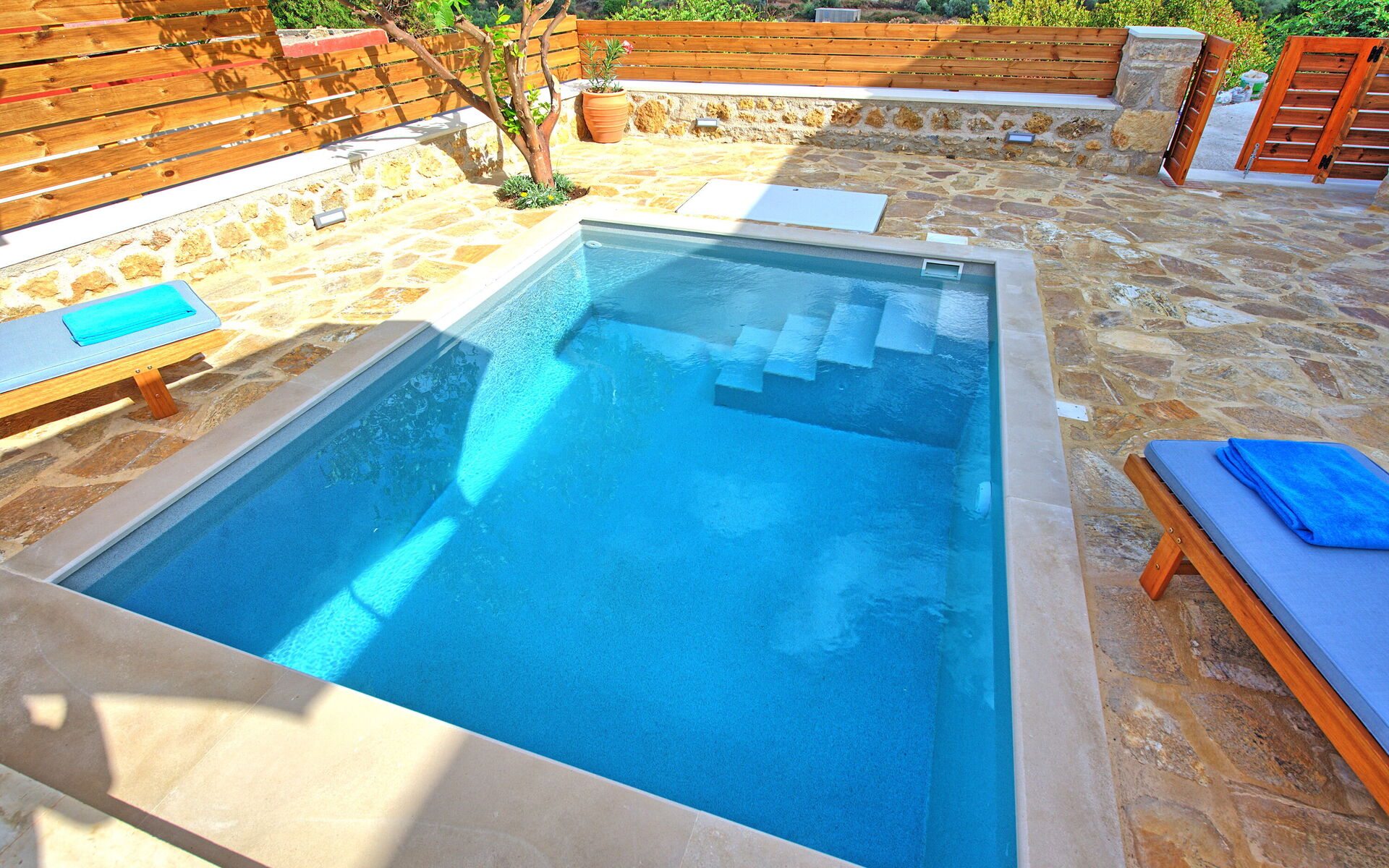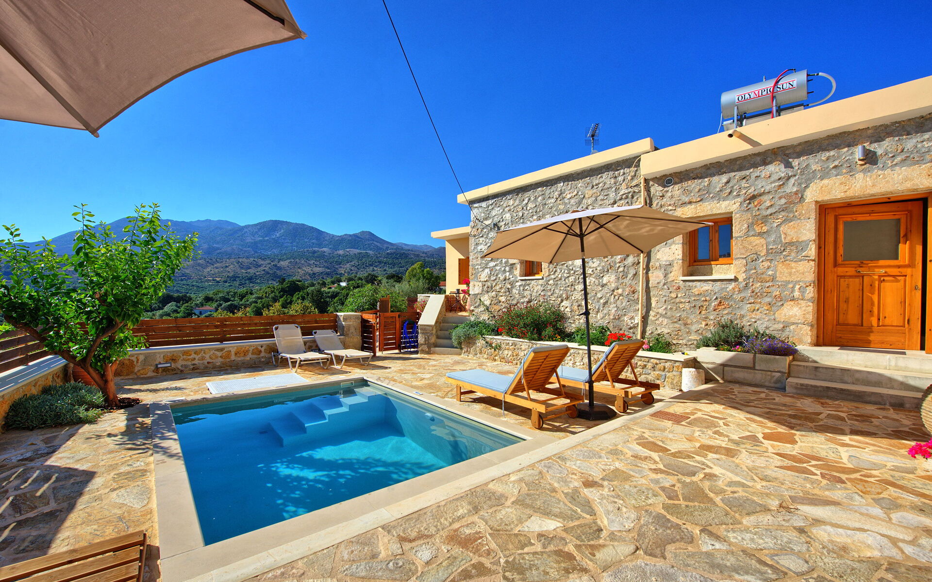 Buiten is er een privézwembad om plezier te hebben en af te koelen op de hete zomerdagen van Kreta.