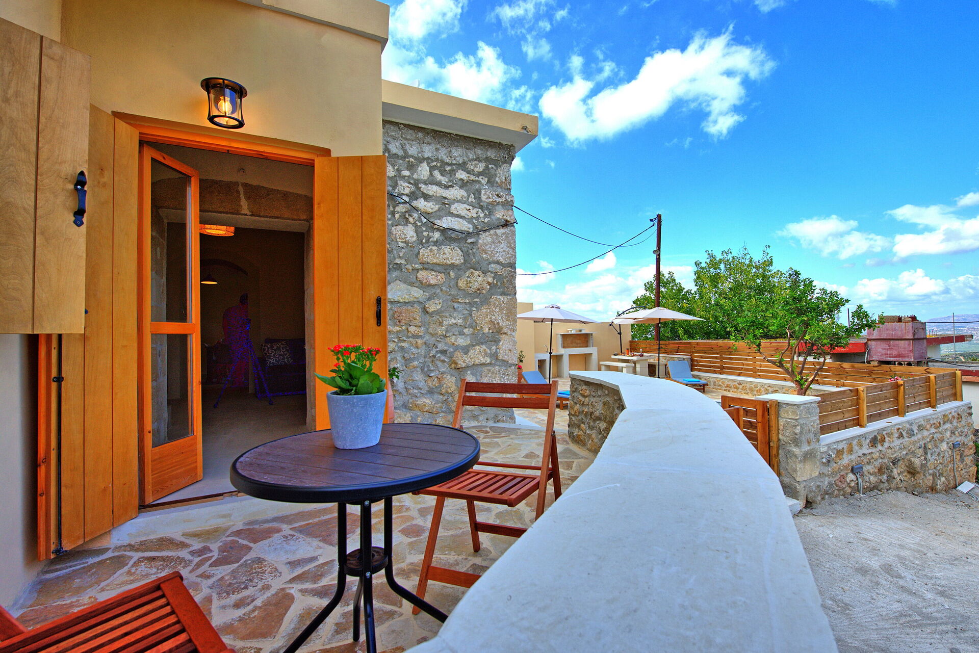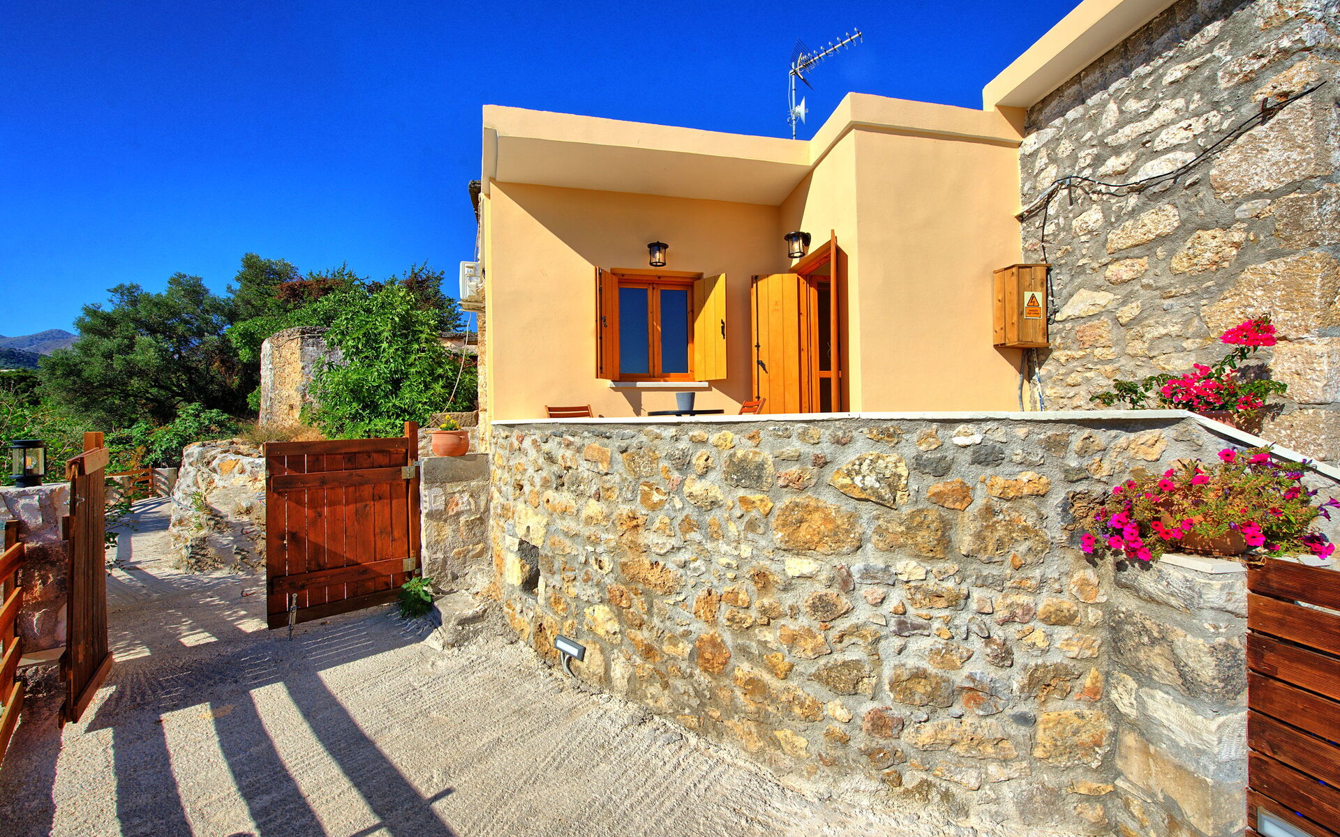 Afstanden: Embrosneros (restaurant en levensmiddelenwinkels) op 900 meter afstand; Vrysses (alle soorten winkels) 6 km; Georgioupolis (stranden) 12 km; Almyrida 24 km; Xanía 40 km; luchthaven op 48 km afstand.