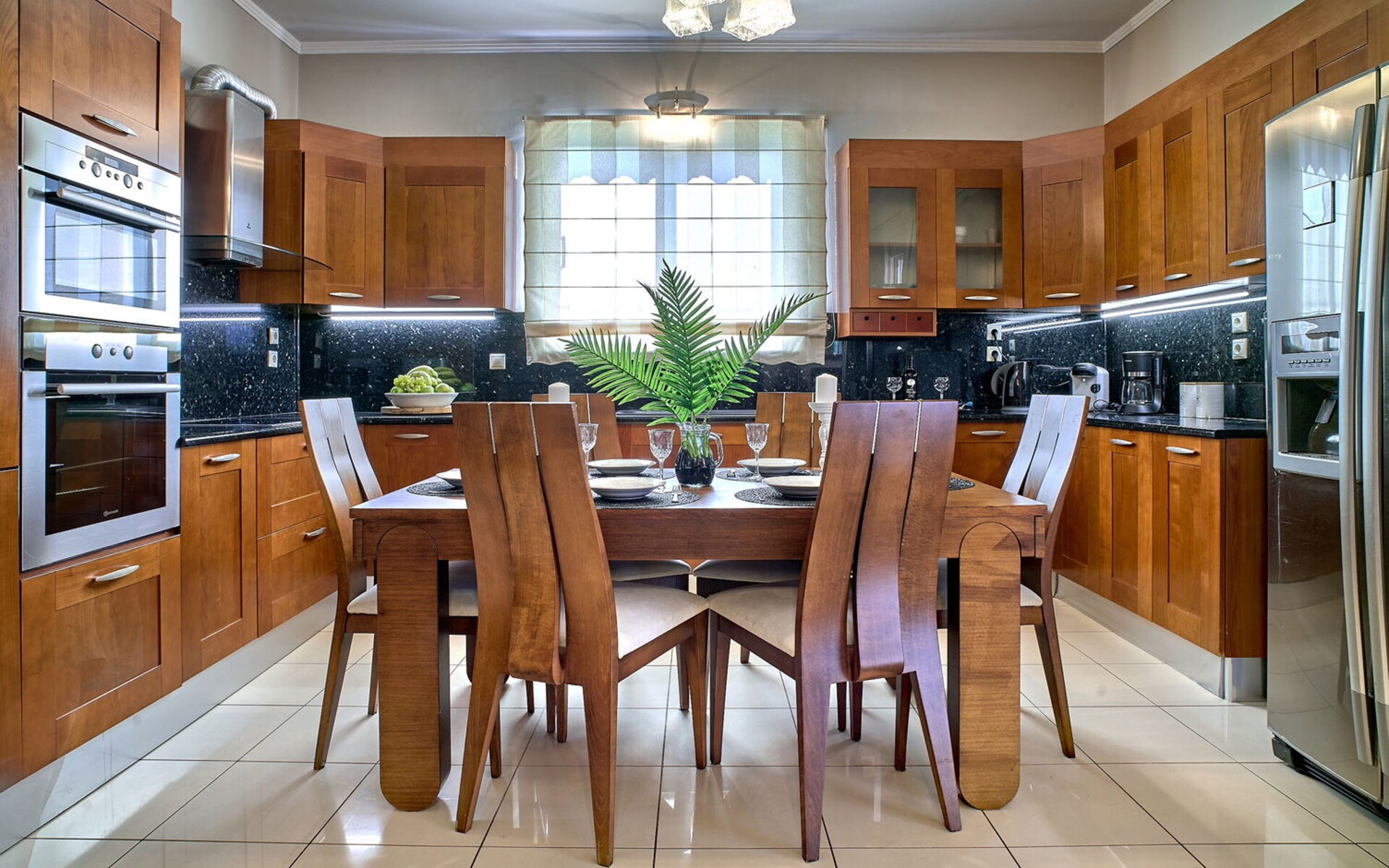 Begane grond: goed ingerichte keuken (oven, koelkast met ijsblokjesmachine, vriezer, vaatwasser) met eethoek en kookhoek.
