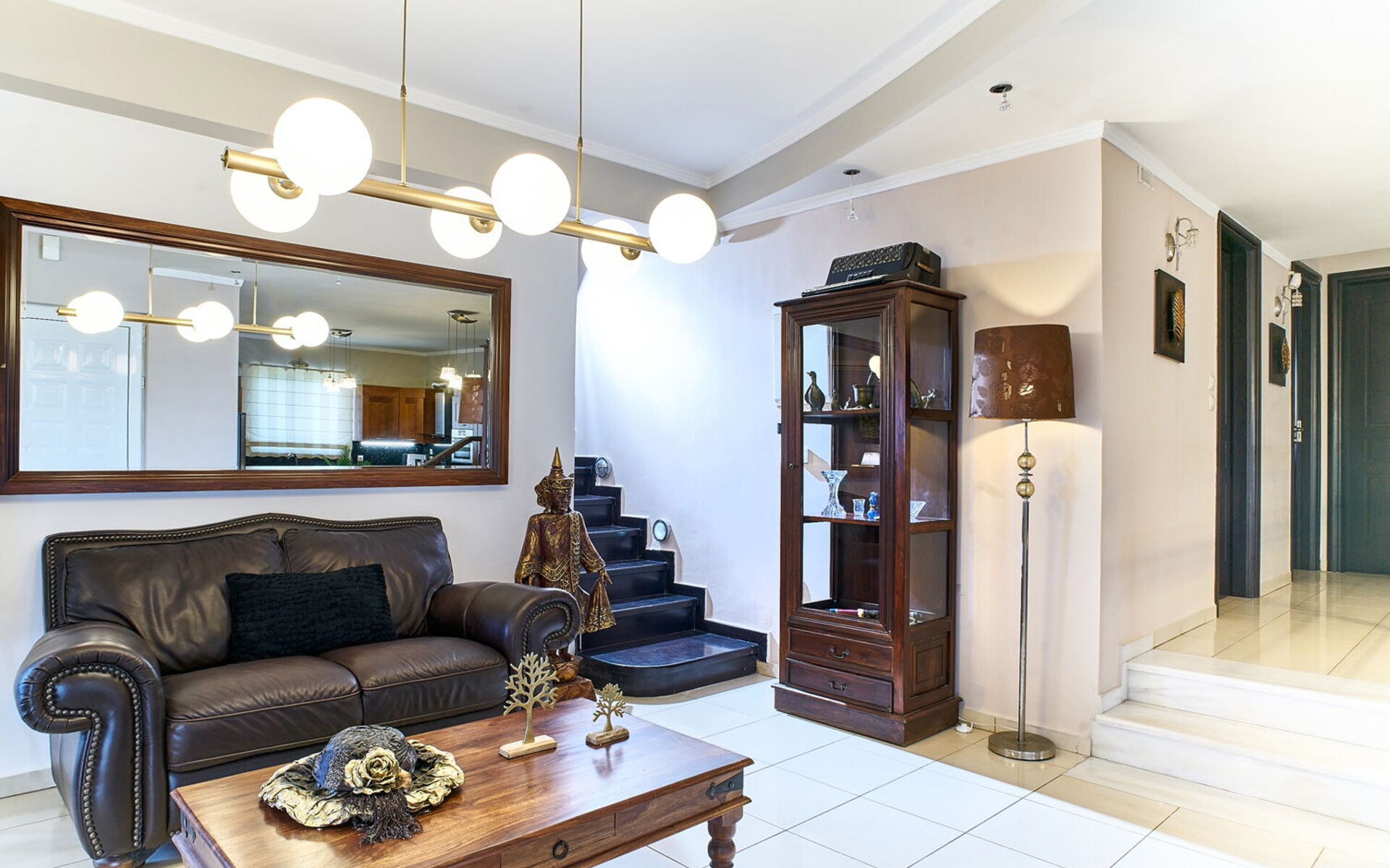 2 treden hoger: grote woonkamer met marmeren open haard en toegang tot groot gemeubileerd overdekt terras; WC, slaapkamer met kingsize bed en toegang tot privébalkon; dubbele slaapkamer; slaapkamer met 2 eenpersoonsbedden; badkamer met bubbelbad; badkamer met douche en wasmachine.