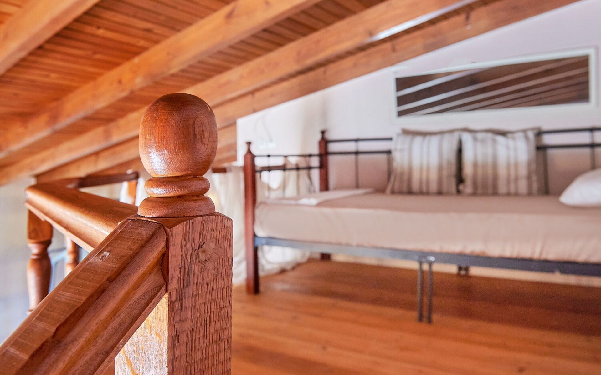 Eerste verdieping: slaapkamer met tweepersoonsbed; badkamer met douche; fitnessruimte