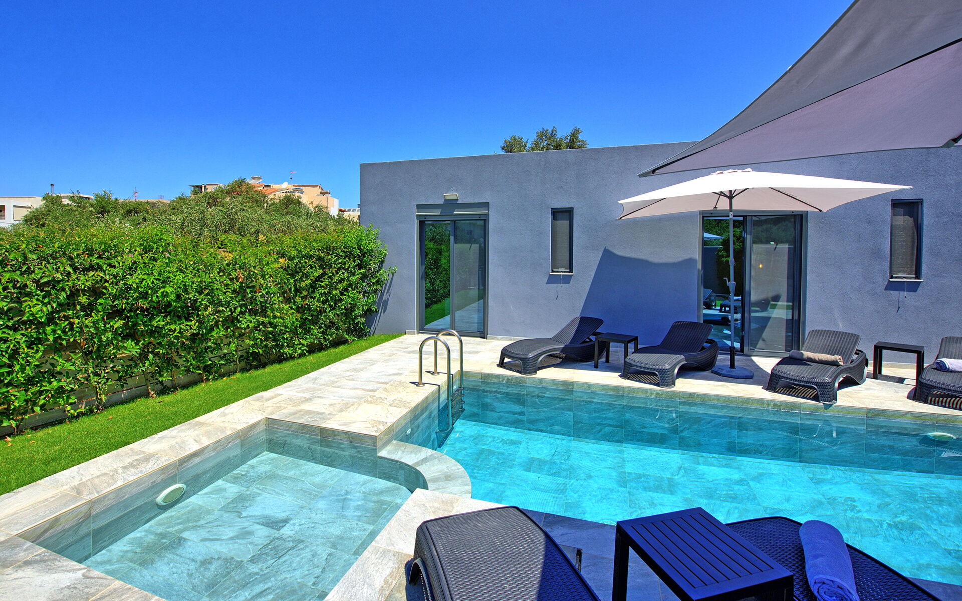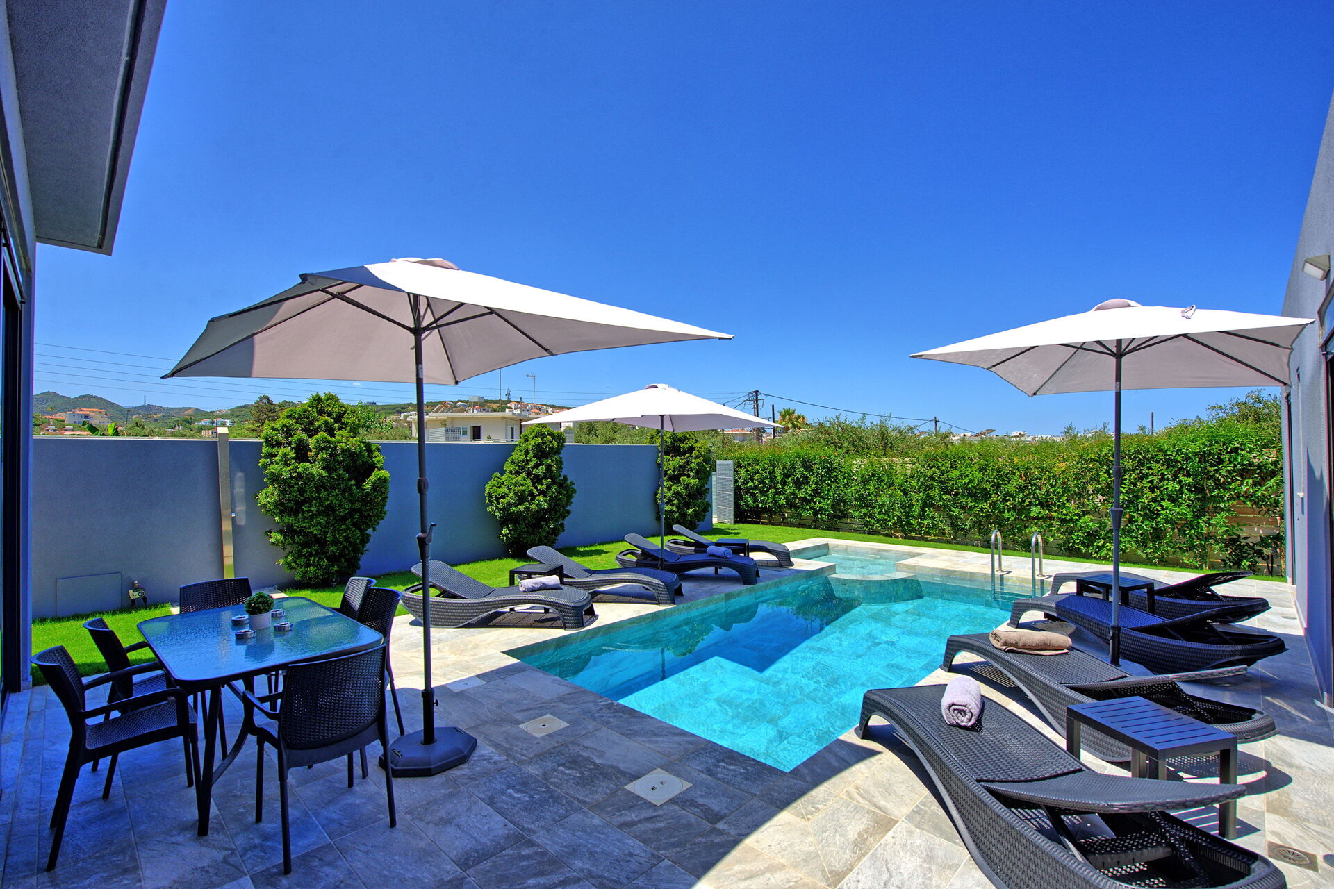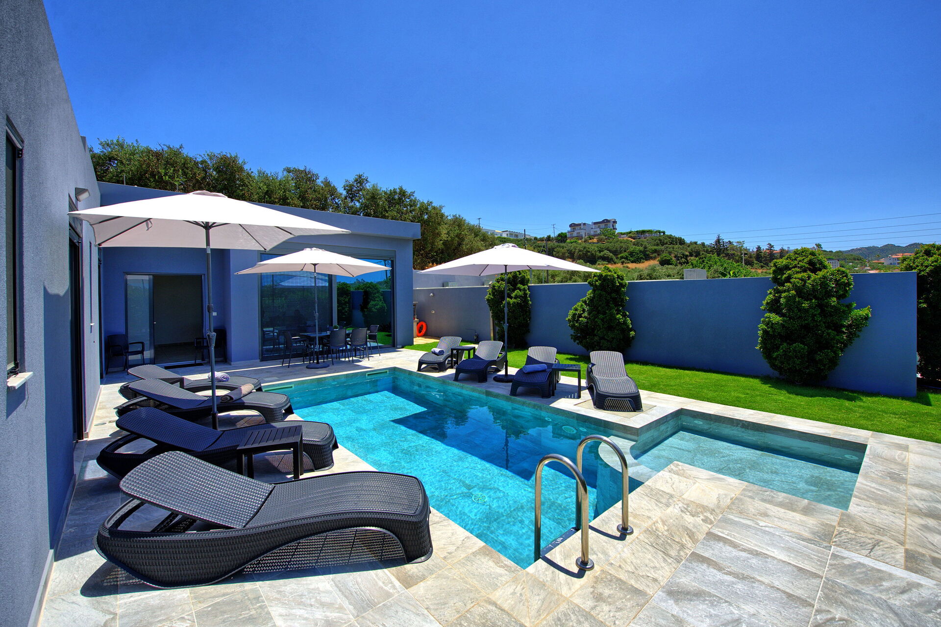 Ter beschikking van de gasten: omheinde privétuin, privézwembad (8 x 4,5 meter; diepte: 1,4 meter), ingerichte buitenruimte met tafel en stoelen om buiten te dineren, barbecue, 4 slaapkamers met en-suite badkamers, lucht airconditioning in slaapkamers en woonkamer, dicht bij het dorp en de stranden van Agia Marina, internet wi-fi verbinding