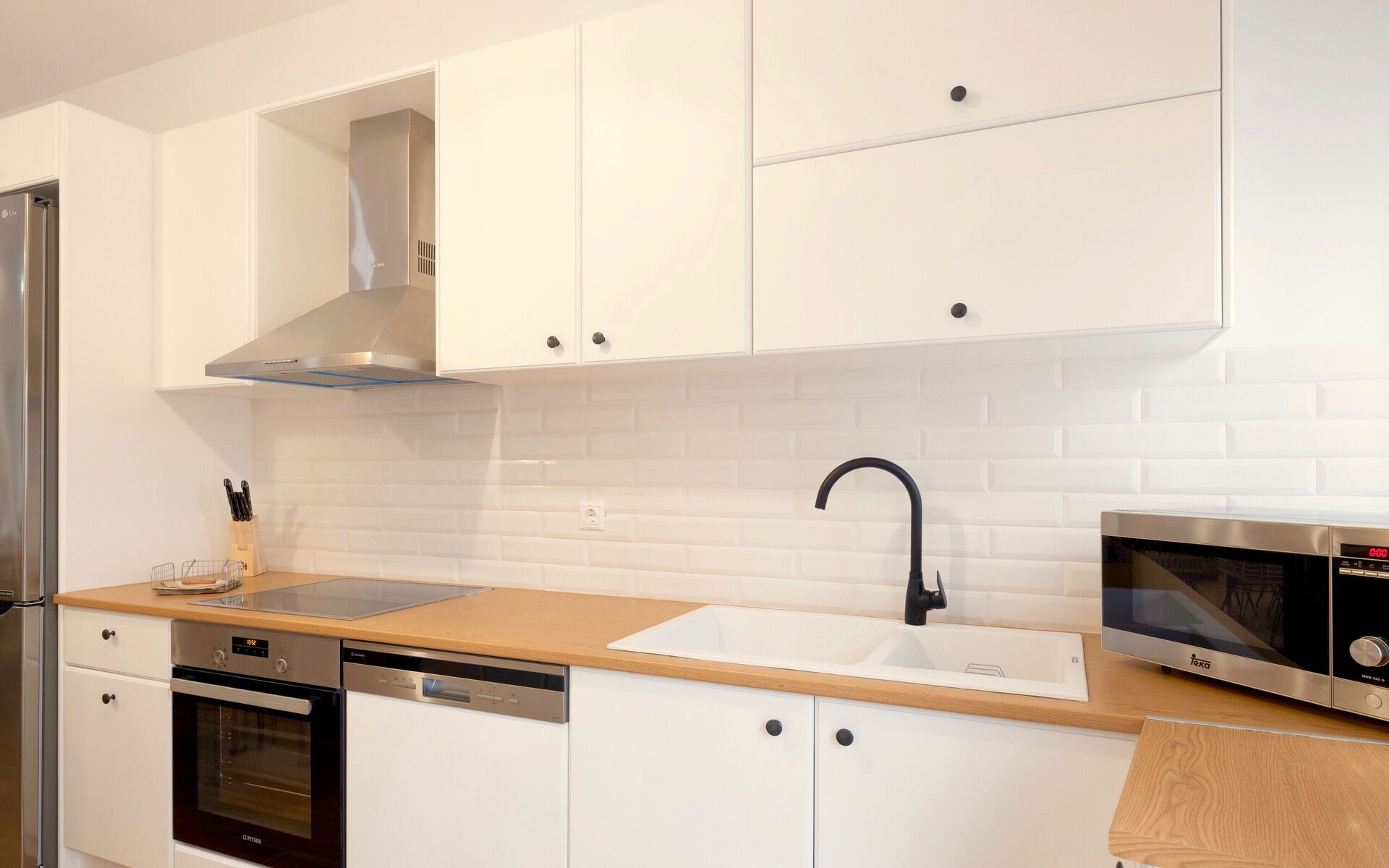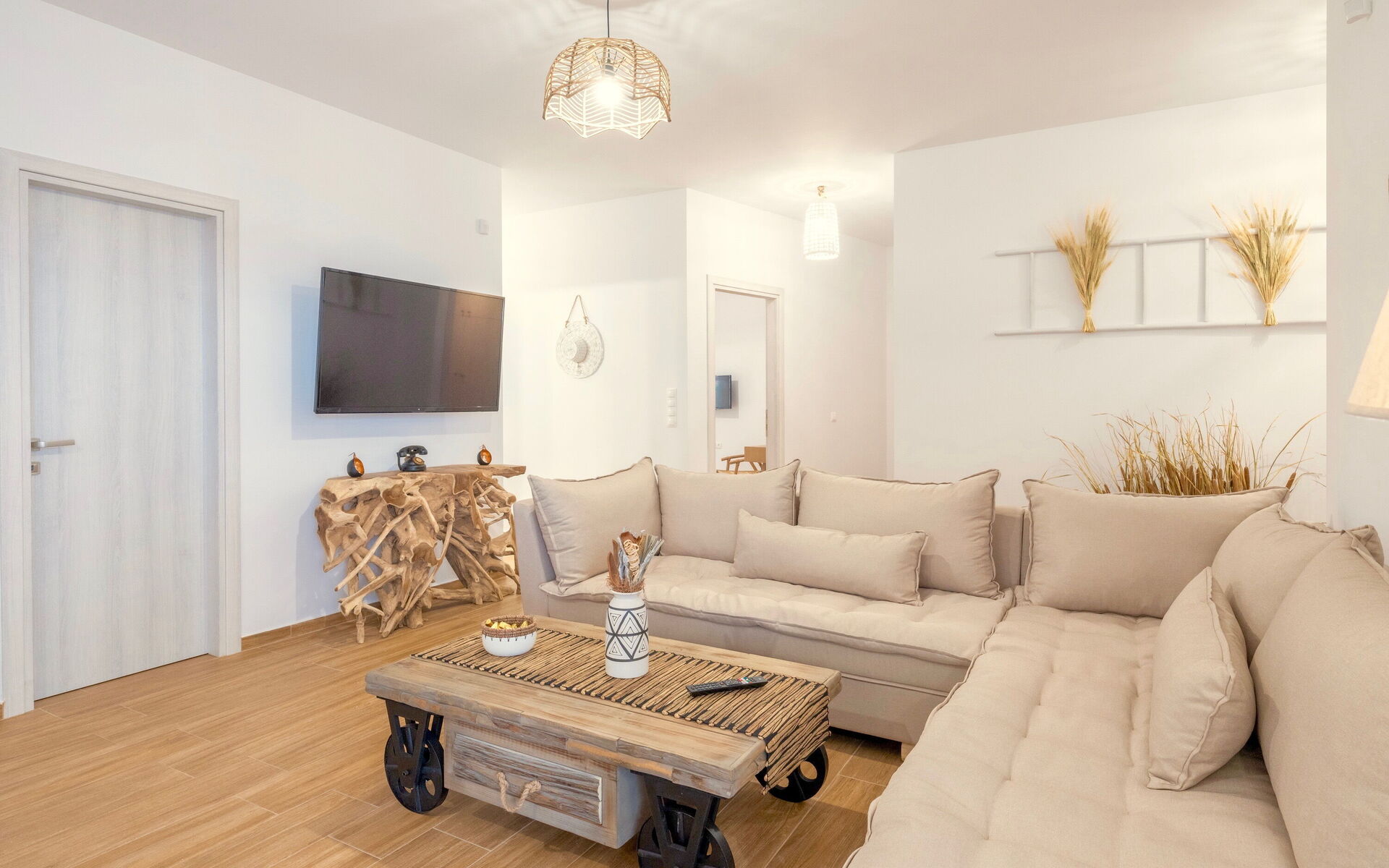 Keuken – woonkamer: goed uitgeruste keuken, eettafel, vaatwasser, ijskast, magnetron, oven, broodrooster, strijkijzer, wasdroger, bank, twee slaapbanken, baby wieg, WIFI internet, internet, airconditioning, kinderstoel, satelliet tv, uitgang naar de tuin, uitgang naar het terras.