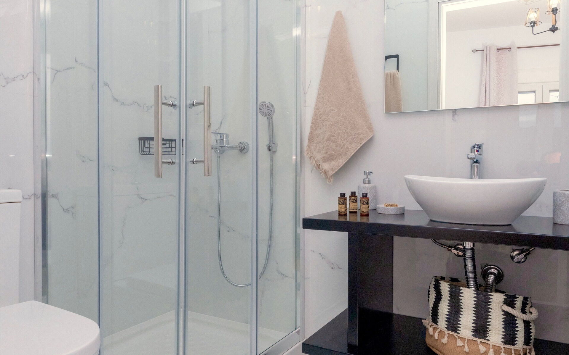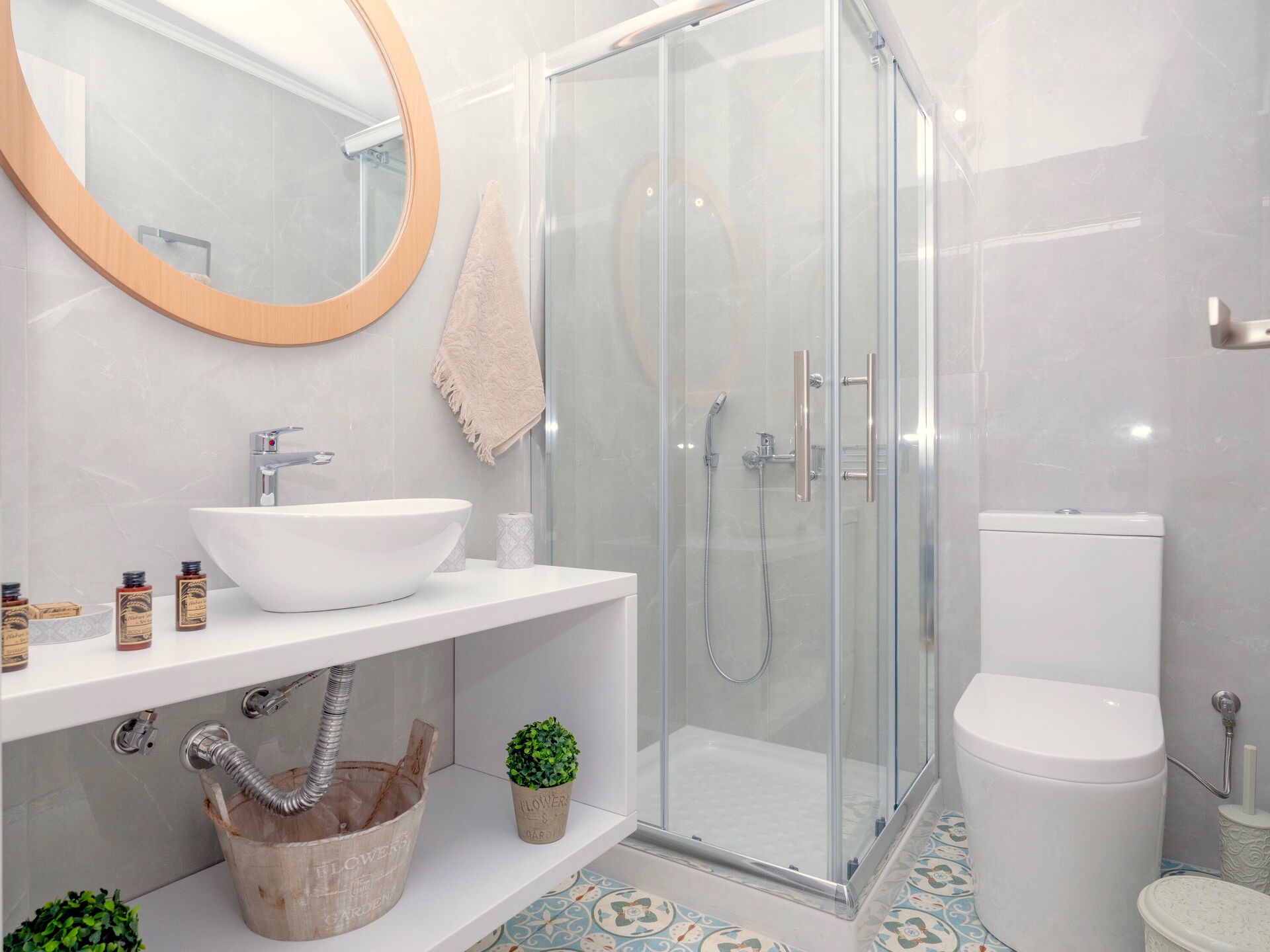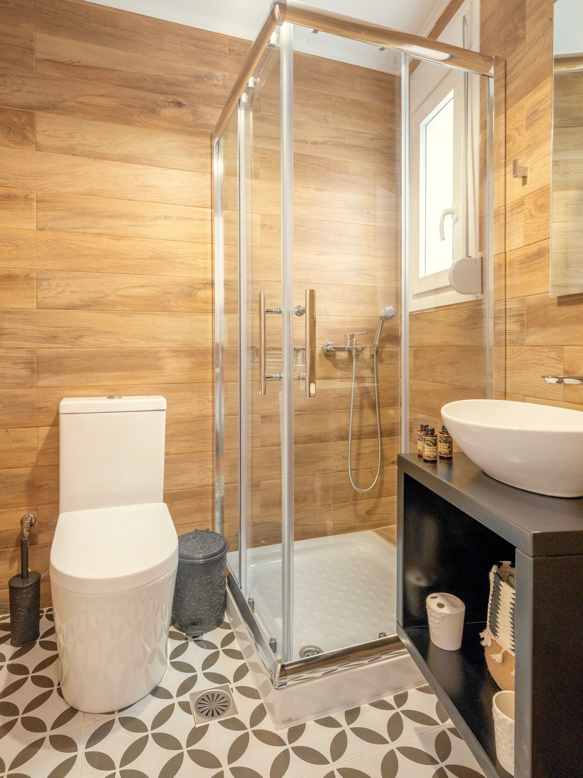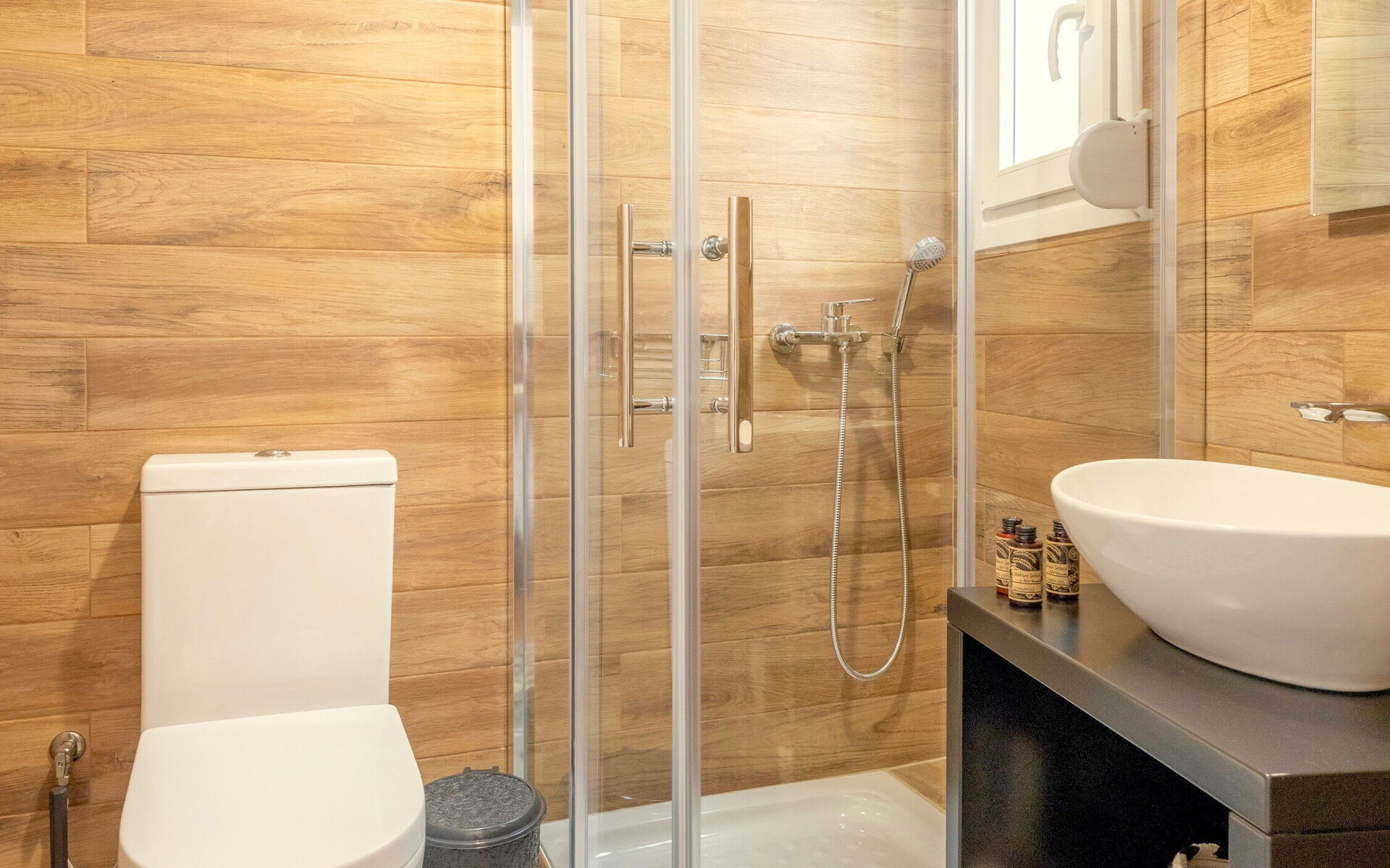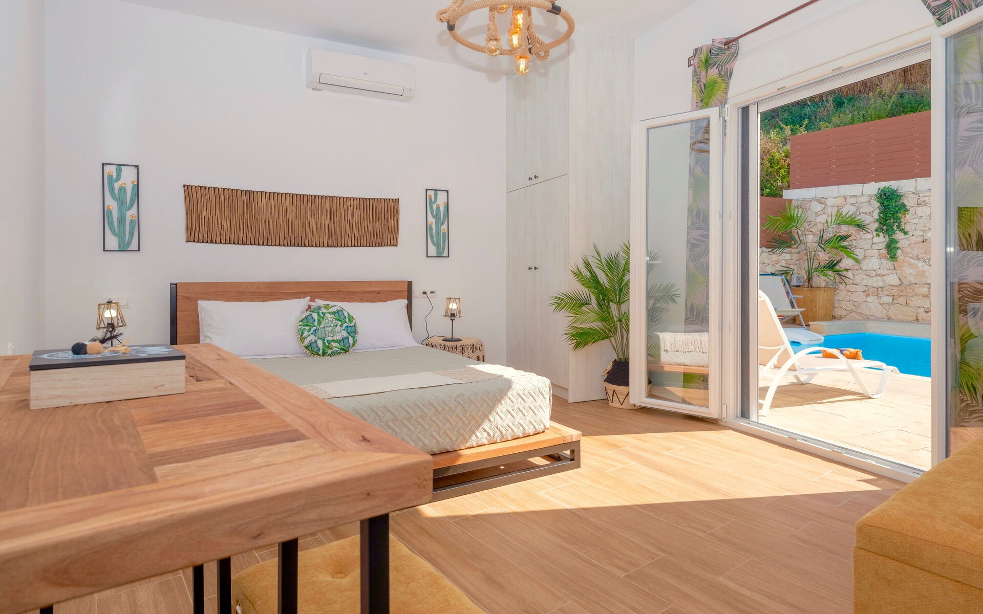 Slaapkamer met badkamer 1: tweepersoonsbed, airconditioning, wastafel, toilet , douche, badkamer zonder raam, uitgang naar het terras.