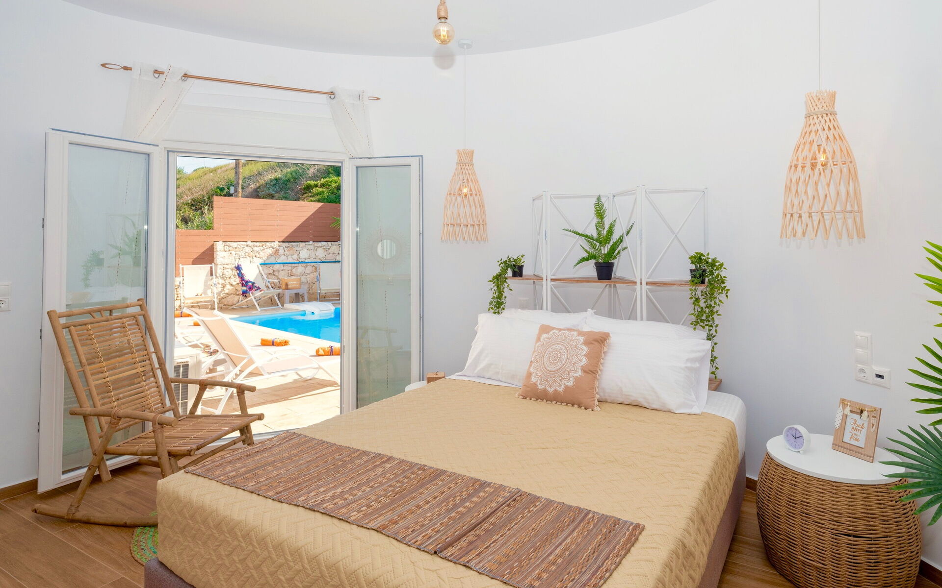 Slaapkamer met badkamer 3: tweepersoonsbed, airconditioning, wastafel, toilet , douche, badkamer zonder raam, uitgang naar het terras.