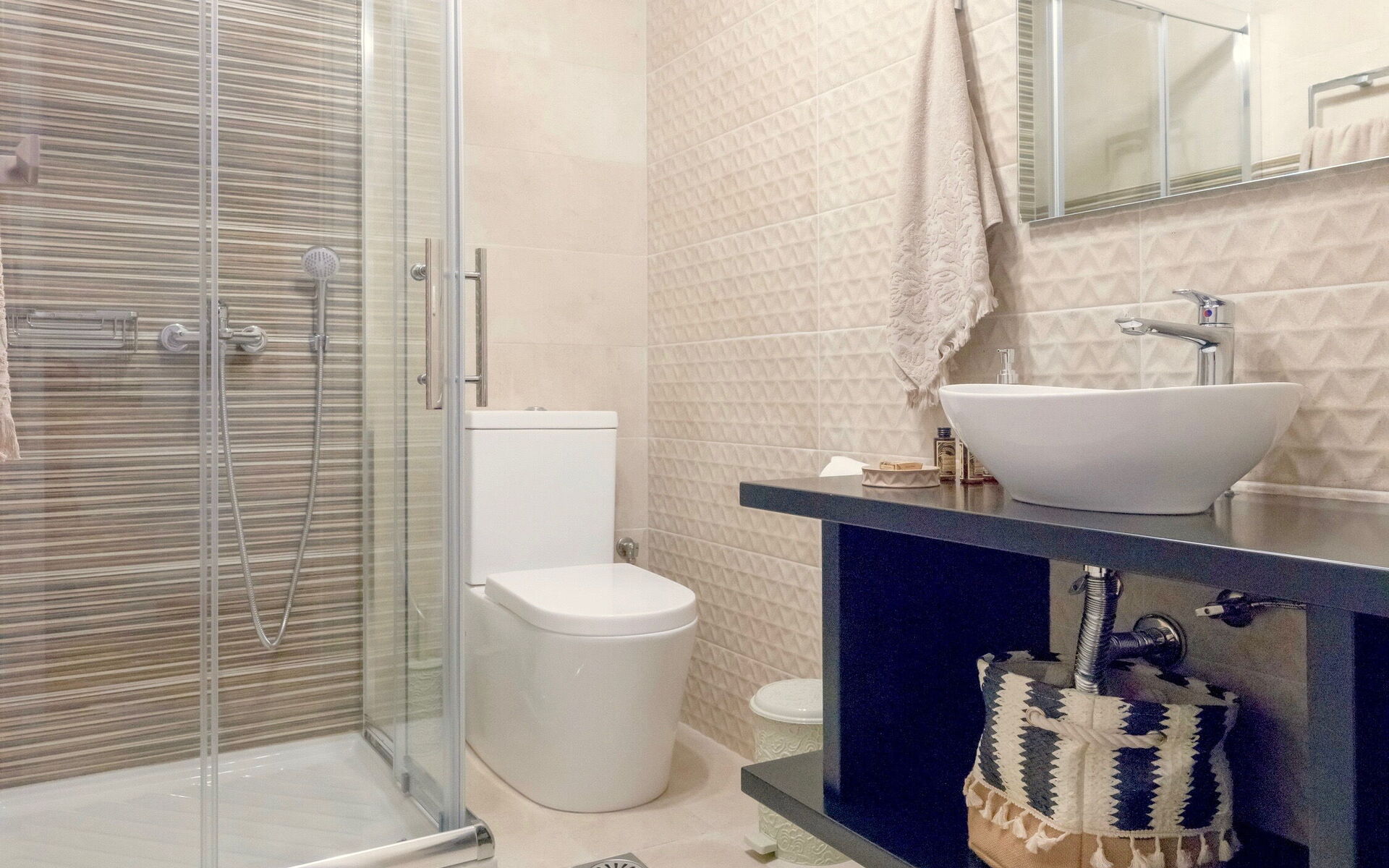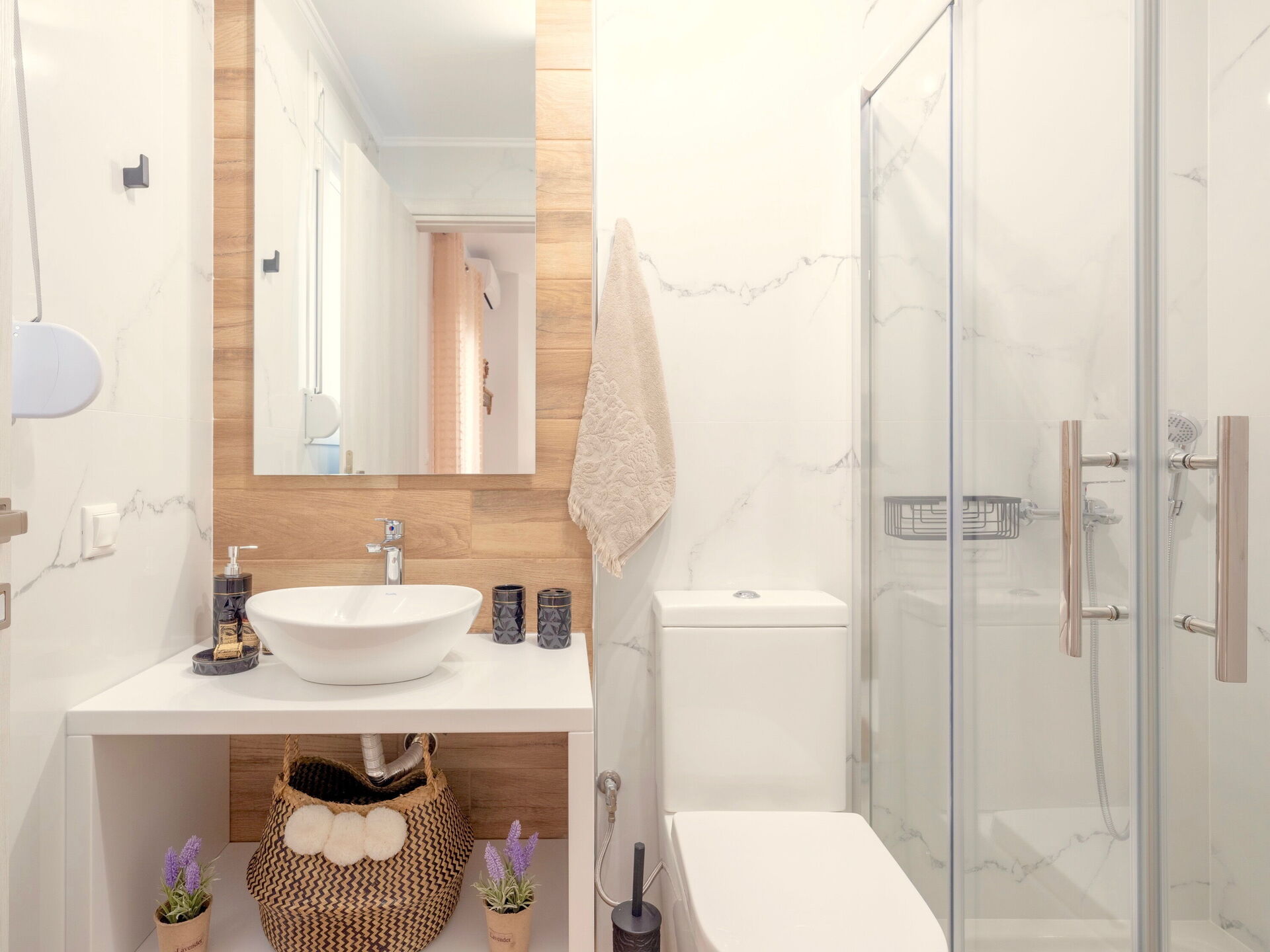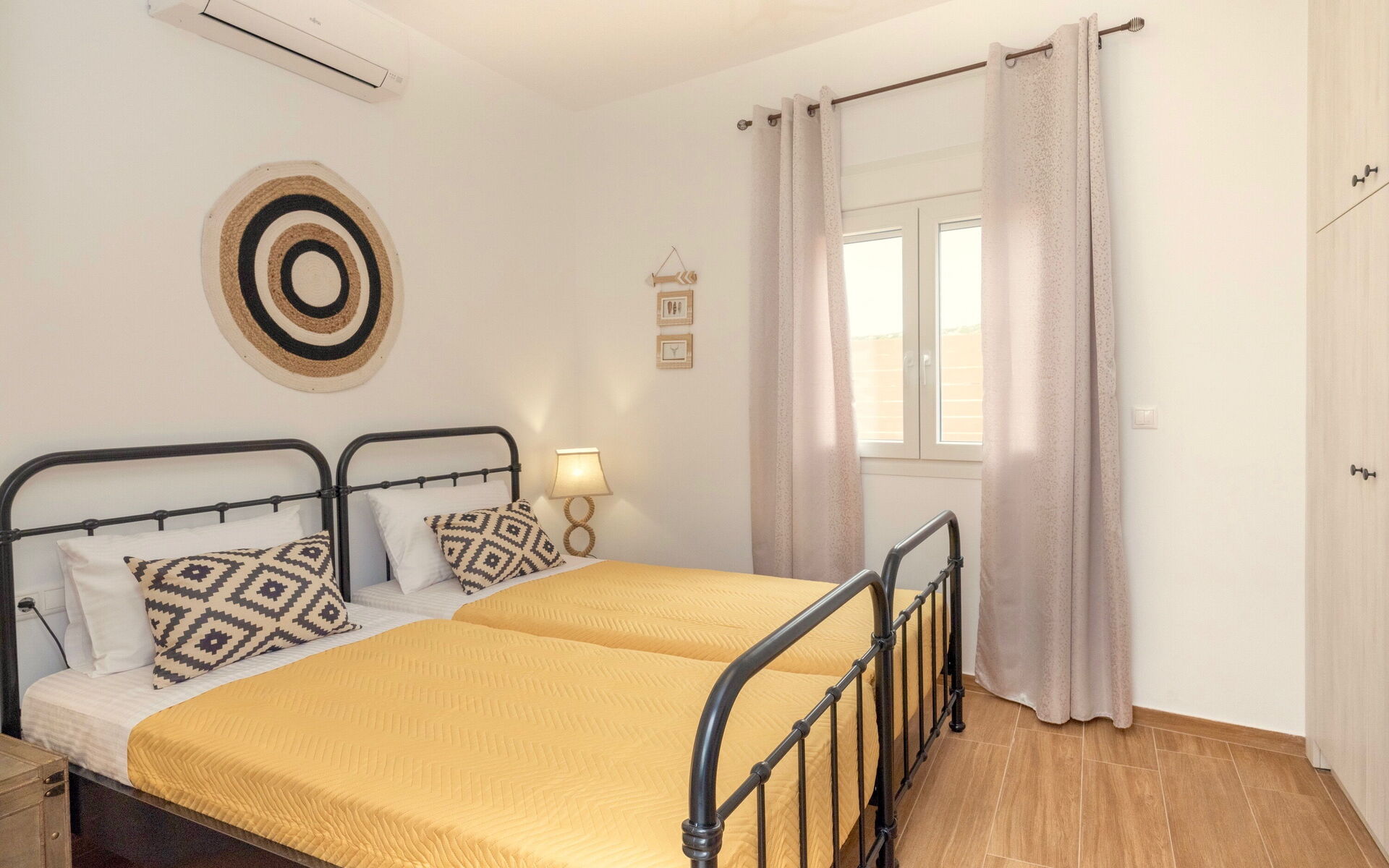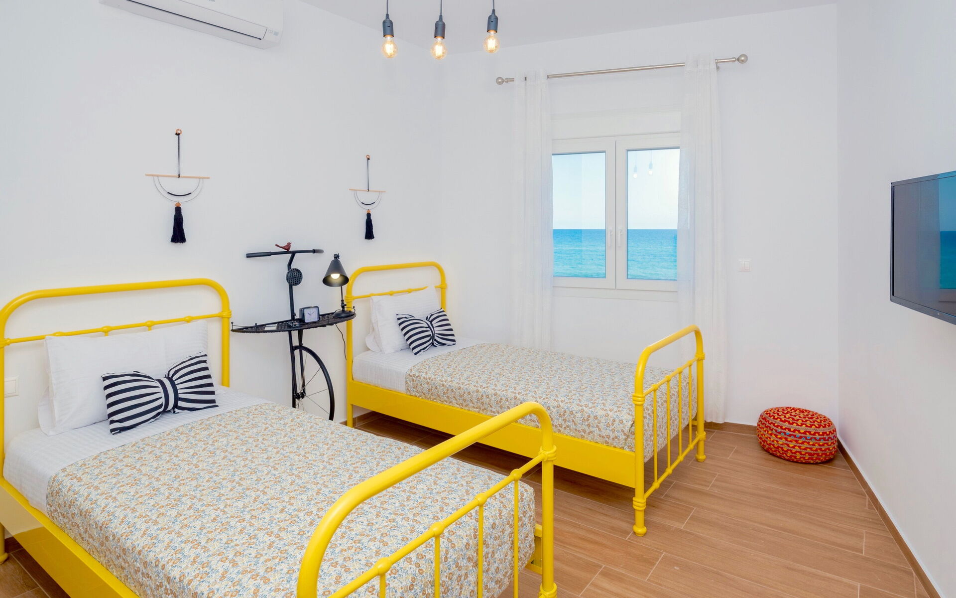 Slaapkamer met badkamer 6: twee eenpersoonsbedden, airconditioning, wastafel, toilet , douche, badkamer zonder raam.