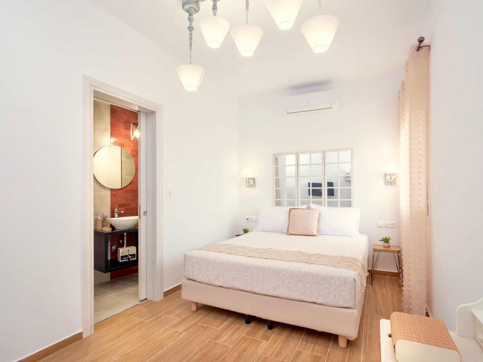 Slaapkamer met badkamer 5: tweepersoonsbed, airconditioning, wastafel, toilet , douche, badkamer zonder raam.