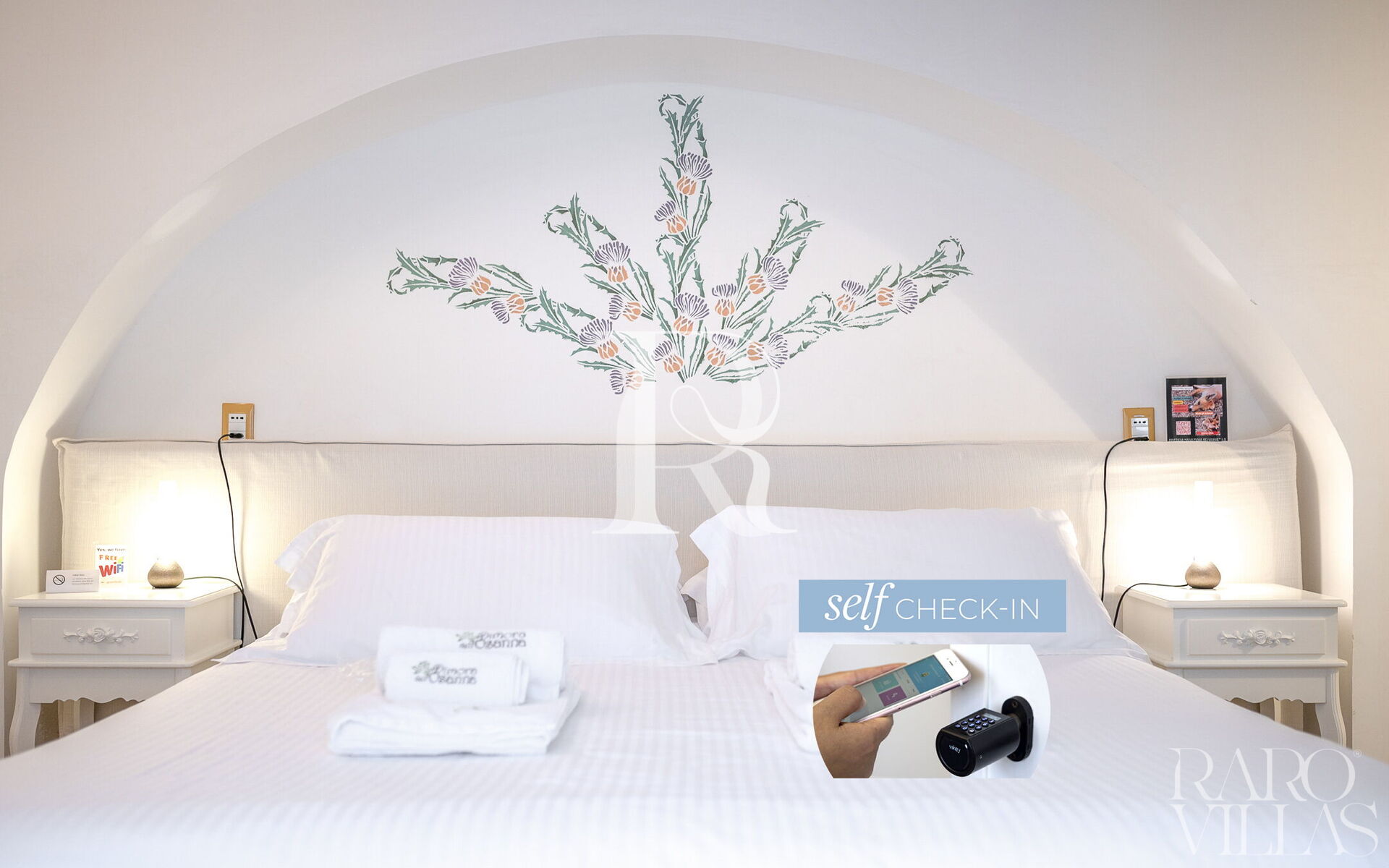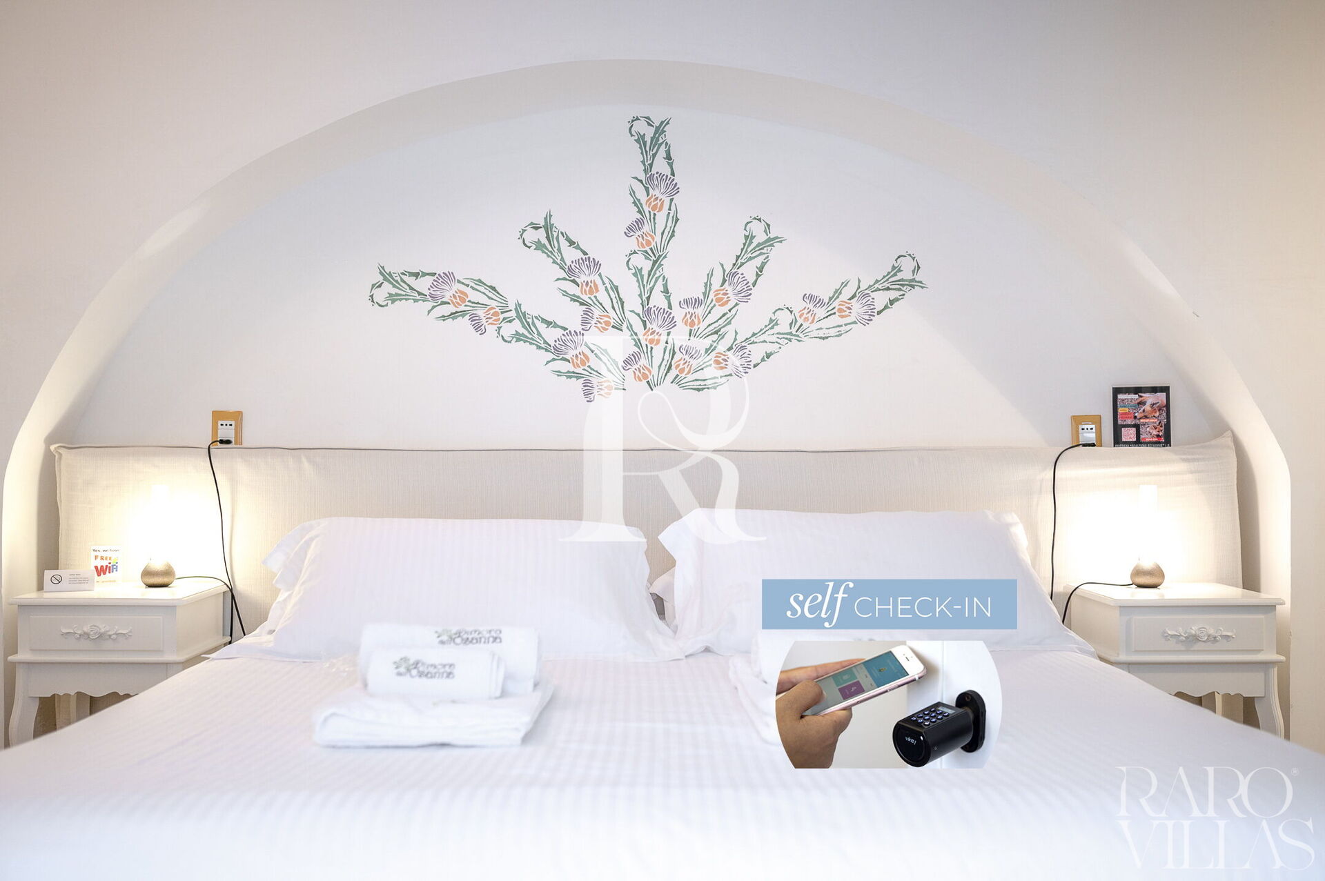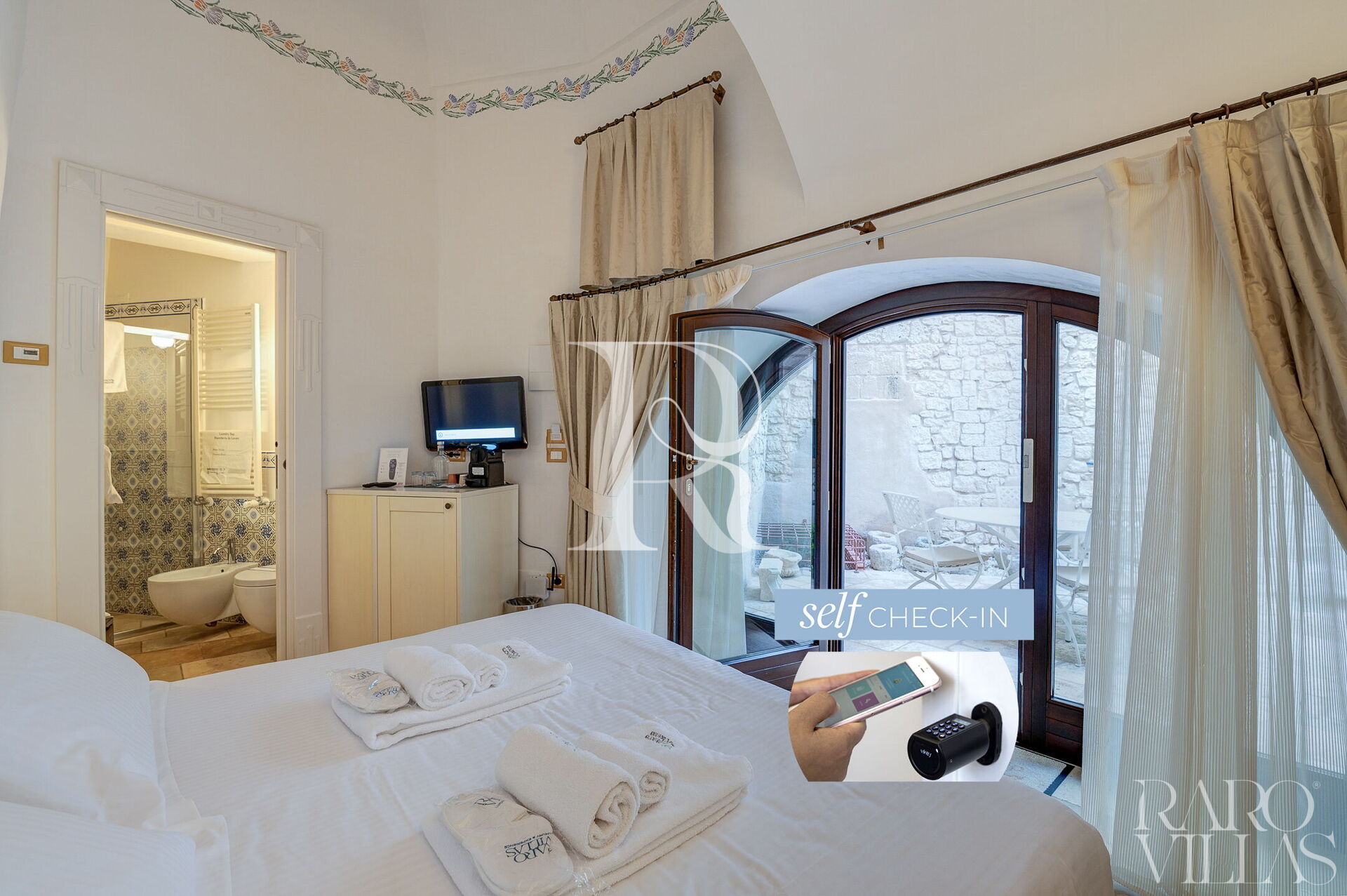 "Deluxe Cardo" is an elegant double bedroom with built-in bathroom with a large French window overlooking the internal courtyard.