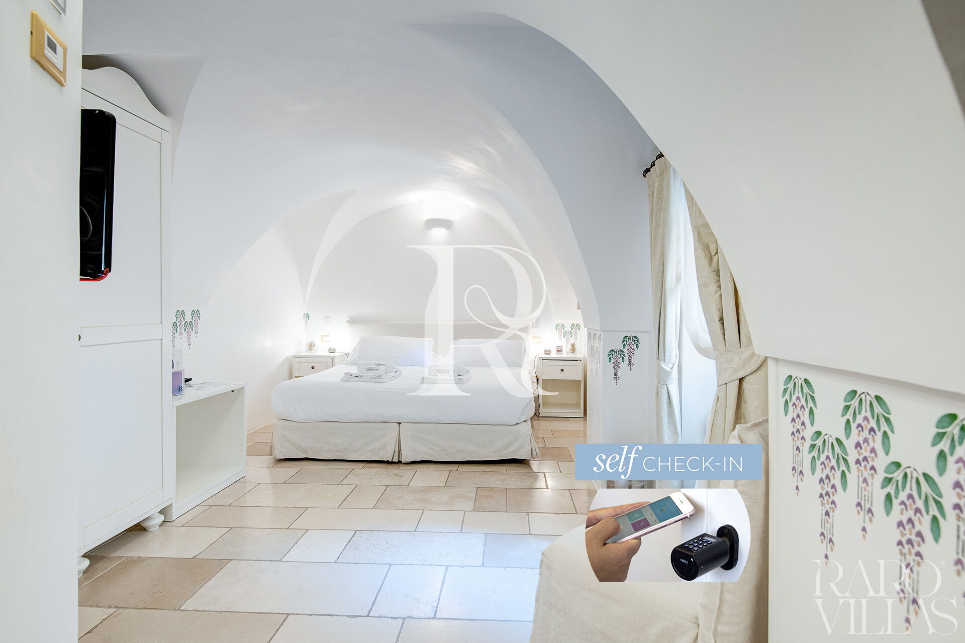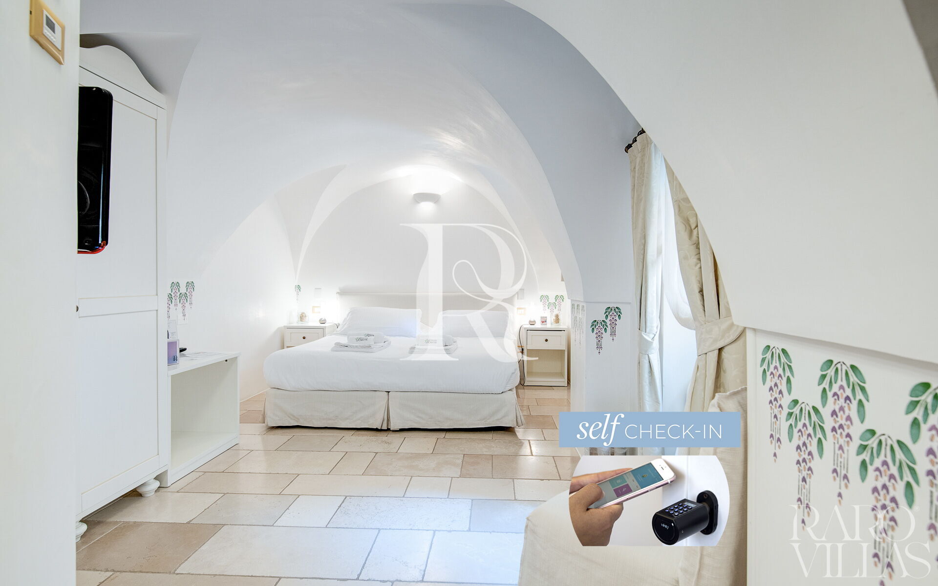 "Deluxe Glicine" is an elegant double bedroom with bathroom in masonry and stone vaults inside Dimora dell'Osanna.