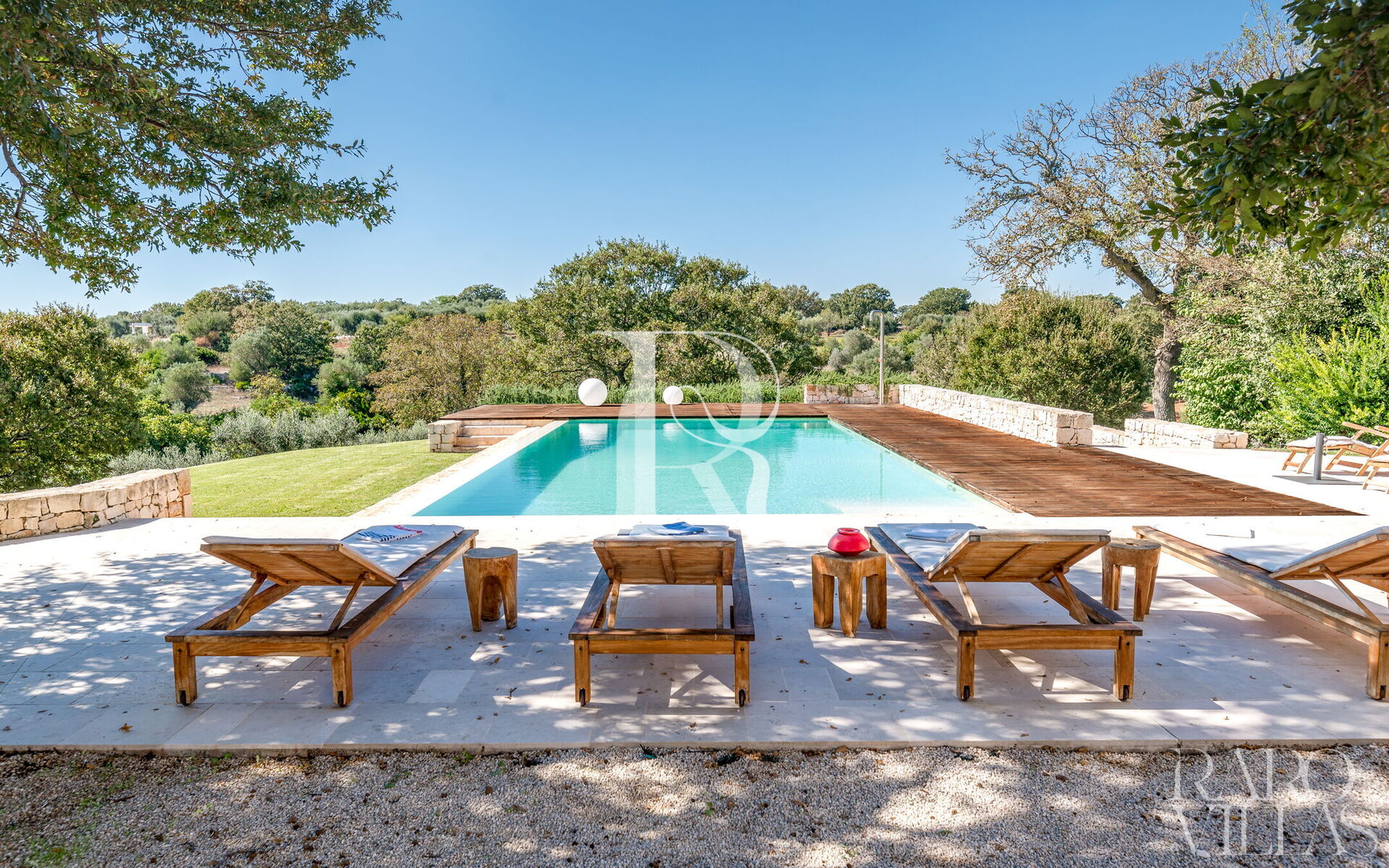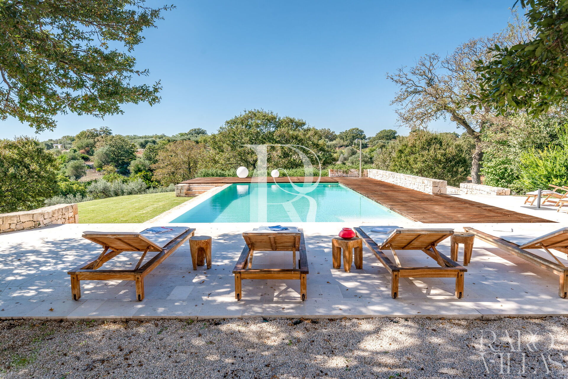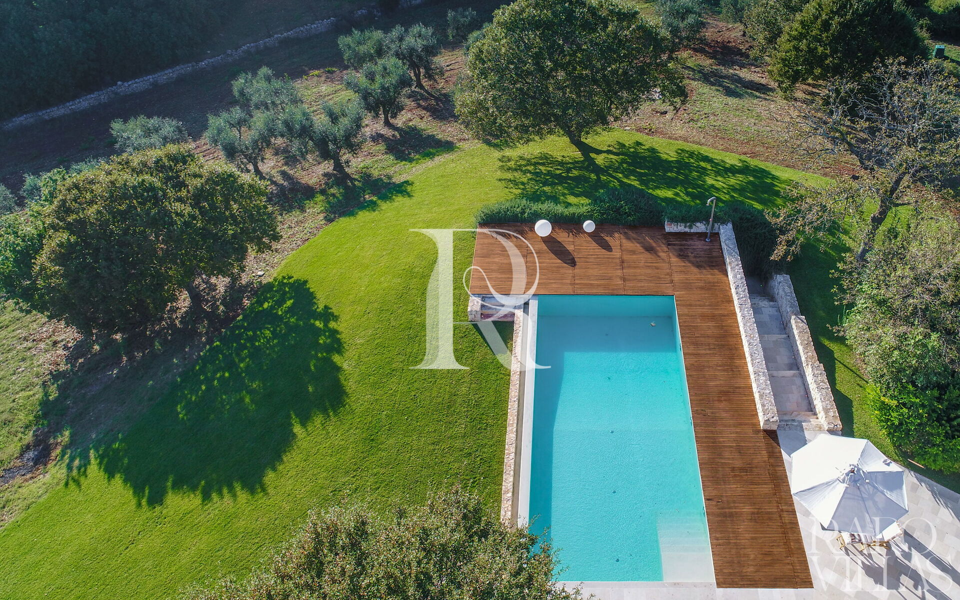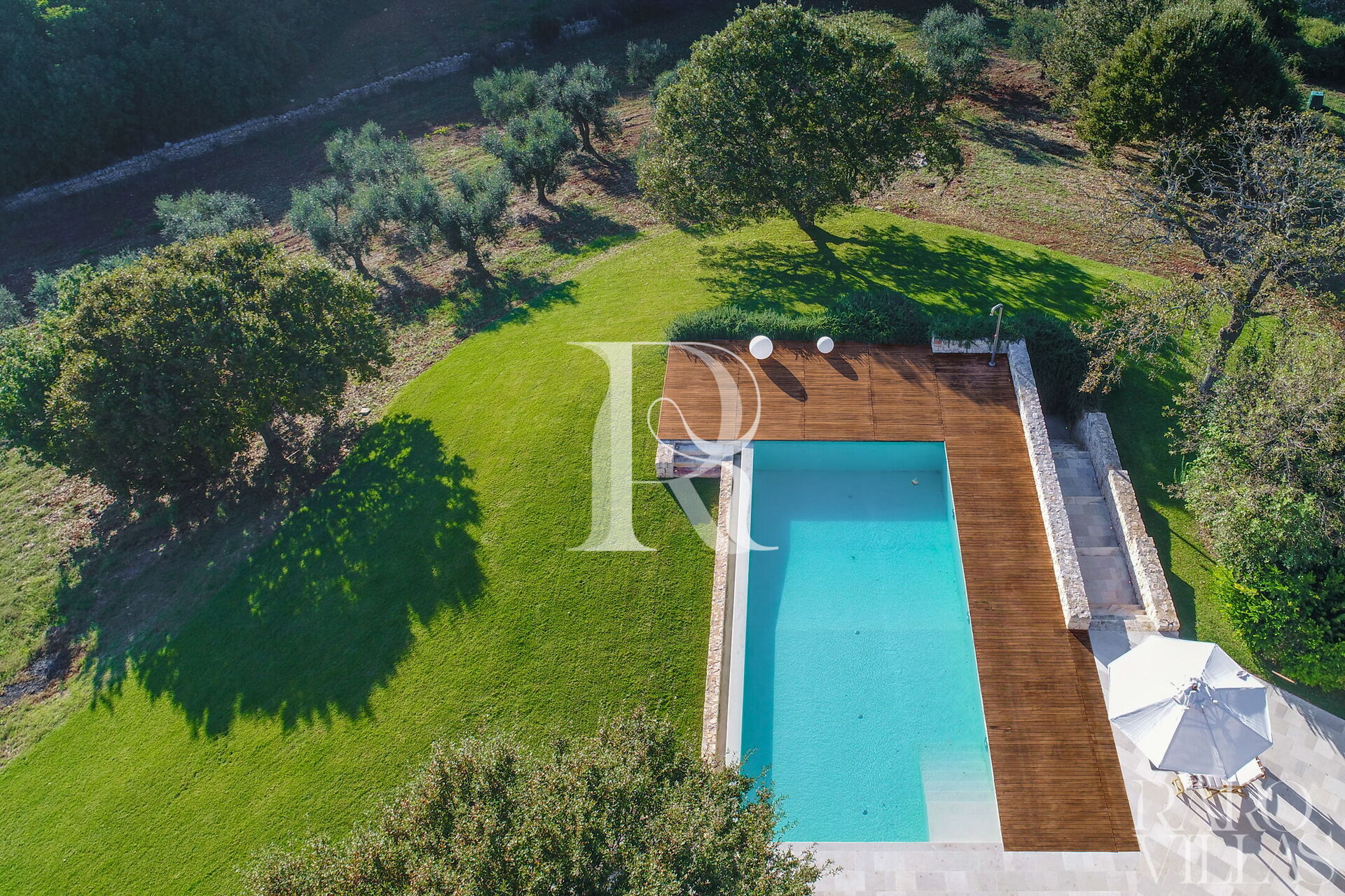Een luxe Trullo te huur die, dankzij zijn verhoogde ligging, de hele vallei domineert en zo een uniek uitzicht biedt op het platteland van Valle d'Itria. Het hele grote terrein is volledig omheind en omgeven door eiken- en olijfbomen. Binnen in de tuin loopt een Engels gazon langs de Trullo en het zwembad voor exclusief en privé gebruik van gasten.