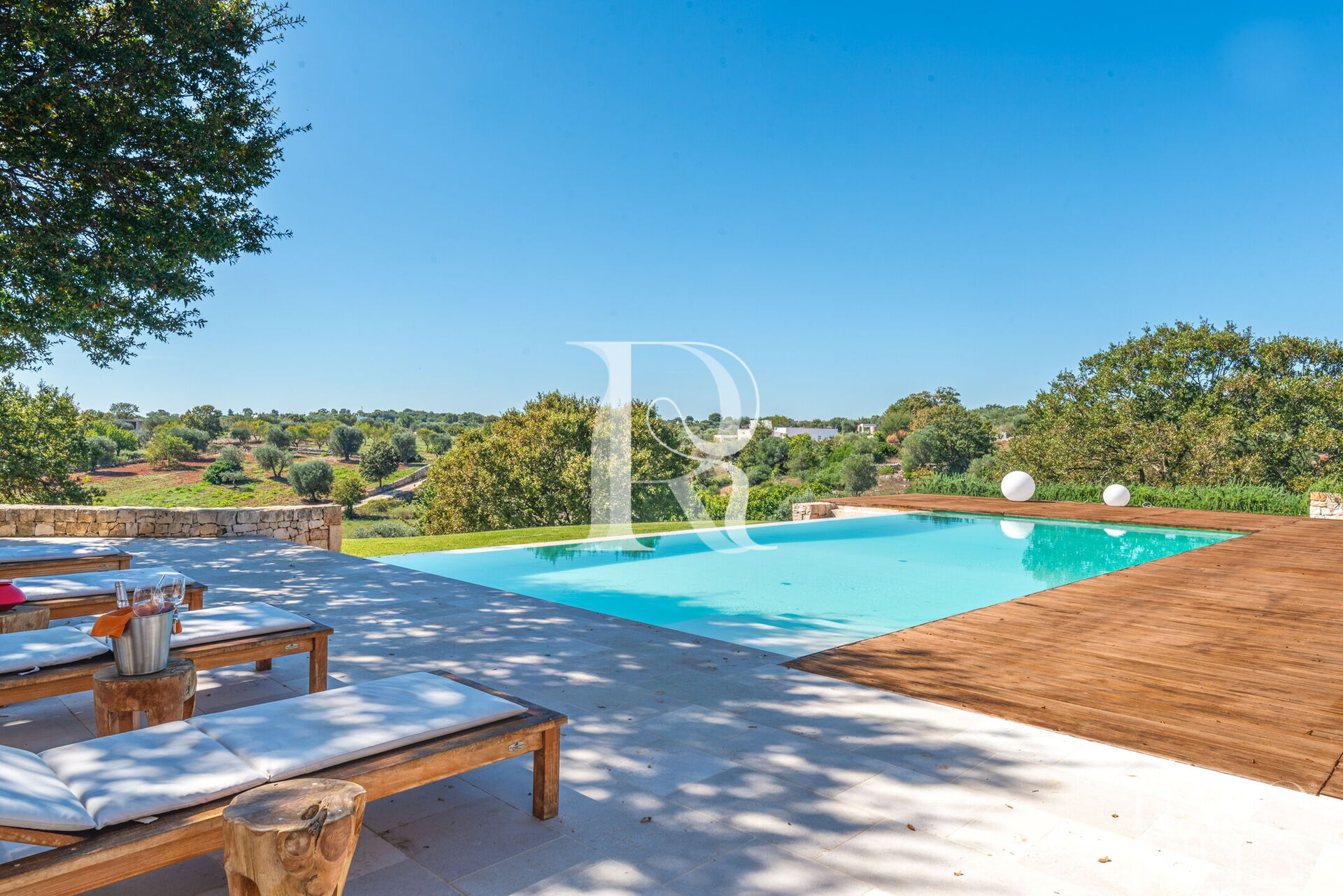 Het overloopzwembad, gelegen op een panoramische positie, is 12 x 6 m lang, is uitgerust met een zoutsterilisatiesysteem en is omgeven door een houten terras met ligstoelen. Het zwembad wordt gecompleteerd door een comfortabele buitendouche.