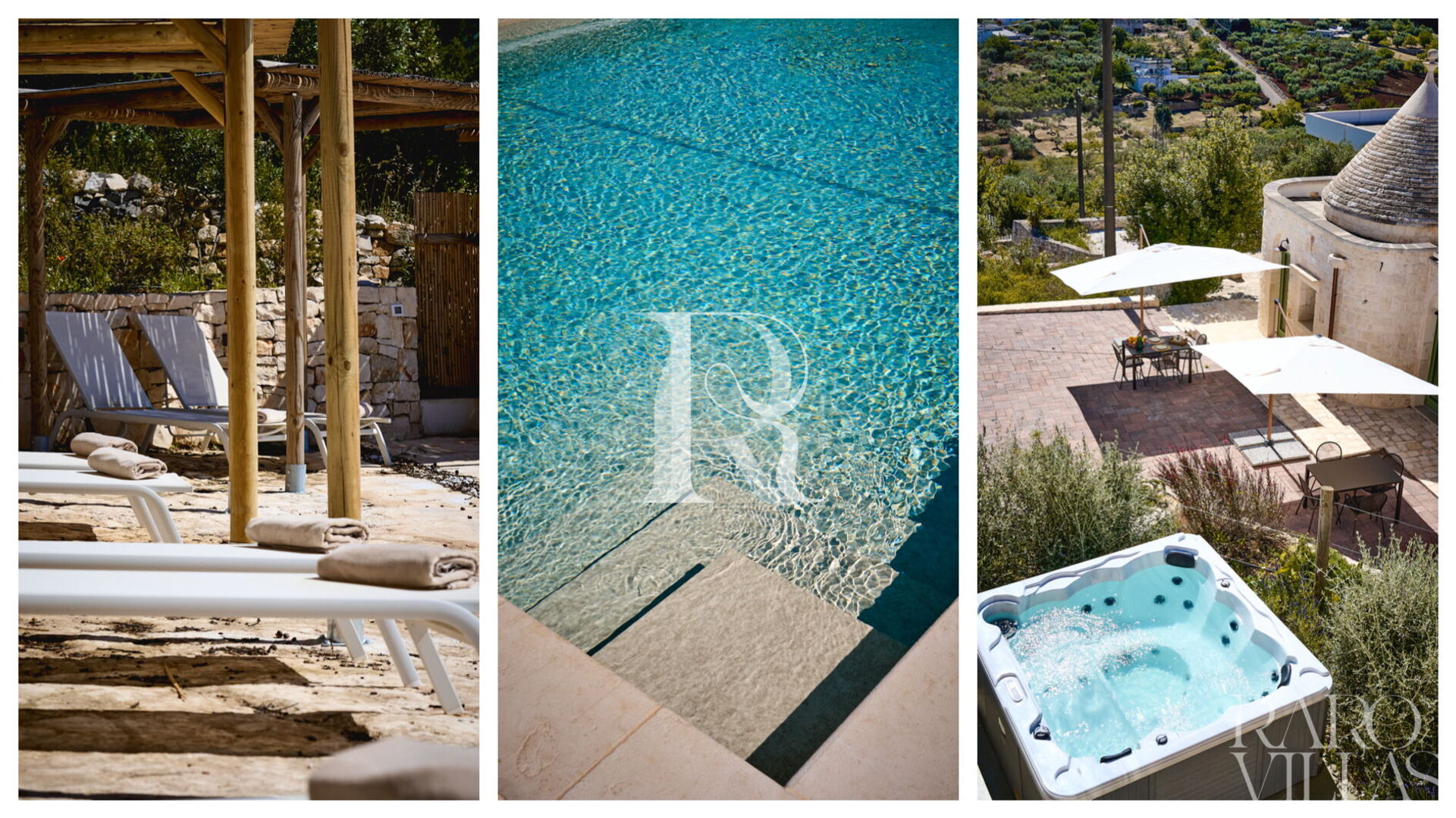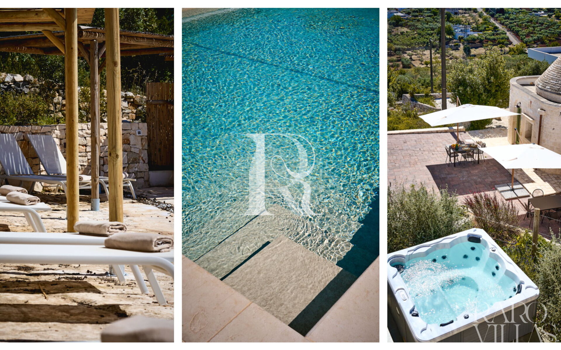 Gelegen in een verzorgde tuin van 500 m² en omgeven door de typische droogstenen muren, is de buitenruimte ontworpen voor de ultieme Apulische levensstijl. Het middelpunt is het panoramische zwembad van 40 m² (10 x 5 m), geopend van 27 maart tot 31 oktober, omringd door 10 ligbedden en schaduwrijke pergola's. Naast het zwembad biedt de 6-persoons vierkante Jacuzzi een professionele hydromassage; omdat deze verwarmd kan worden (€1/kW), is het ook in de koelere maanden heerlijk ontspannen.